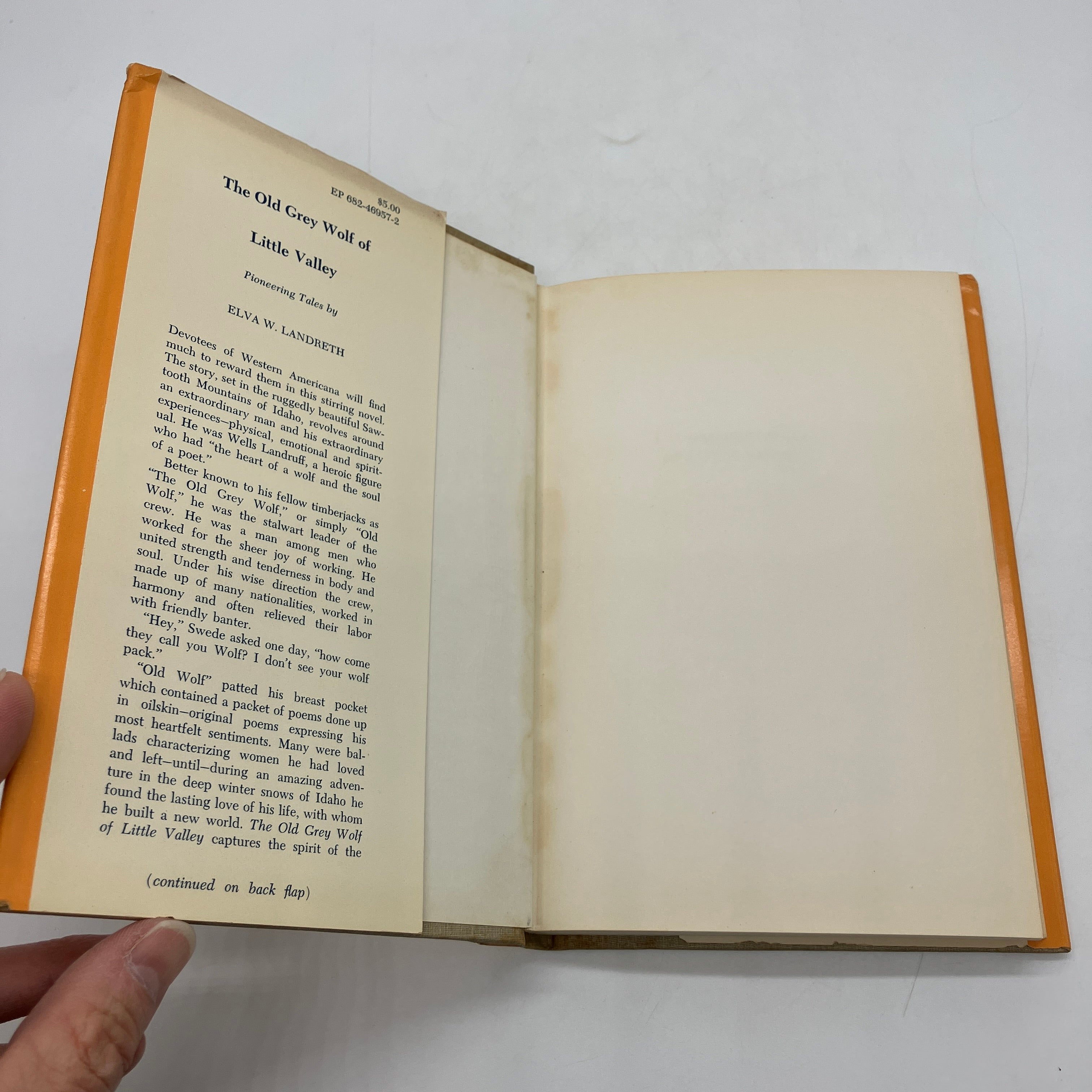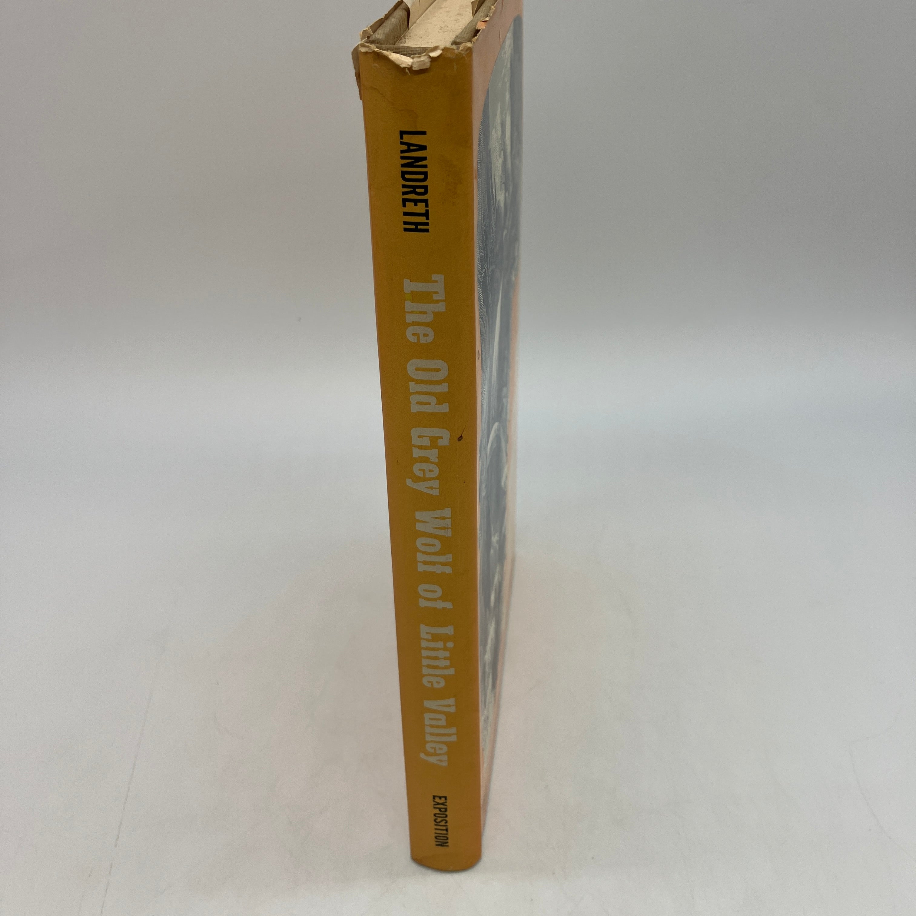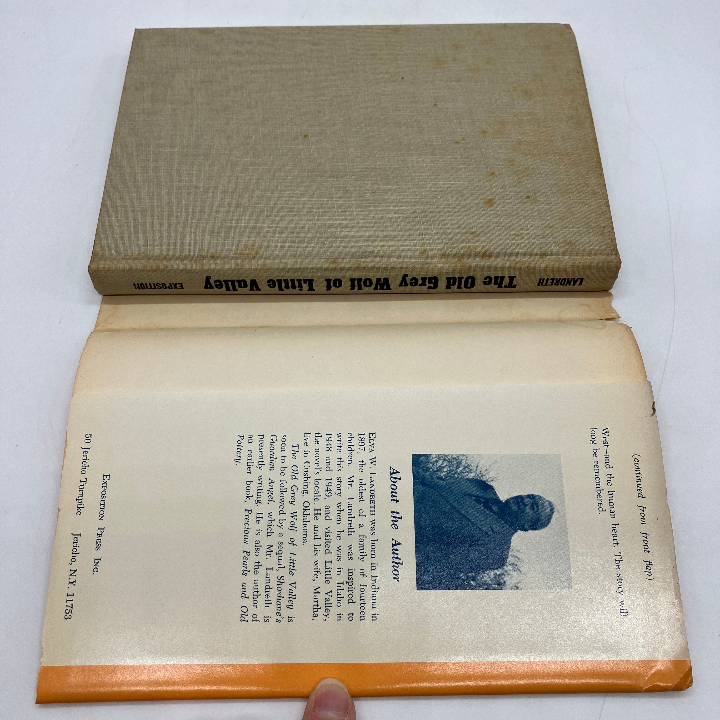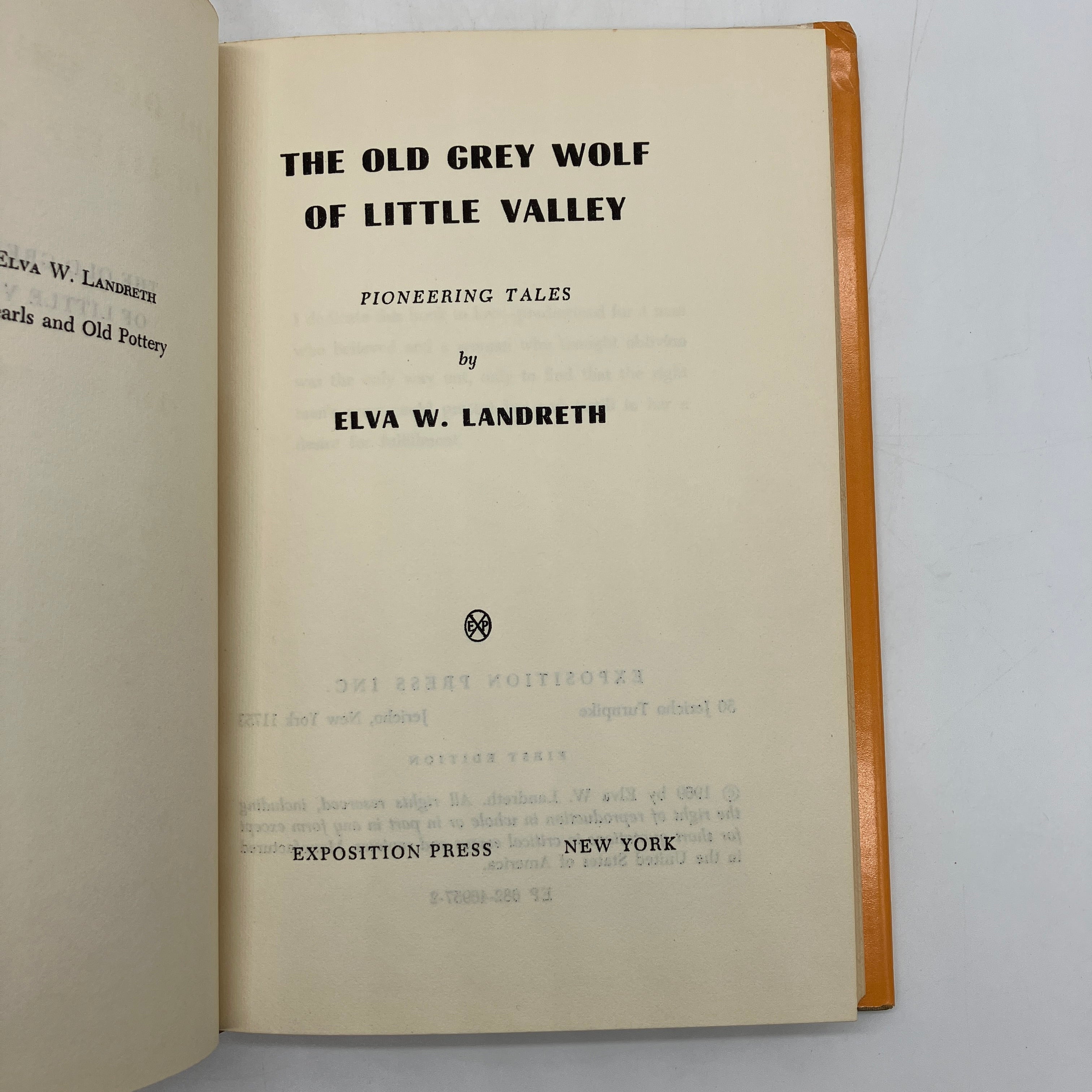 Exposition Press, 1969. First edition cloth bound hardcover with dust jacket of The Old Grey Wolf of Little Valley: Pioneering Tales by Elva Landreth.
