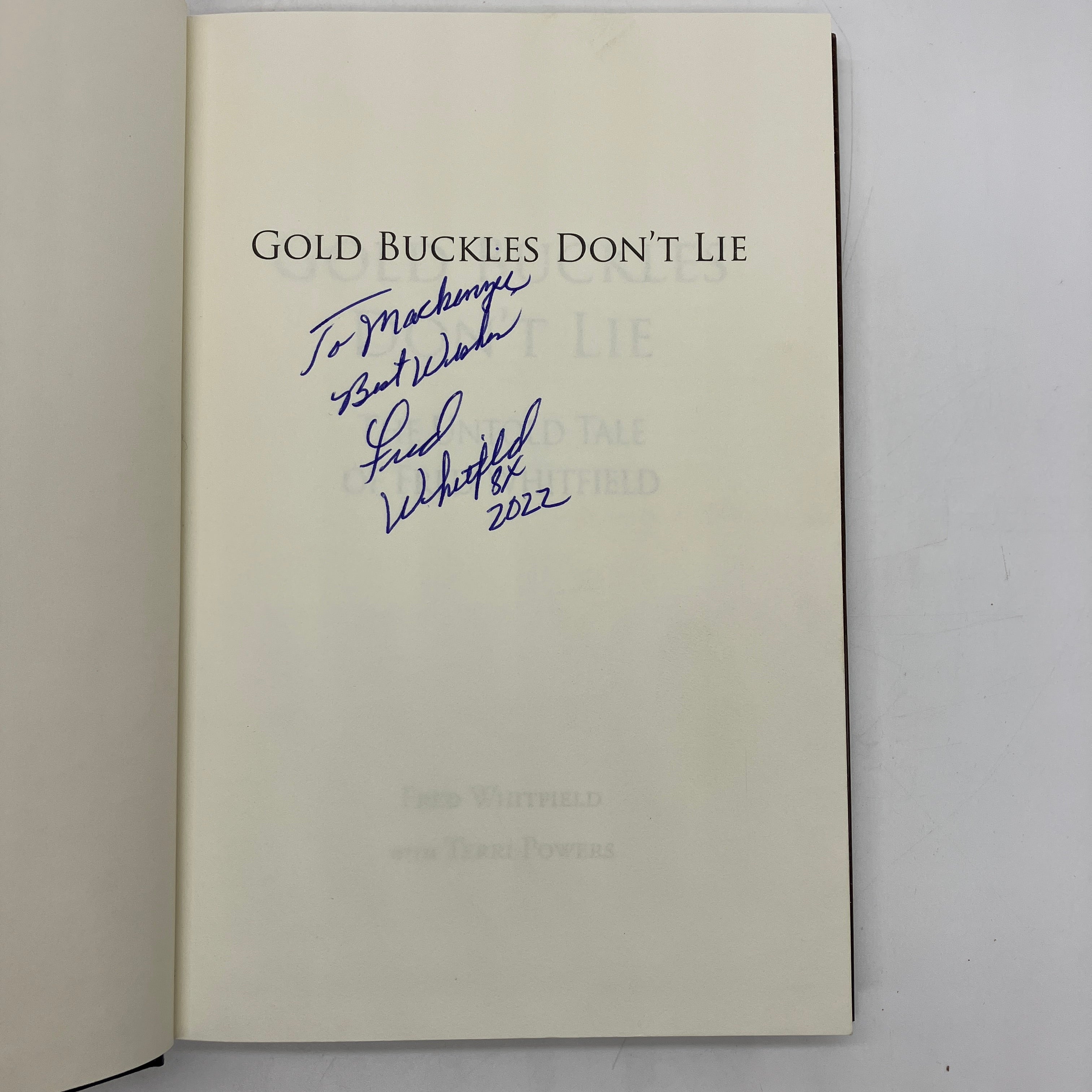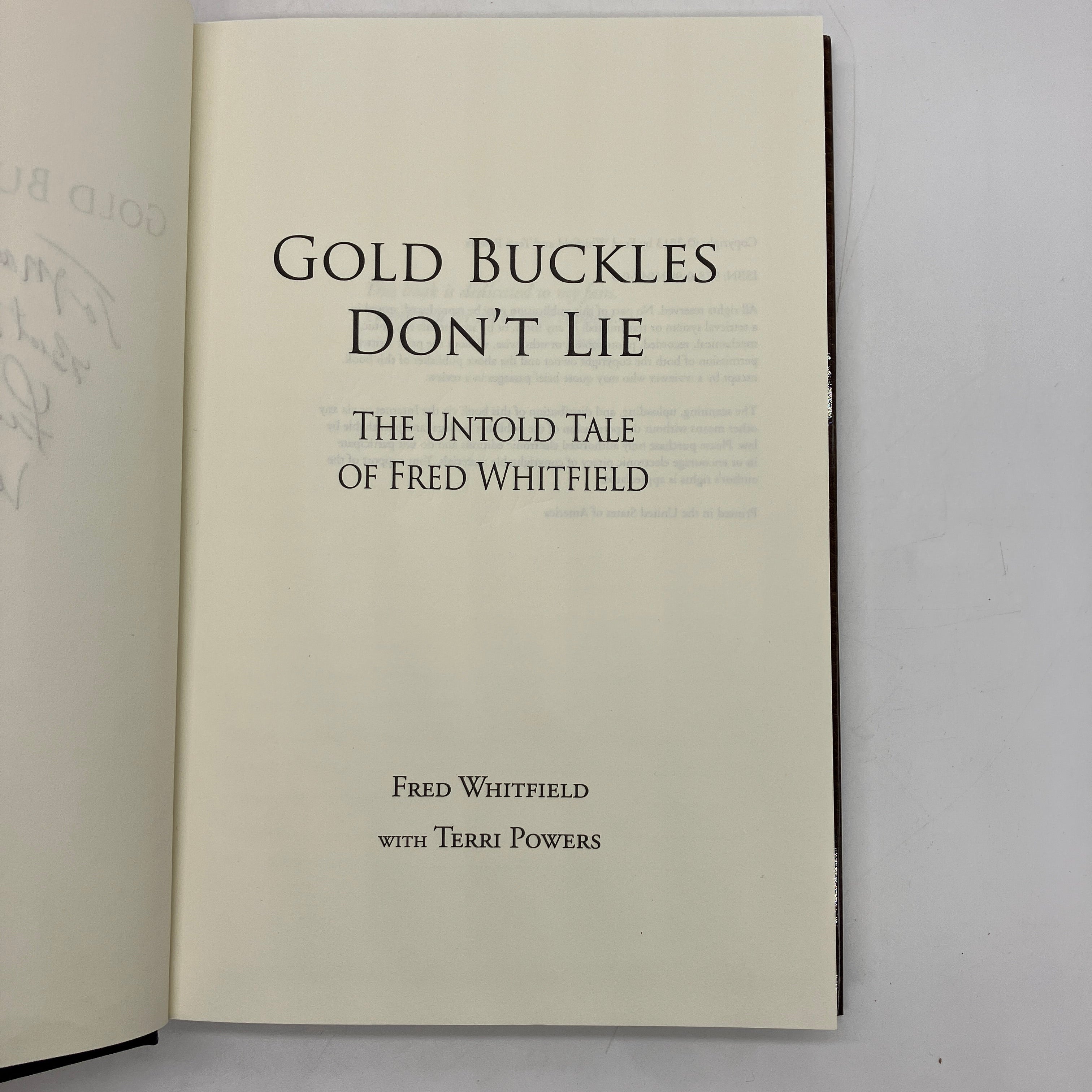 Fred Whitfield & Terri Powers, 2013. Signed first edition cloth bound hardcover with dust jacket of Gold Buckles Don't Lie: The Untold Tale of Fred Whitfield by Fred Whitfield.