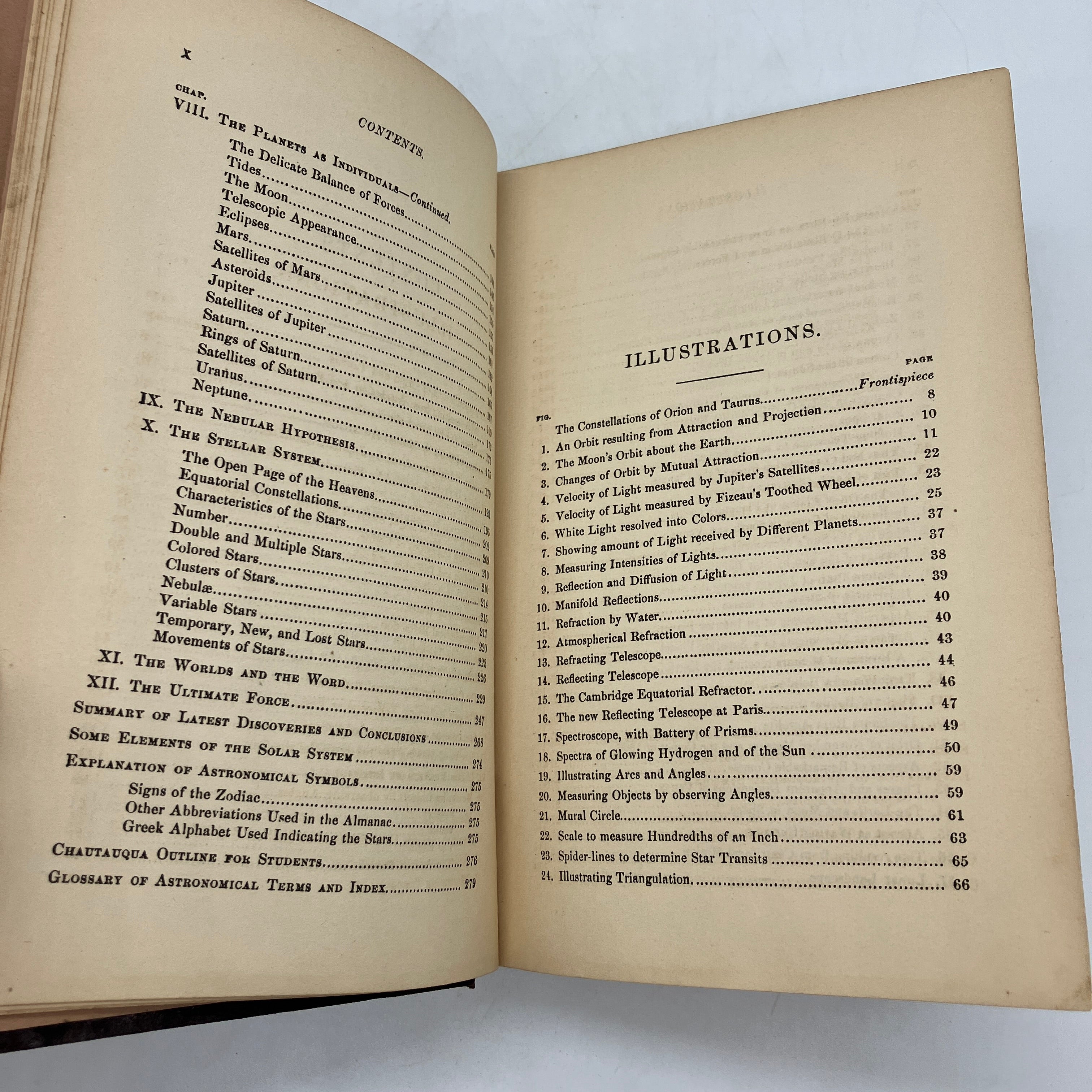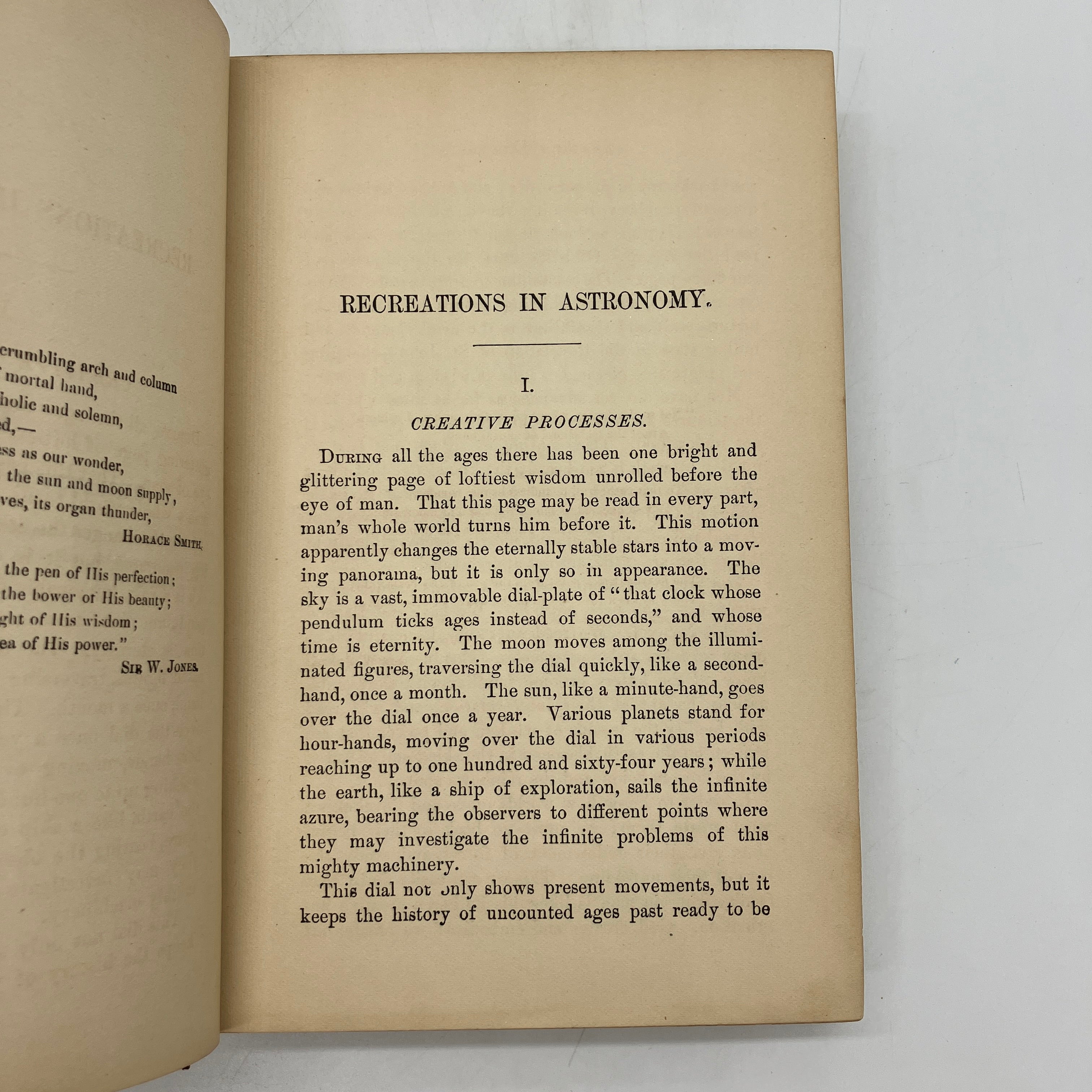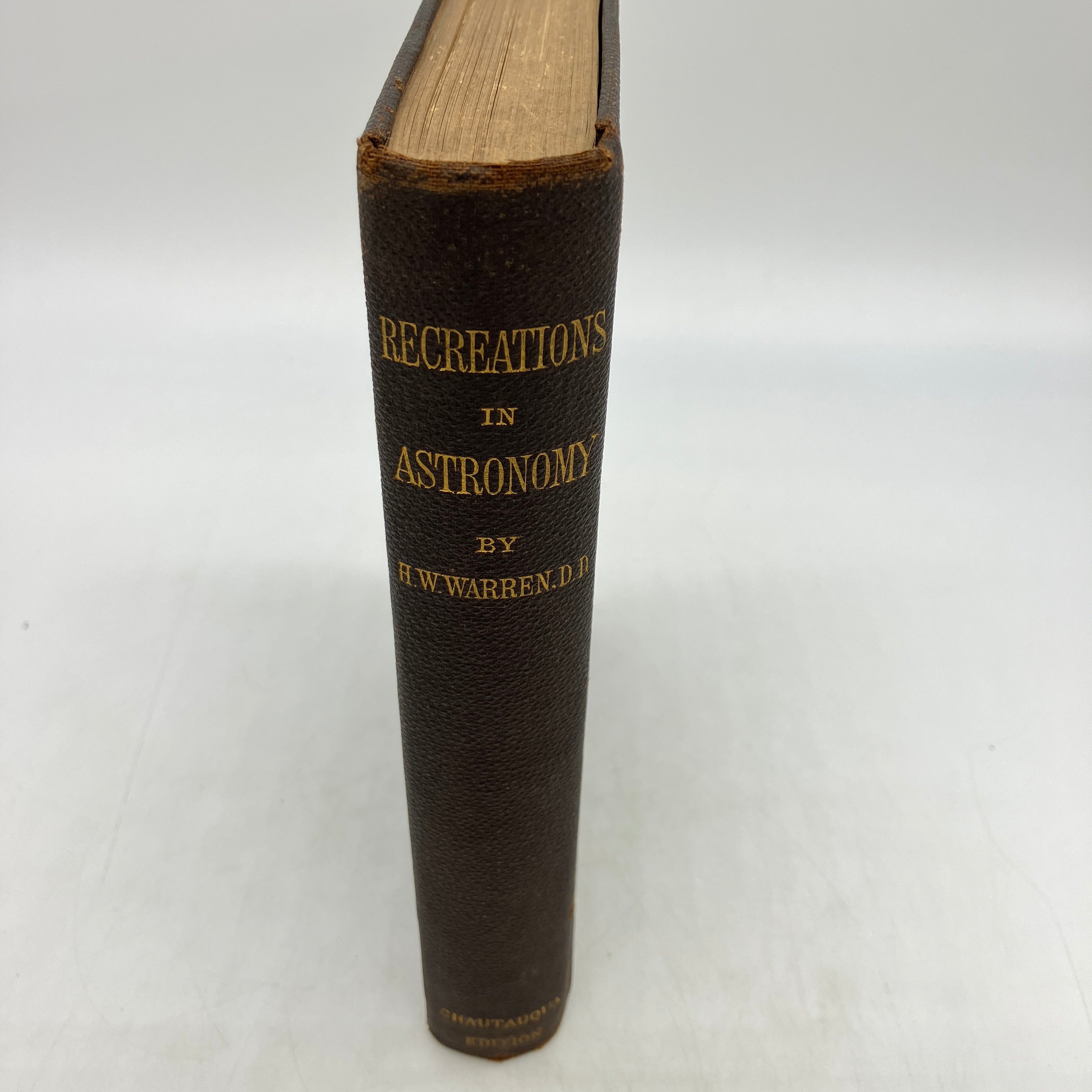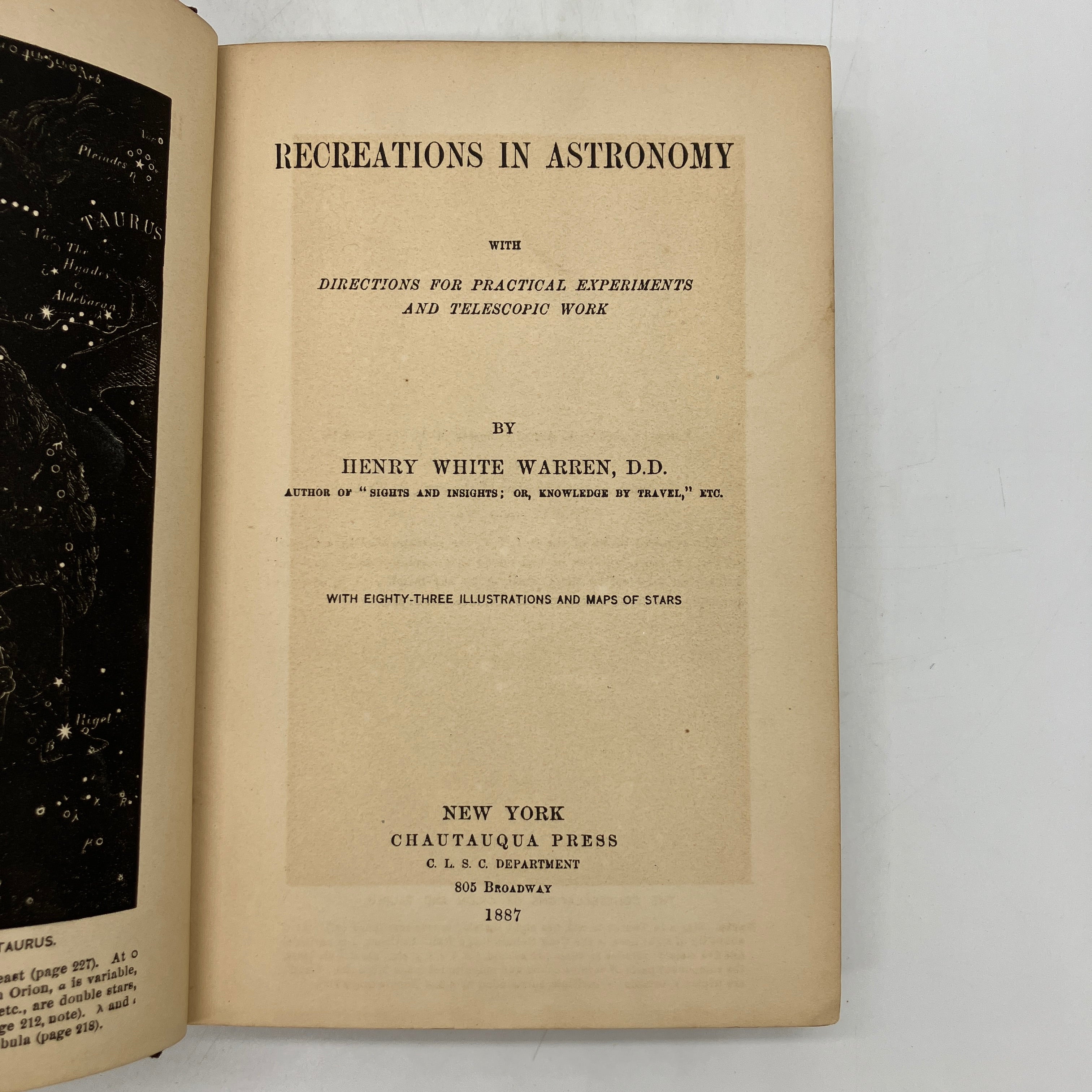 Chautauqua Press, 1887. Antiquarian cloth bound hardcover of Recreations in Astronomy With Directions for Practical Experiments and Telescopic Work by Henry White Warren.