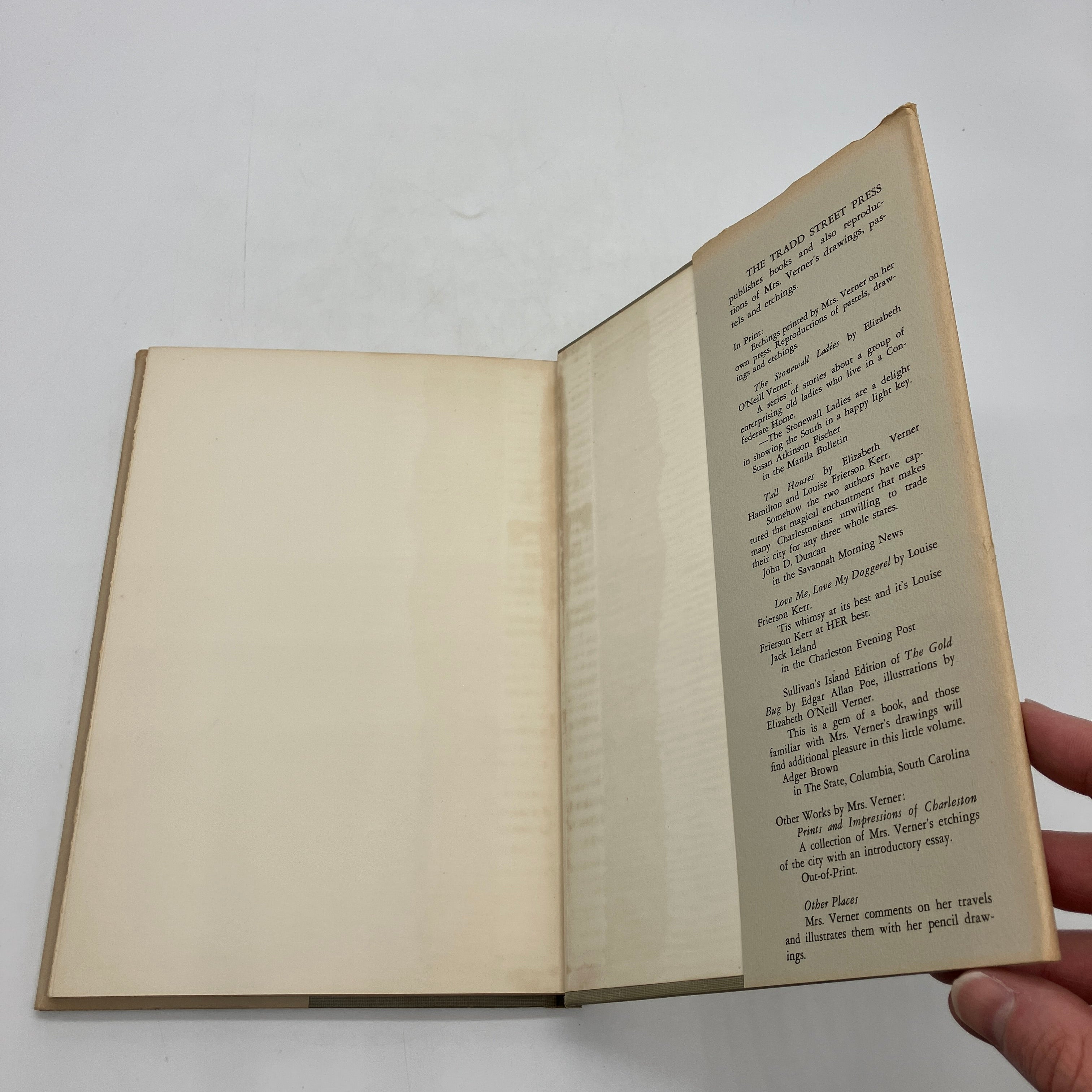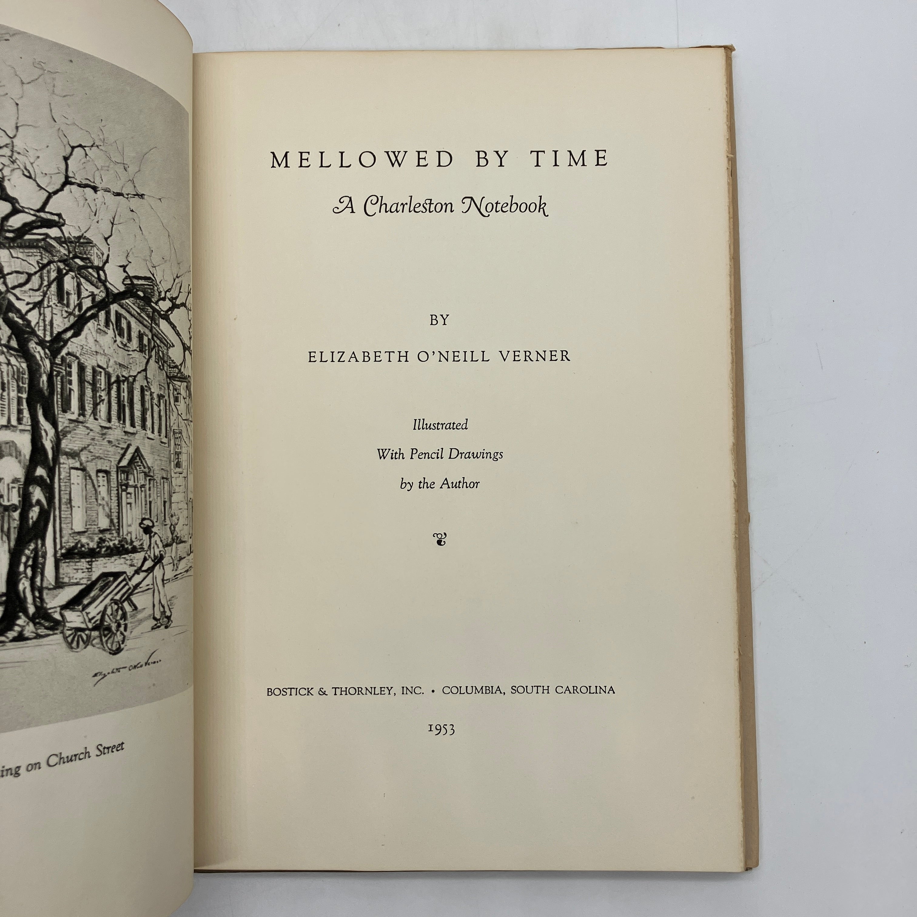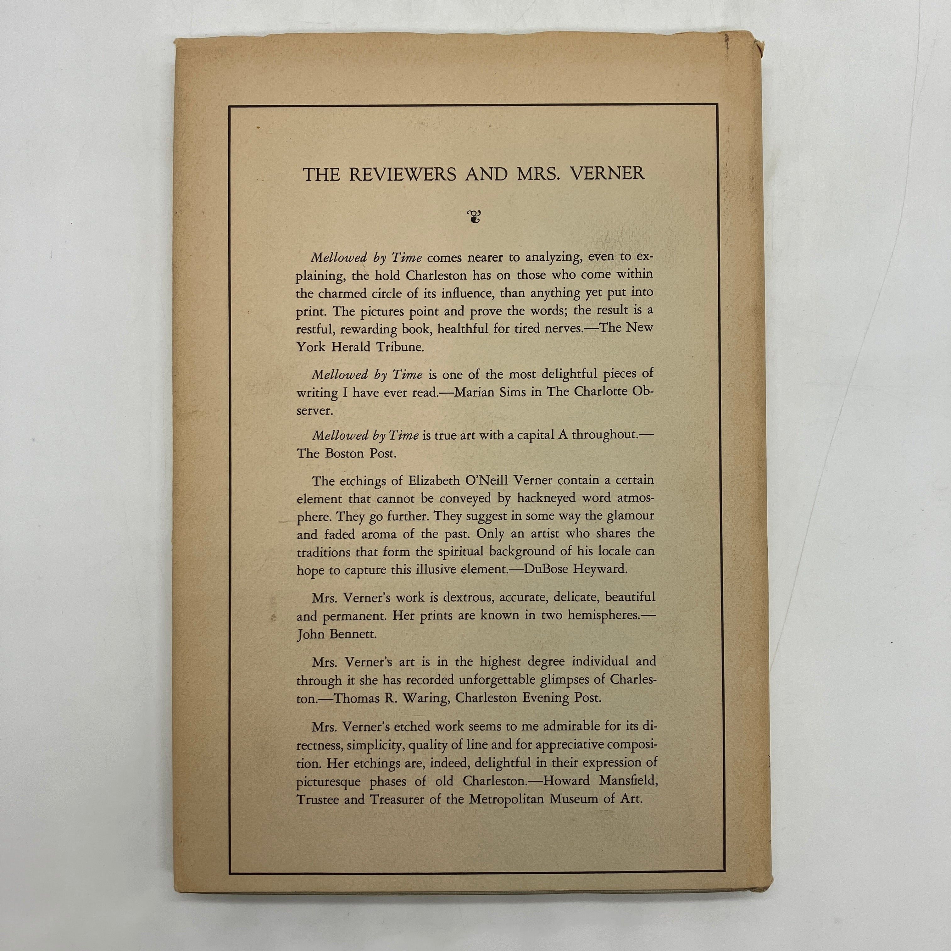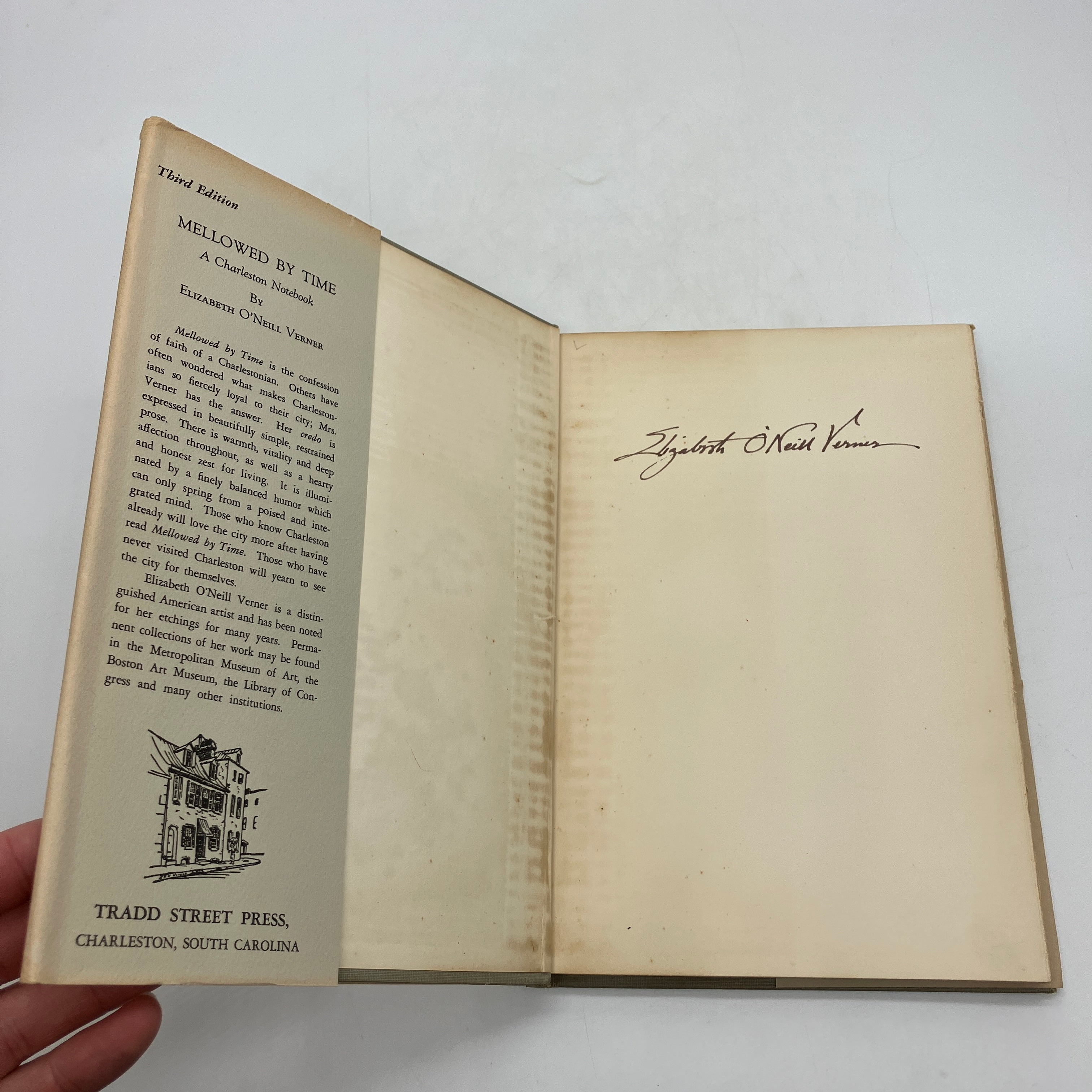 Tradd Street Press, 1953. Signed cloth bound hardcover with dust jacket of Mellowed by Time: A Charleston Notebook by Elizabeth O'Neill Verner.