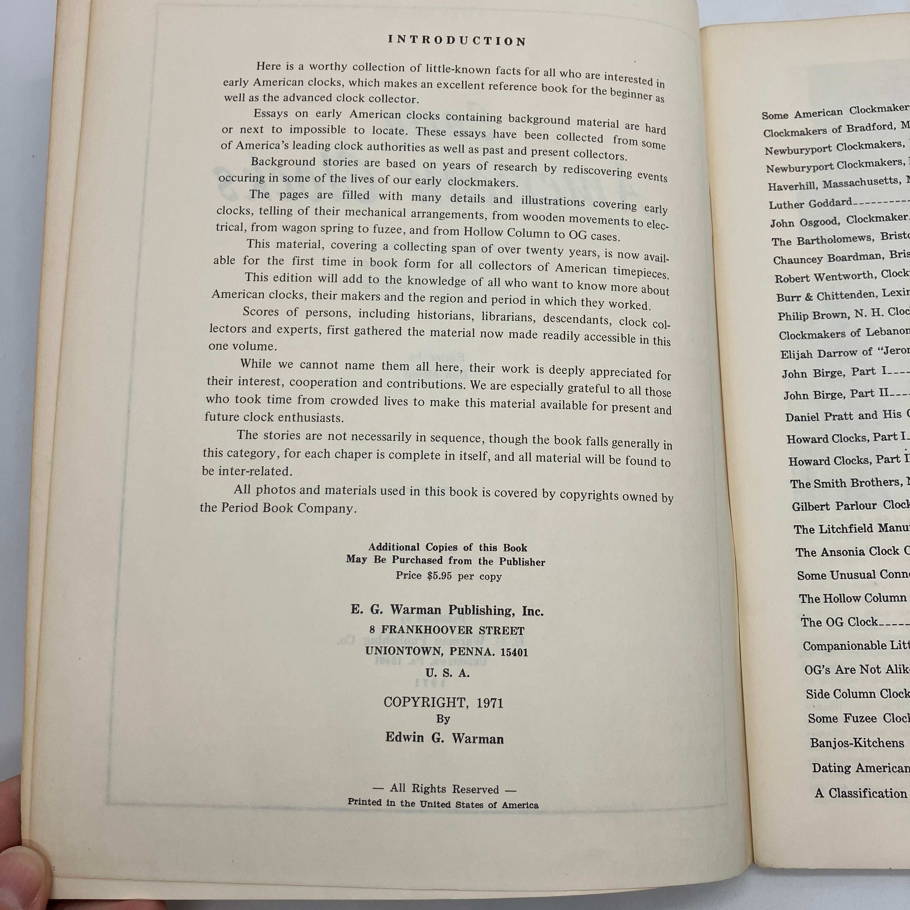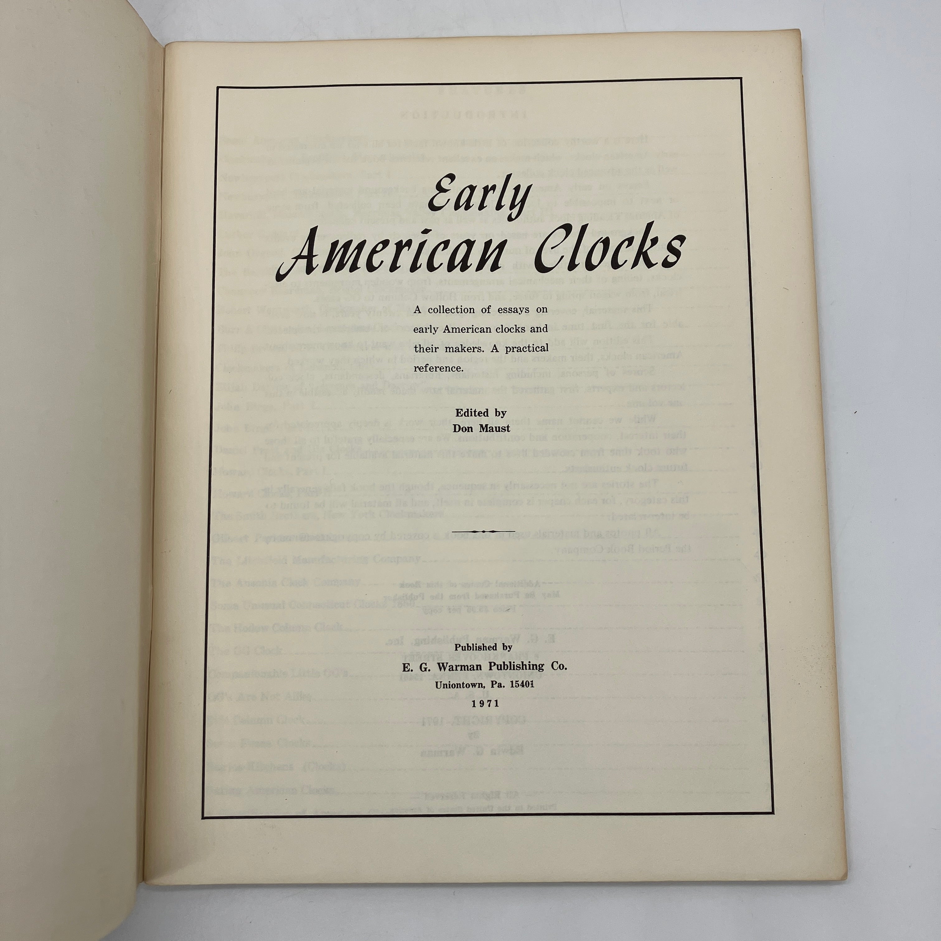 E. G. Warman Publishing, 1971. Staple-bound booklet of Early American Clocks: A Collection of Essays on Early American Clocks and Their Makers by Don Maust.