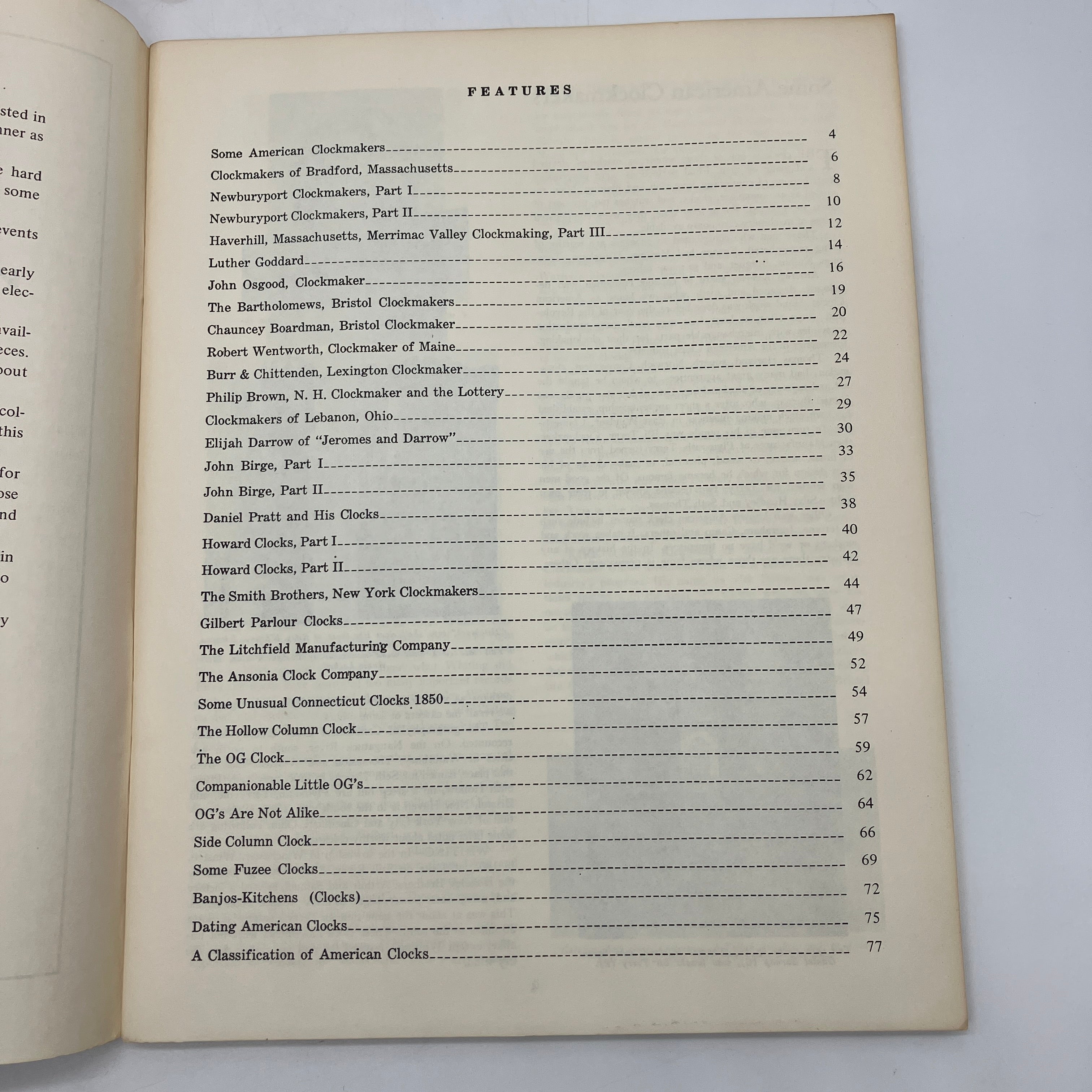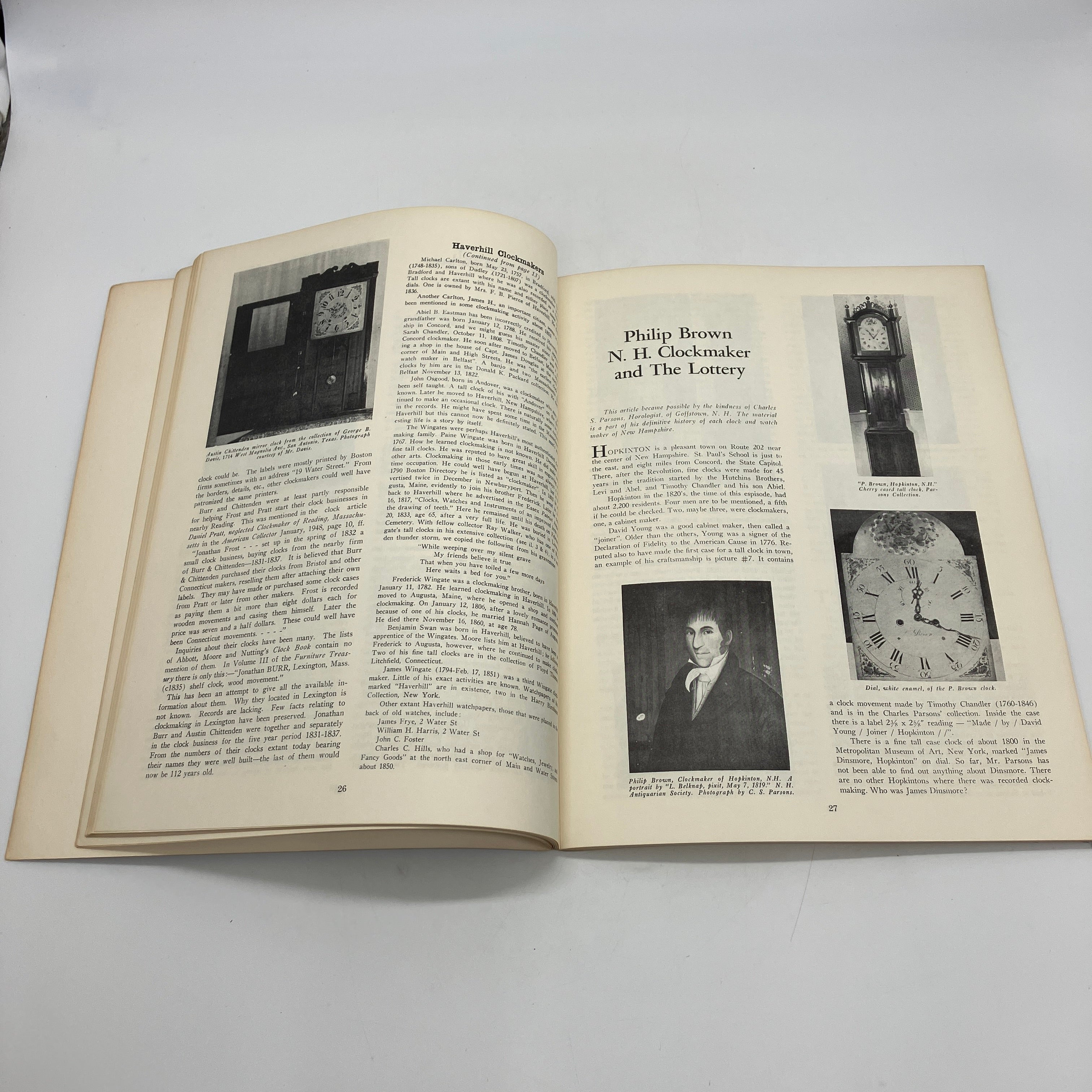 33 essays on early American clocks and clockmakers with numerous black and white photographs.