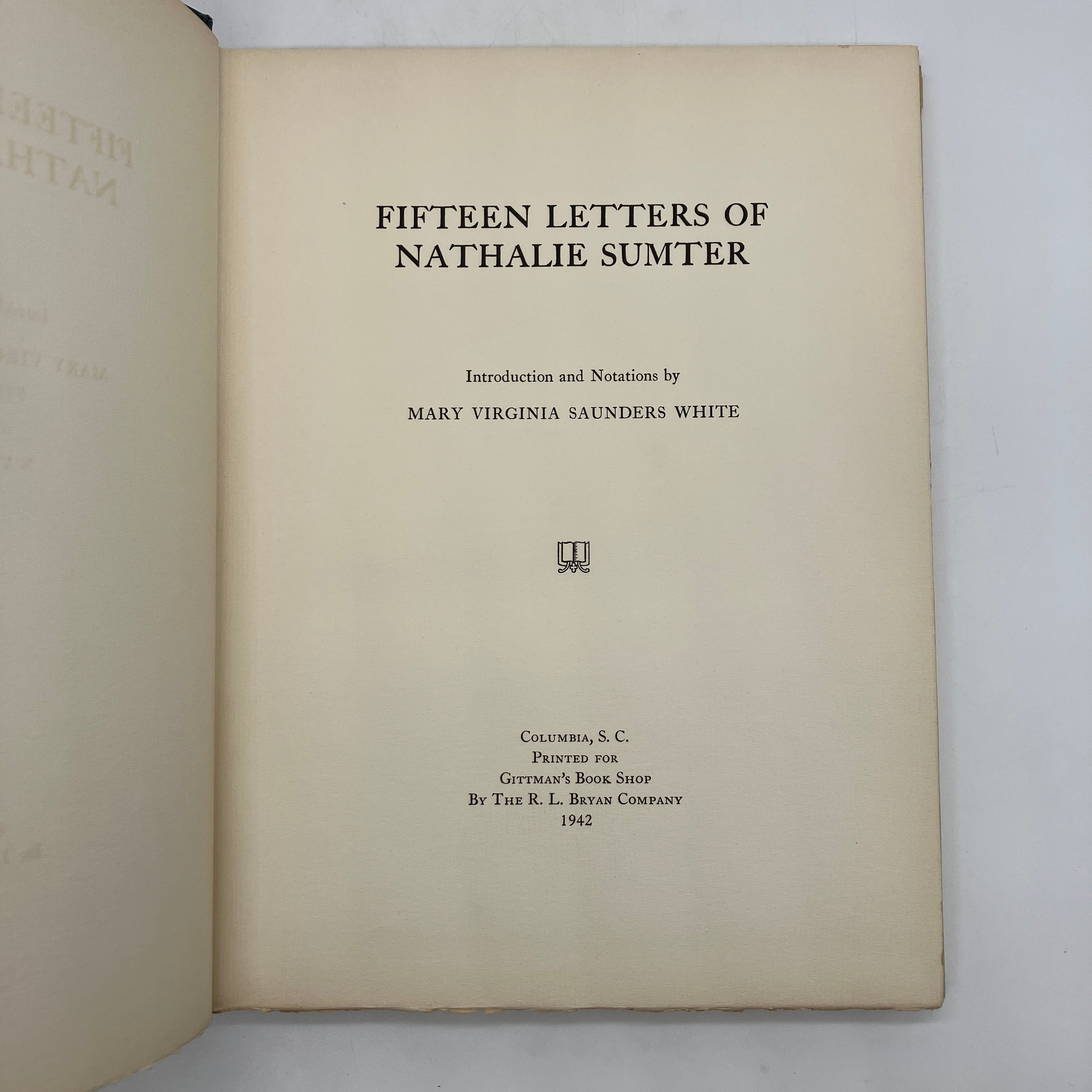 Printed for Gittman's Book Shop by the R.L. Bryan Company, 1942. Signed limited edition hardcover with dust jacket of Fifteen Letters of Nathalie Sumter by Mary Virginia Saunders White.