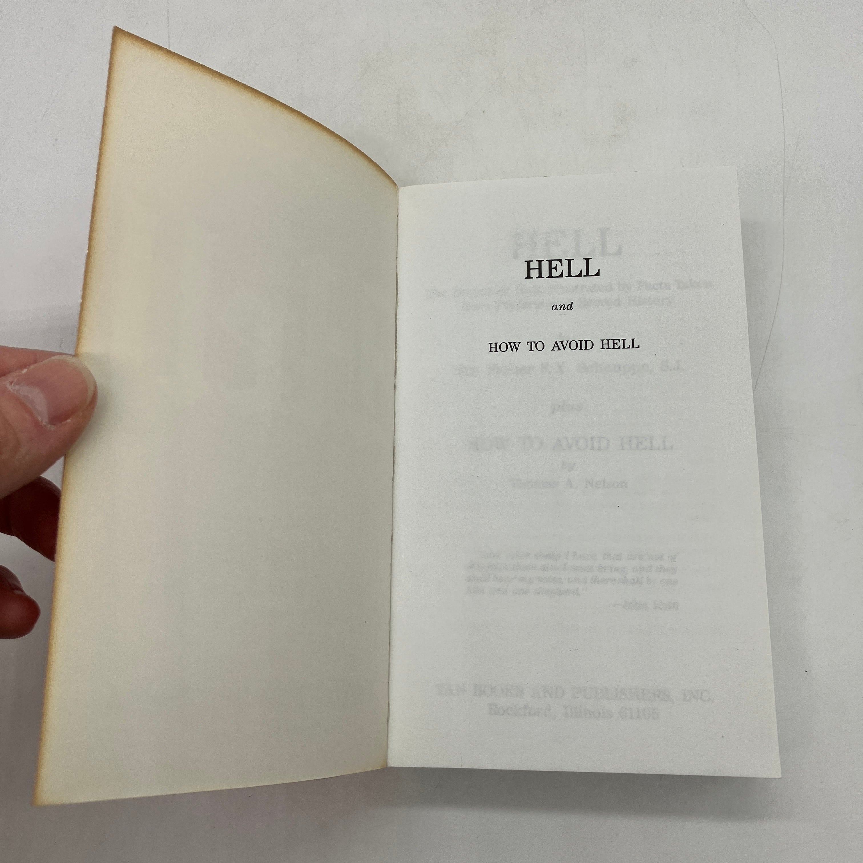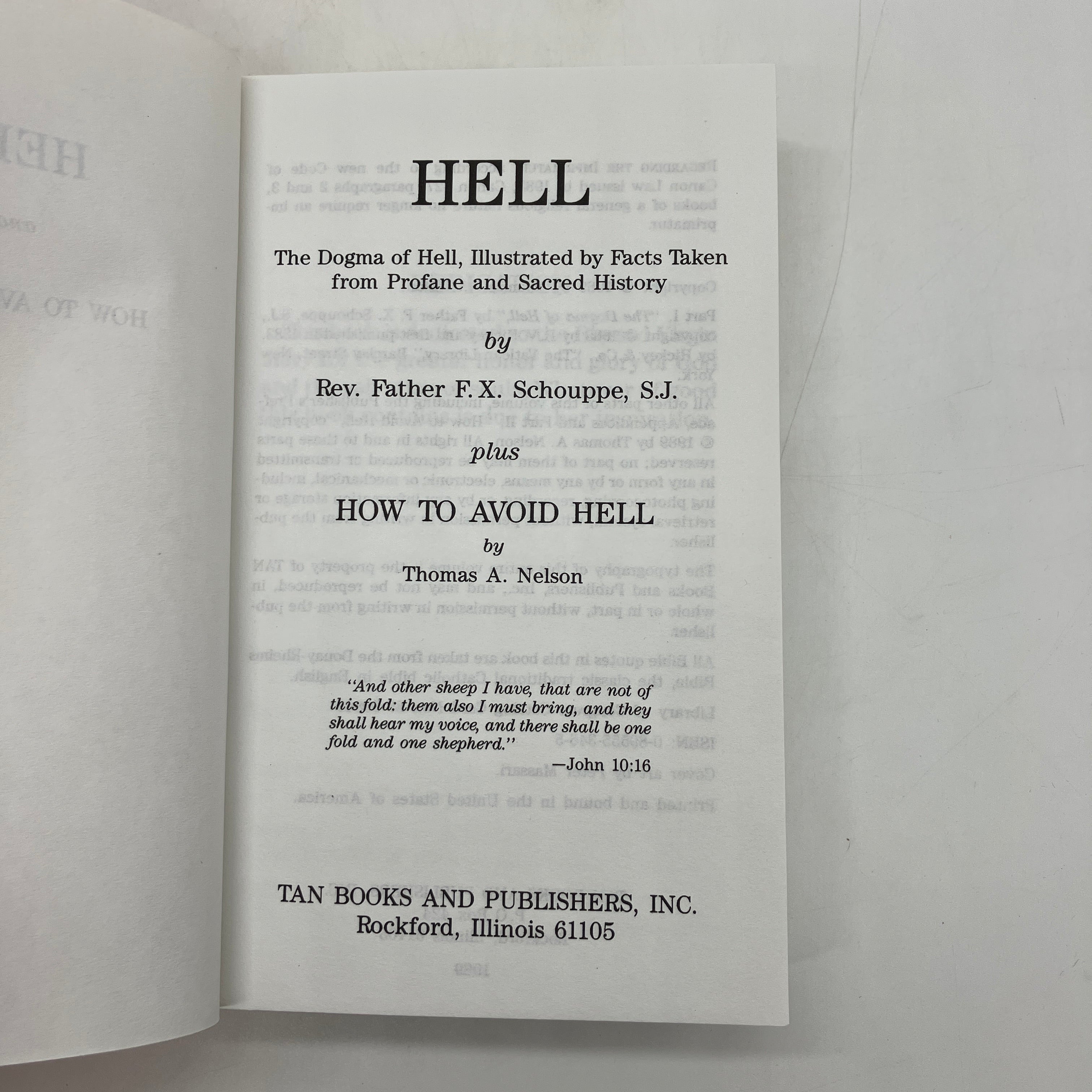 TAN Books and Publishers, 1989. Trade paperback of Hell: The Dogma of Hell, Illustrated by Facts Taken from Profane and Sacred History; Plus How to Avoid Hell by F.X. Schouppe & Thomas Nelson.