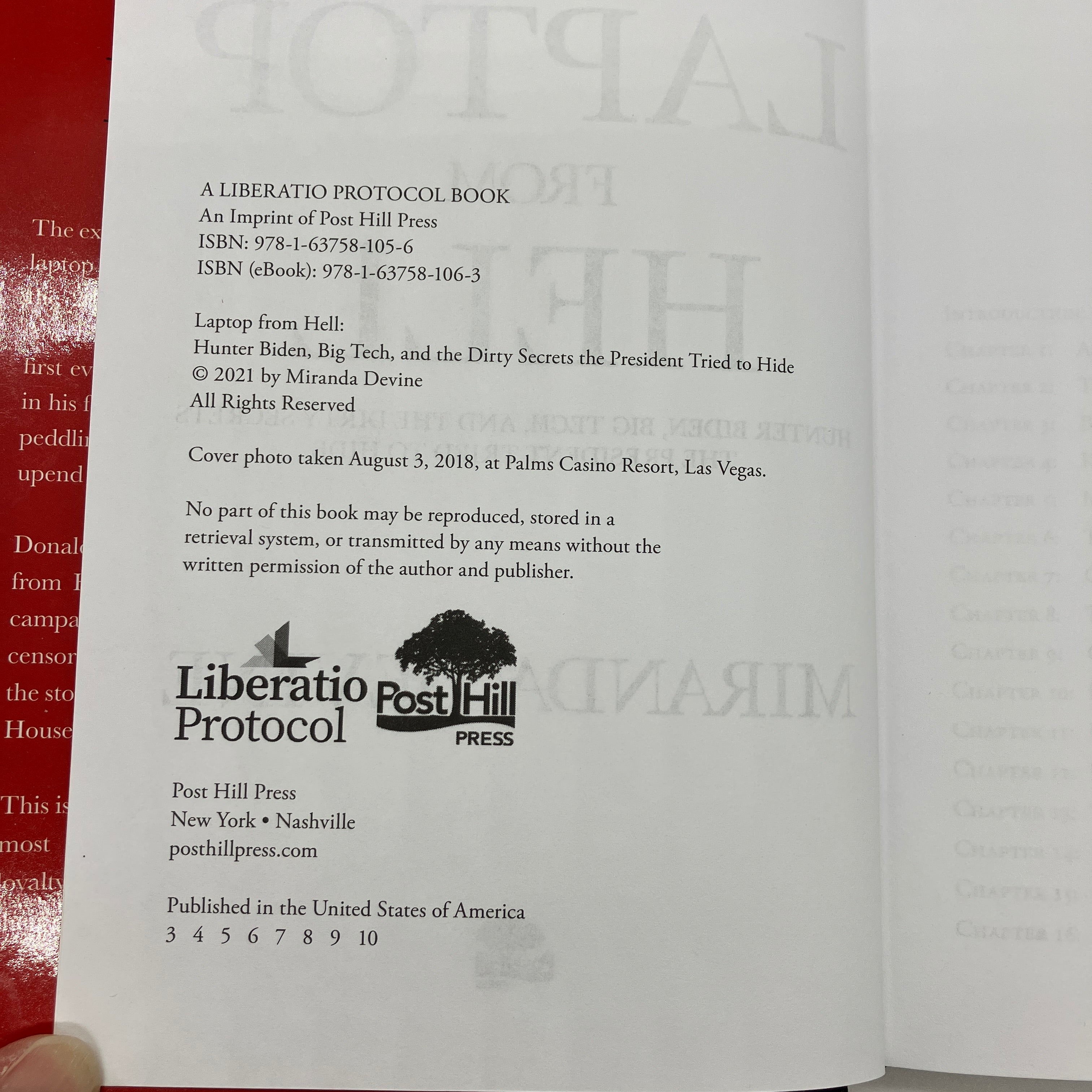 Post Hill Press, 2021. Hardcover with dust jacket of Laptop from Hell: Hunter Biden, Big Tech, and the Dirty Secrets the President Tried to Hide by Miranda Devine.