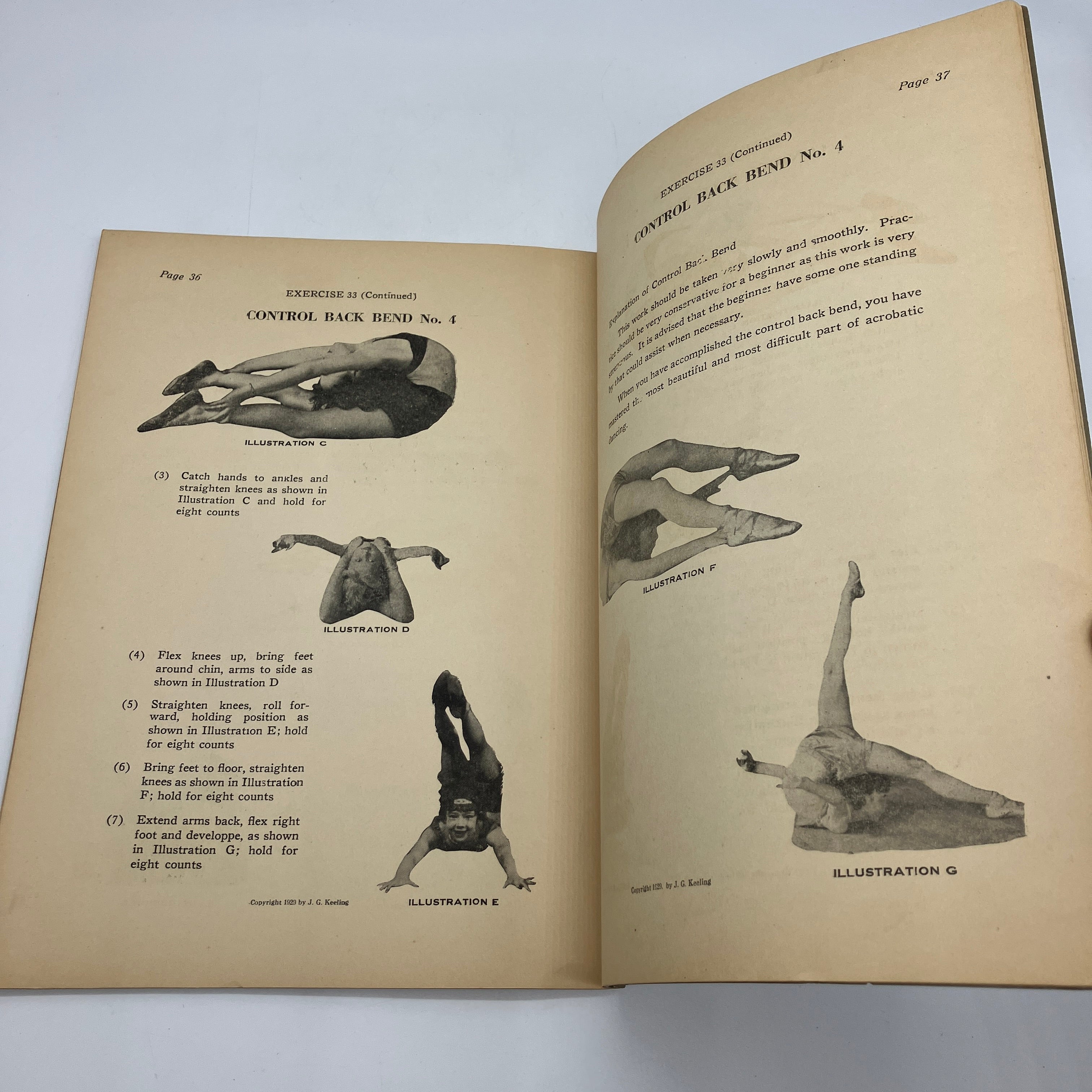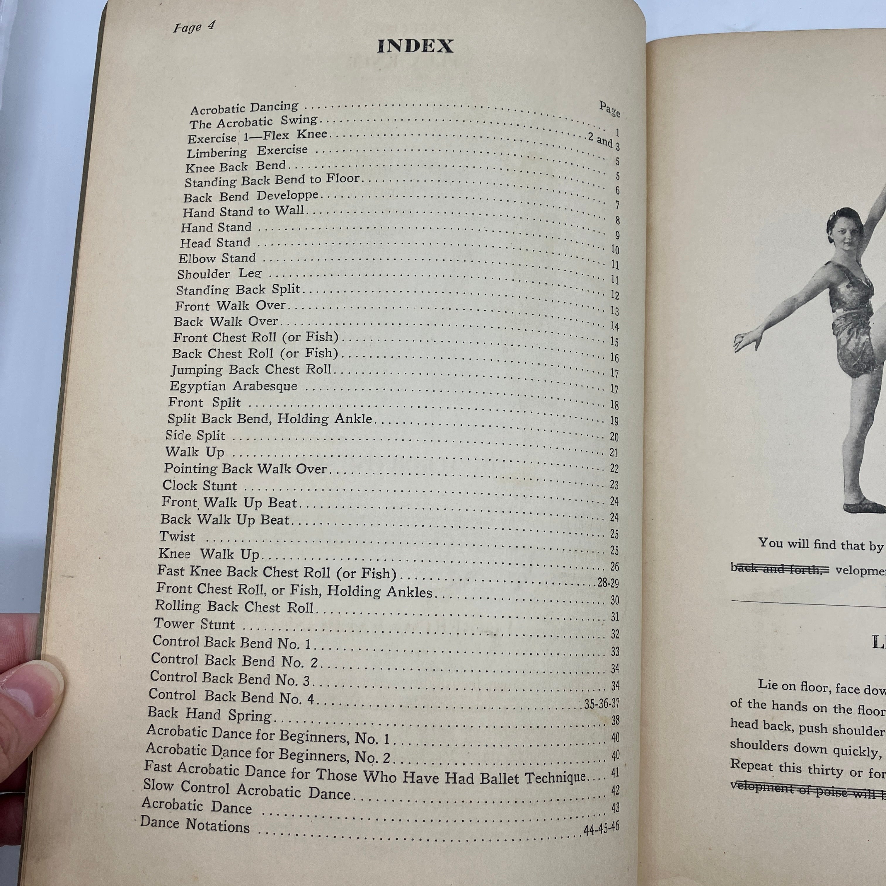 A pioneering 46-page manual presented as the world's only descriptive guide to acrobatic dancing focusing on techniques for both beginners and professionals. The book is structured into sections covering fundamentals like posture, balance, and basic moves, progressing to advanced routines and stage performances. It includes practice exercises, choreographed numbers for school and professional use, and photographic illustrations drawn from the author's own students' performances, making it a comprehensive resource for acrobatic enthusiasts.