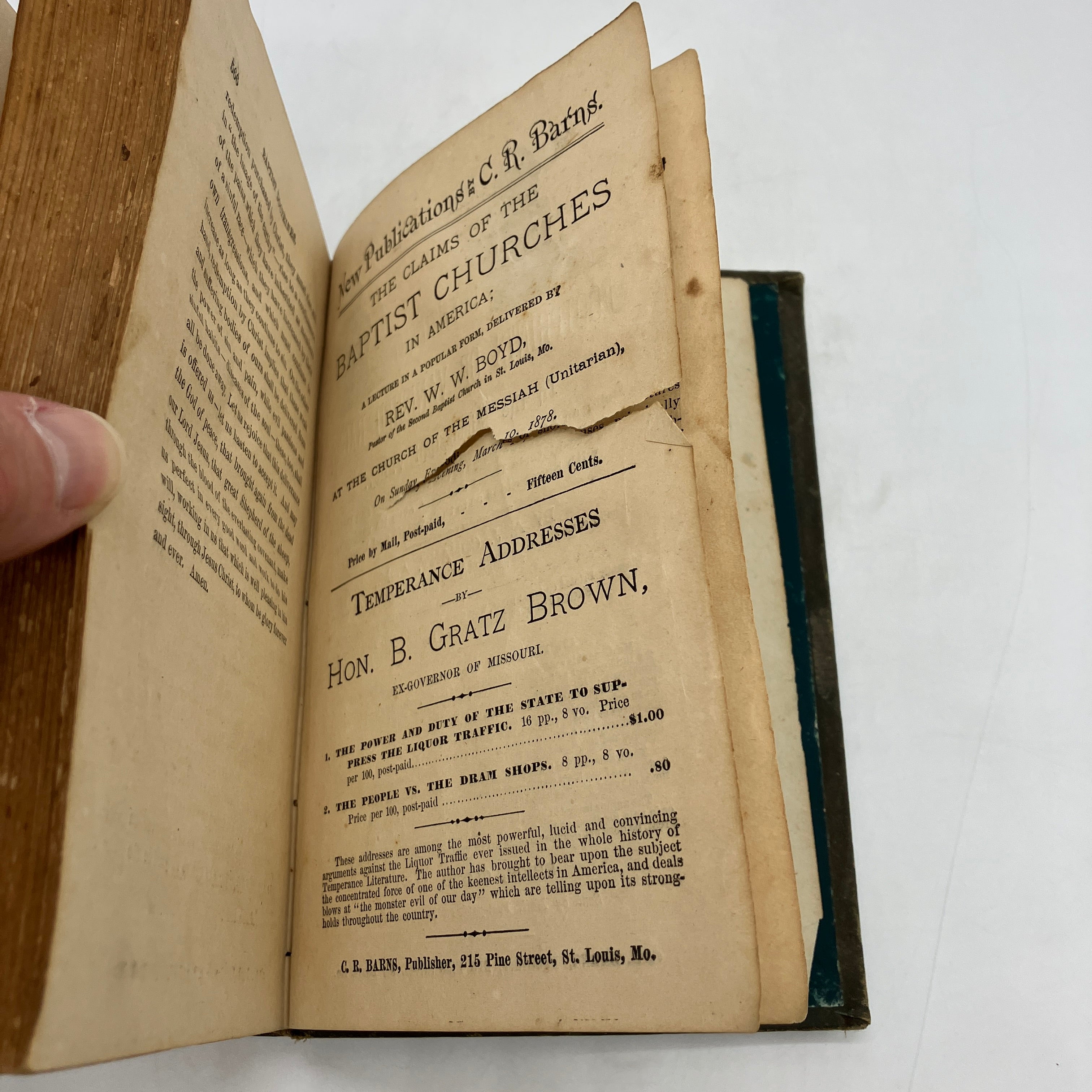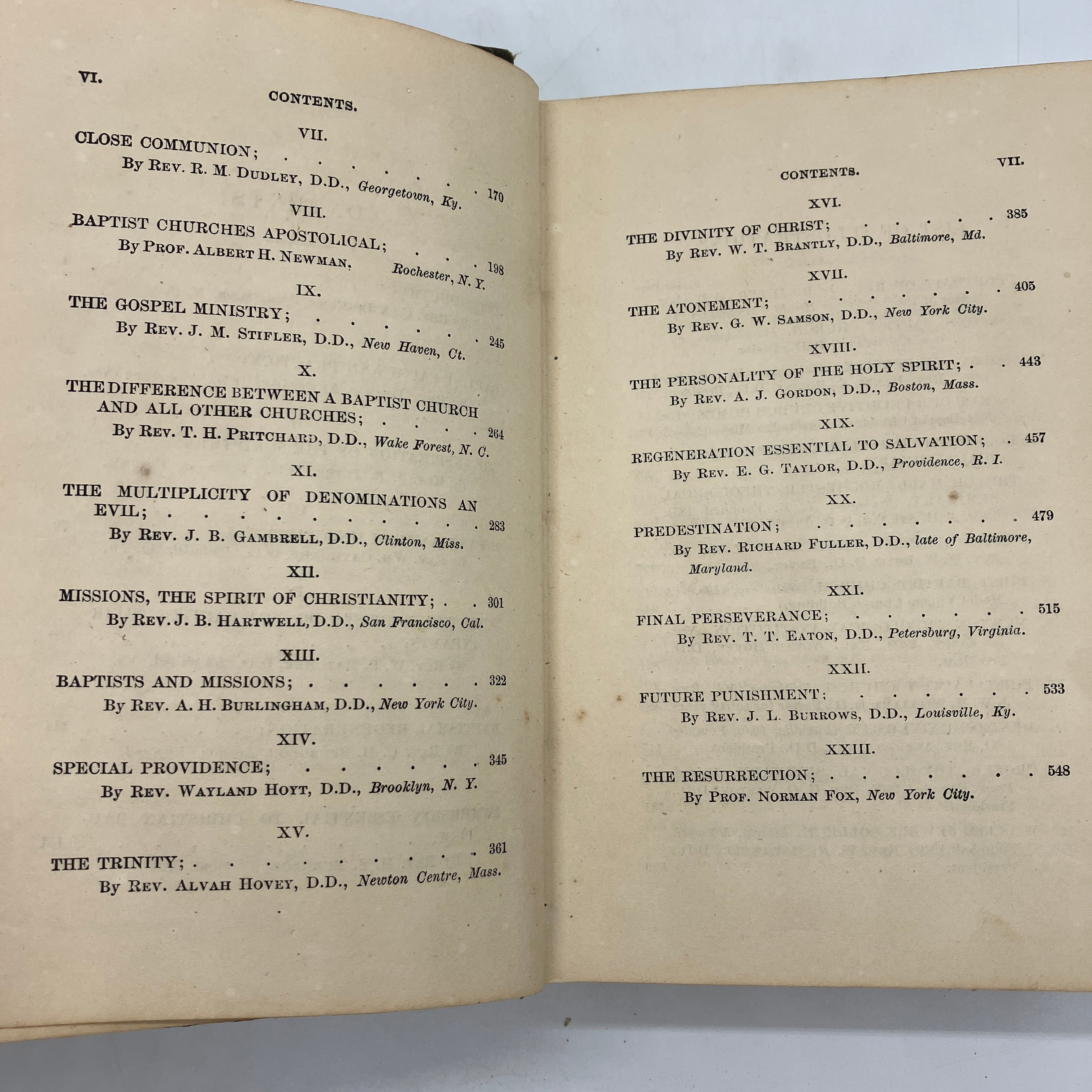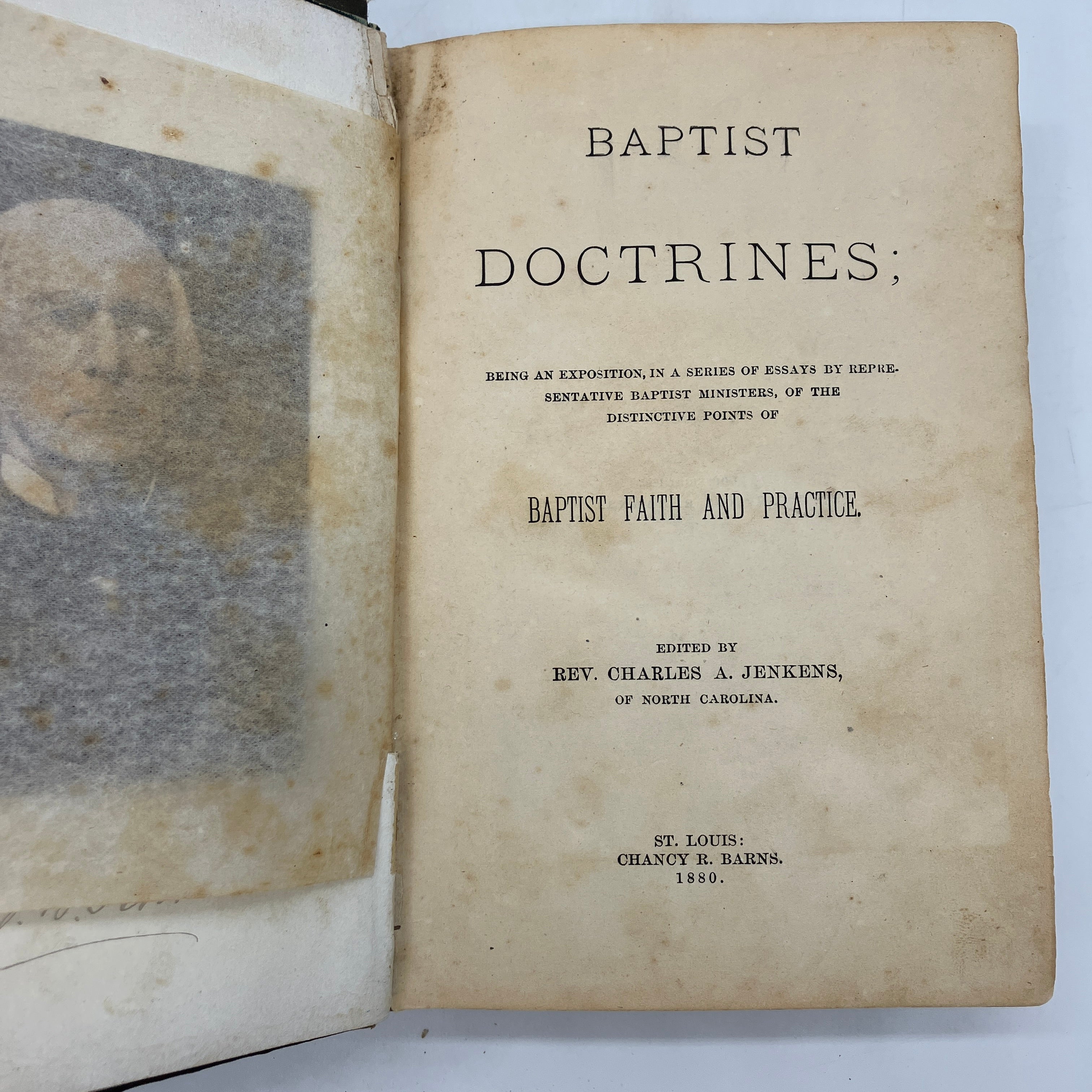 Chancy R. Barns, St. Louis, 1880. First edition antiquarian cloth bound hardcover of Baptist Doctrines; Being an Exposition, in a Series of Essays by Representative Baptist Ministers, of the Distinctive Points of Baptist Faith and Practice by Rev. Charles A. Jenkens.