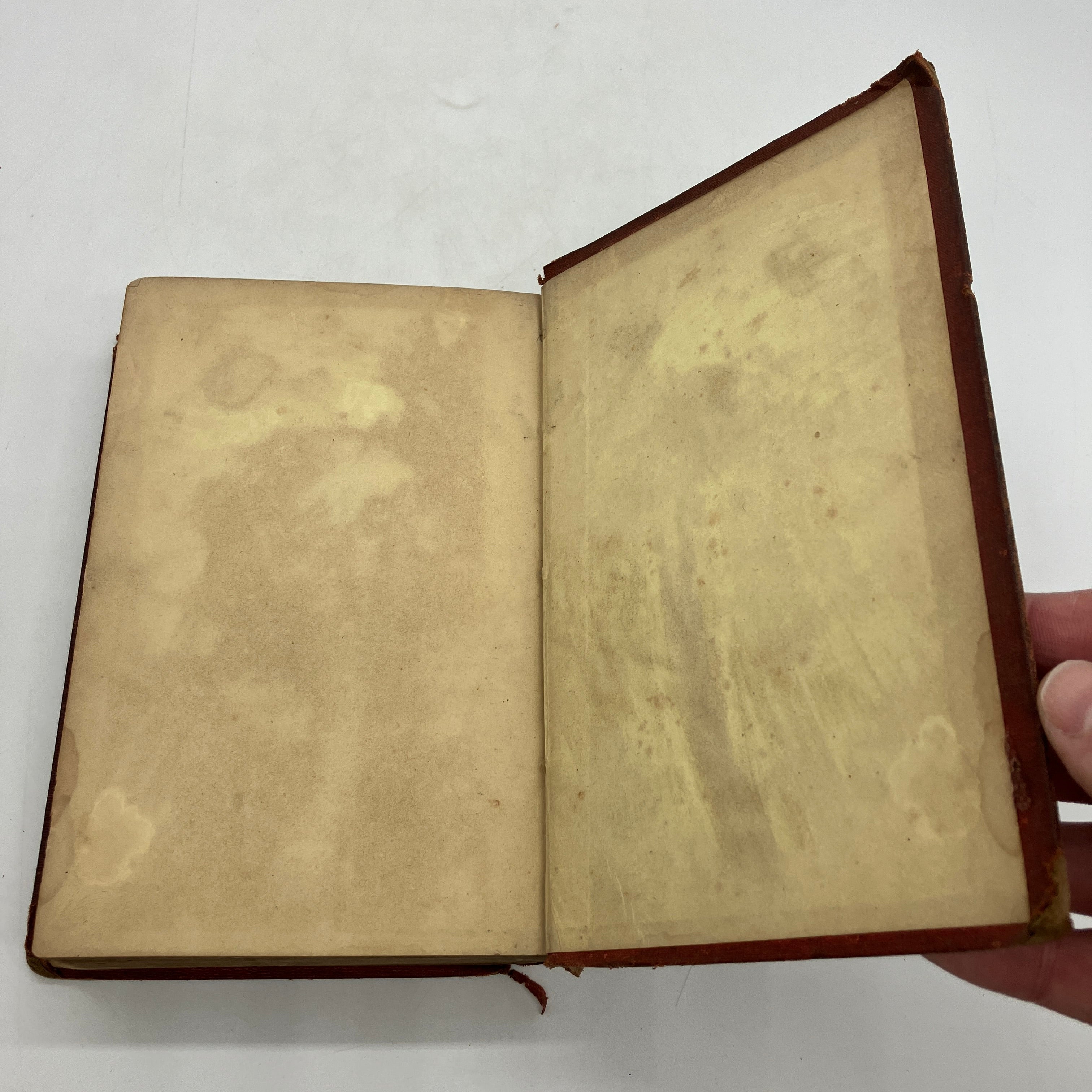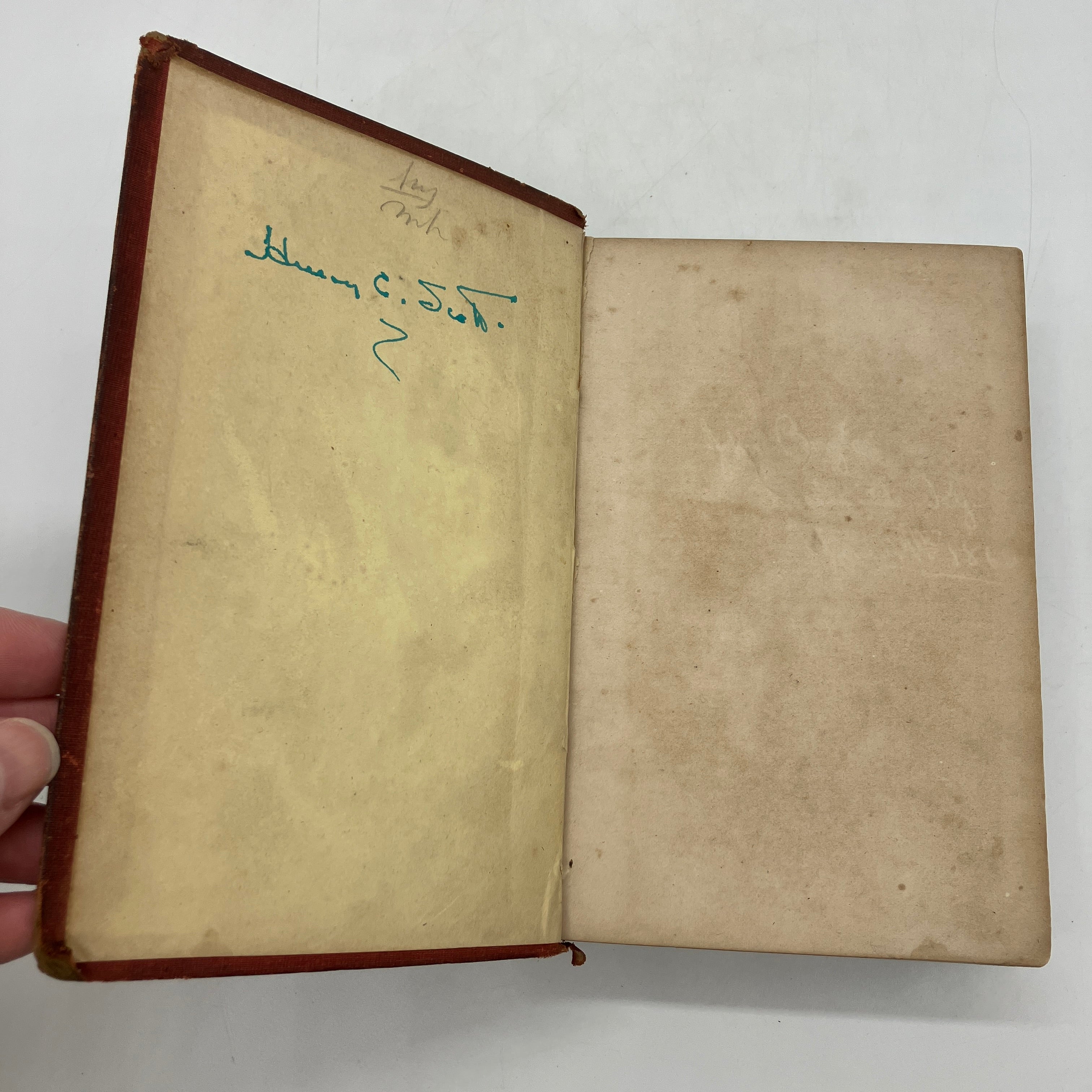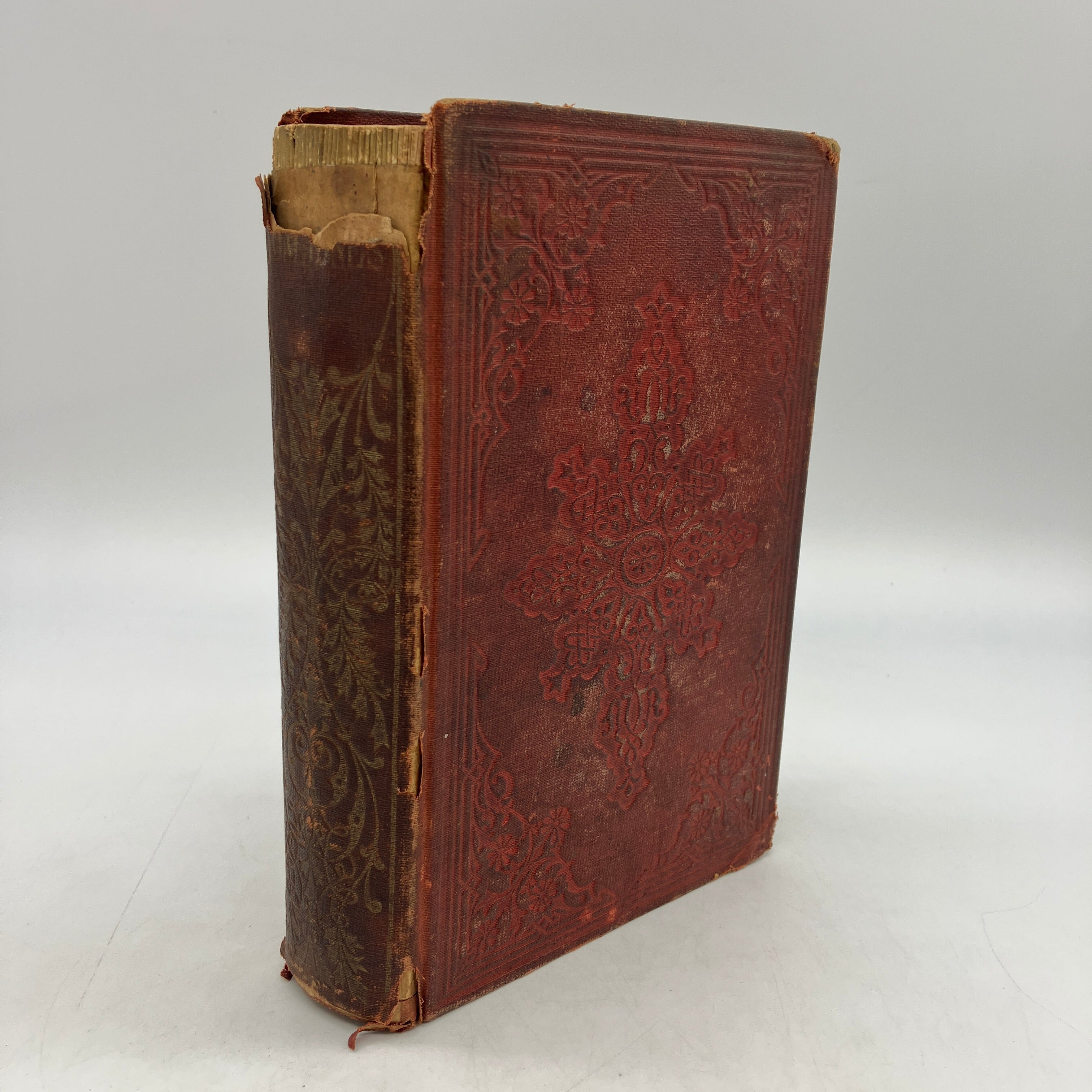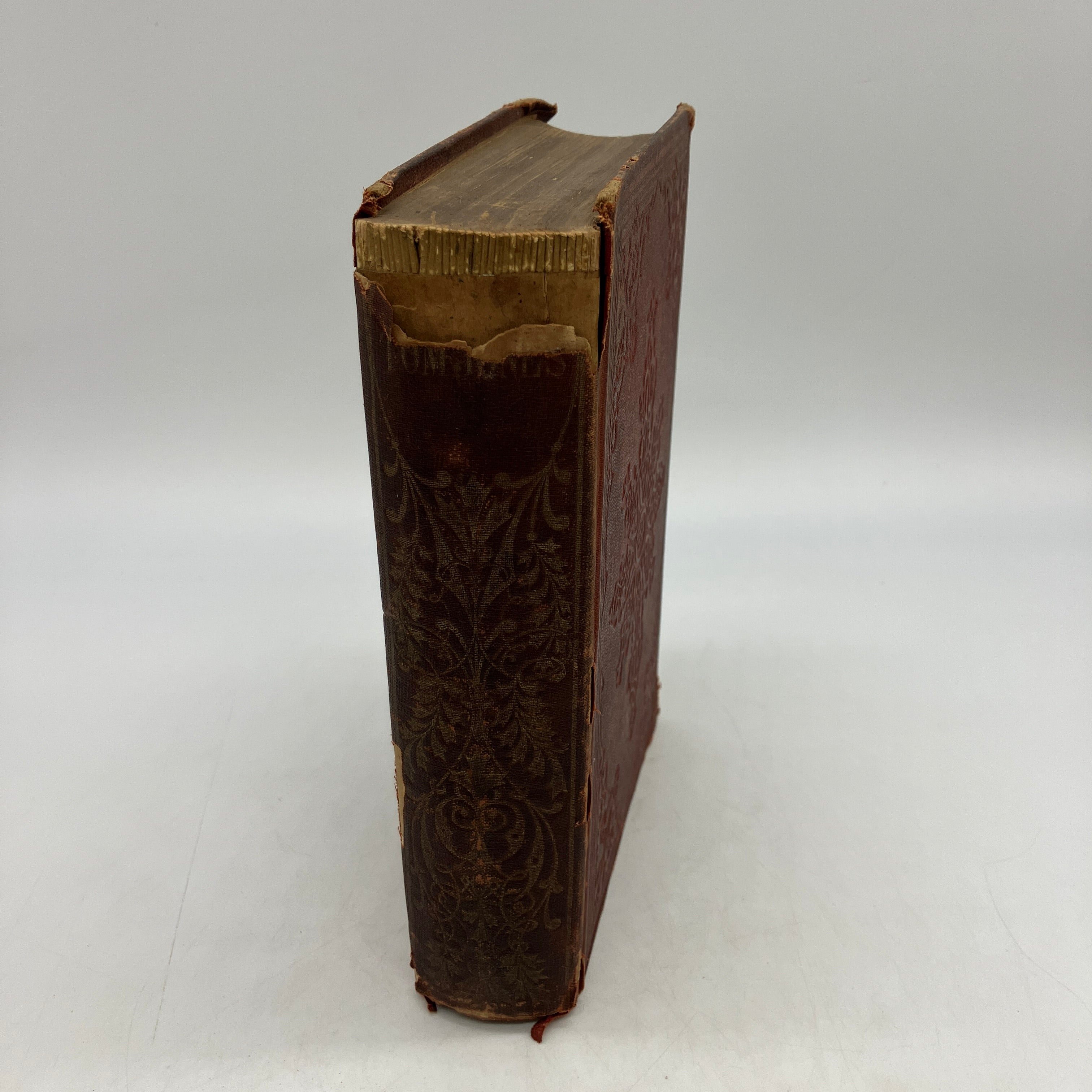 POOR condition. 1-inch of chipping to the top of the spine, and additional chipping at the bottom and hinges. Covers soiled and worn. Binding loose. Front fly leaf is cleanly torn out. No illustrations in the book, except for the frontispiece. Spotting to pages. Lots of folded page corners. 1 long horizontal tear found to page 51. A few previous owner markings to the margins, and previous owner's name inside the front cover. Book is complete. Antiquarian book in poor but readable condition.