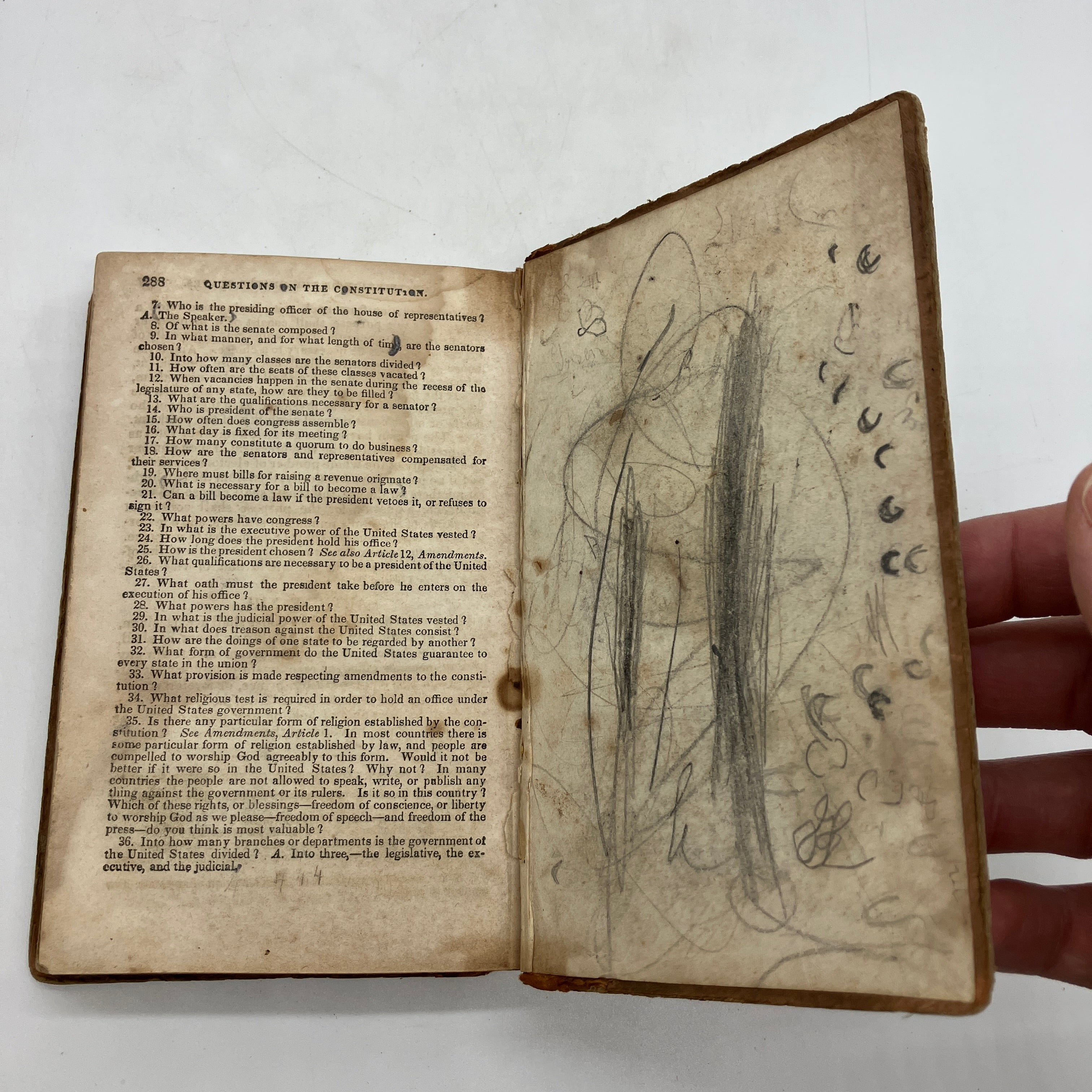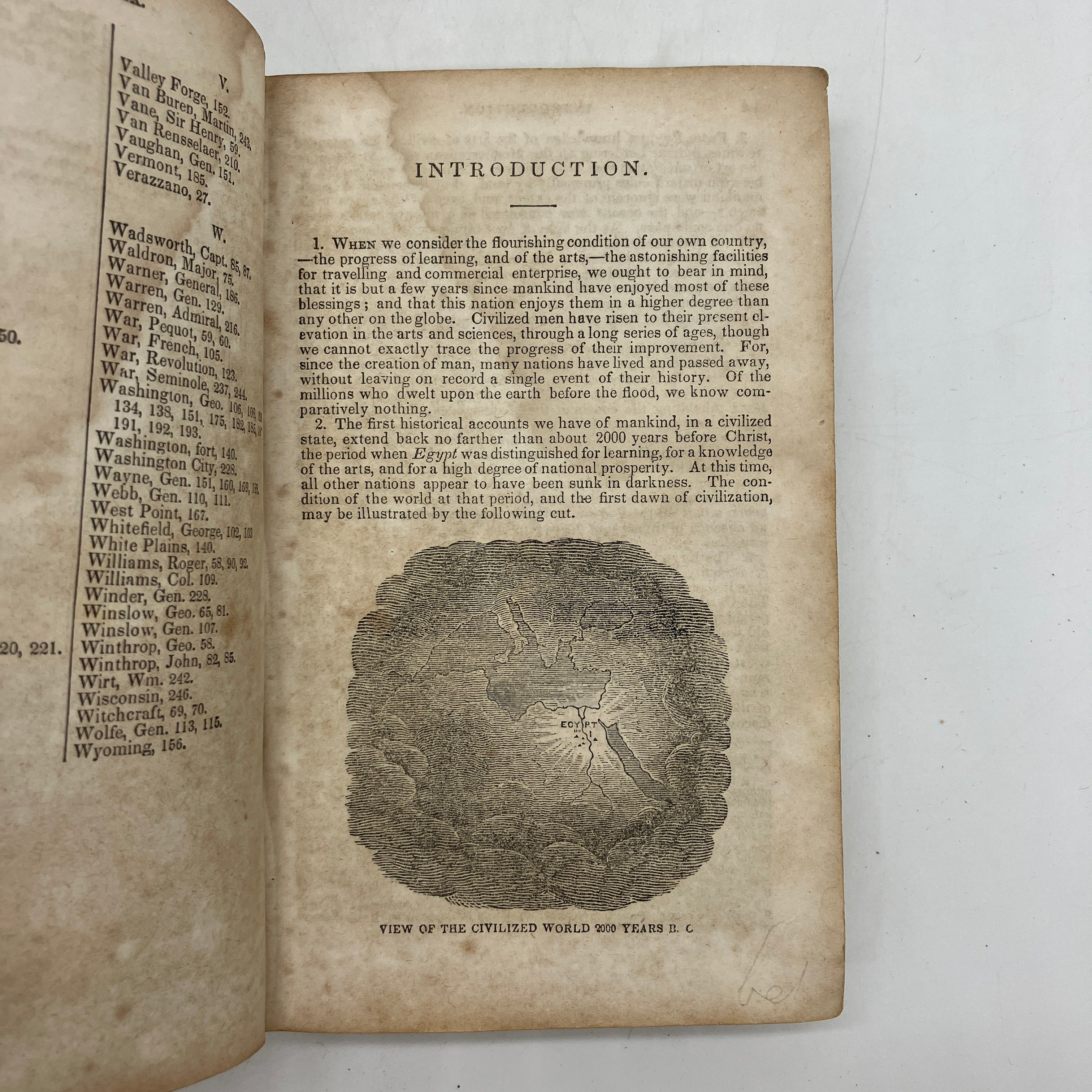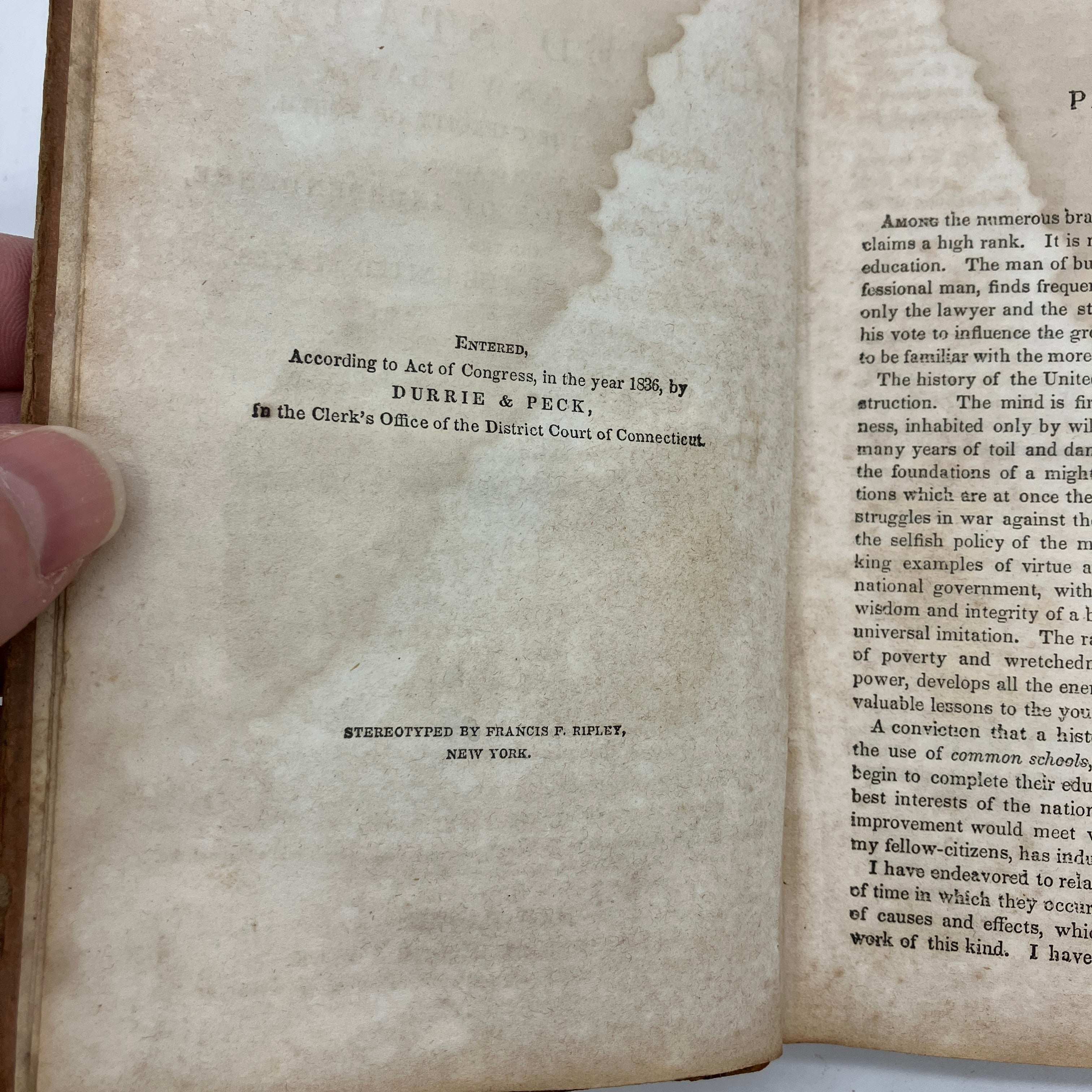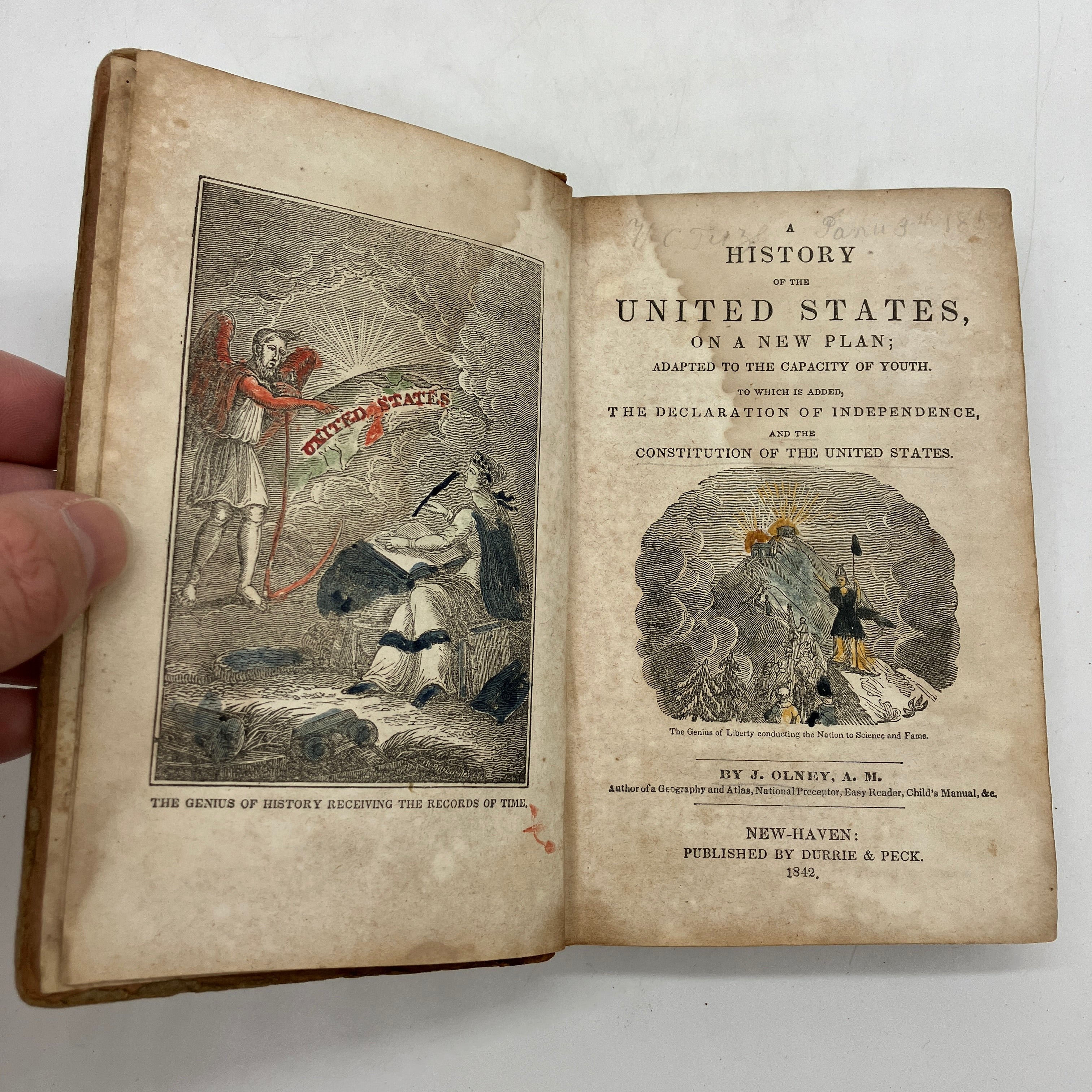 Durrie & Peck, 1842. Antiquarian leather bound hardcover of A History of the United States, on a New Plan; Adapted to the Capacity of Youth. To Which Is Added the Declaration of Independence, and the Constitution of the United States by Jesse Olney.