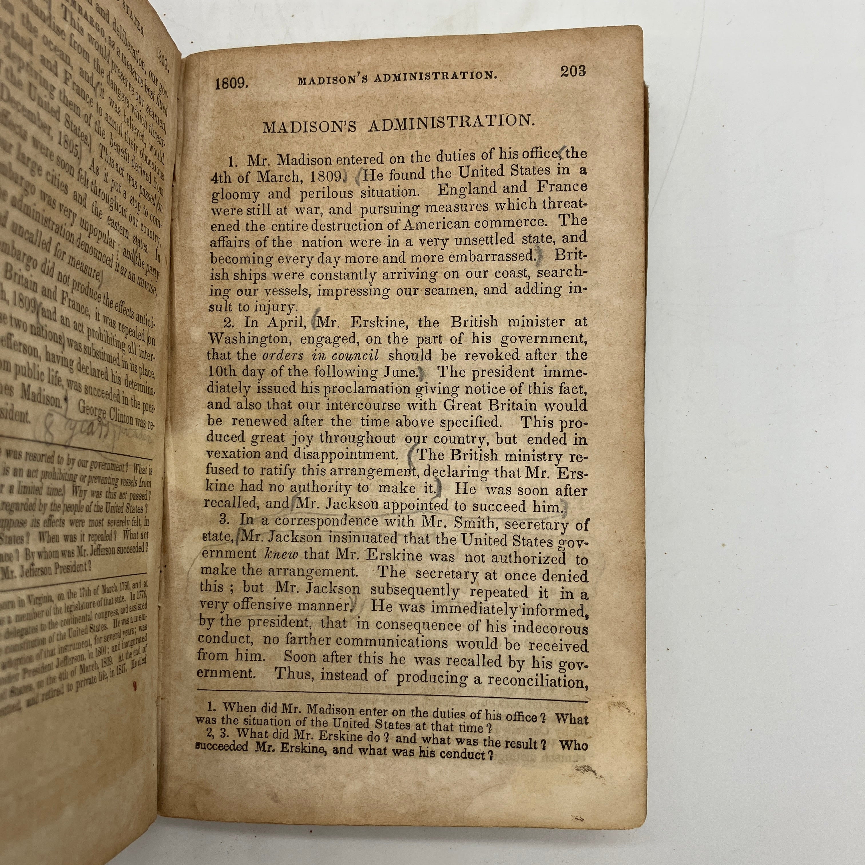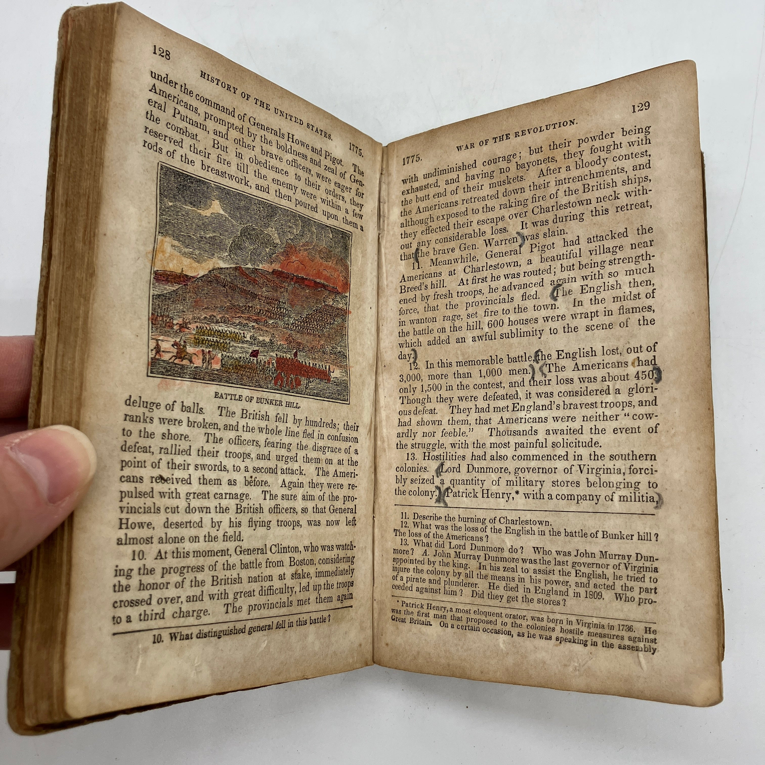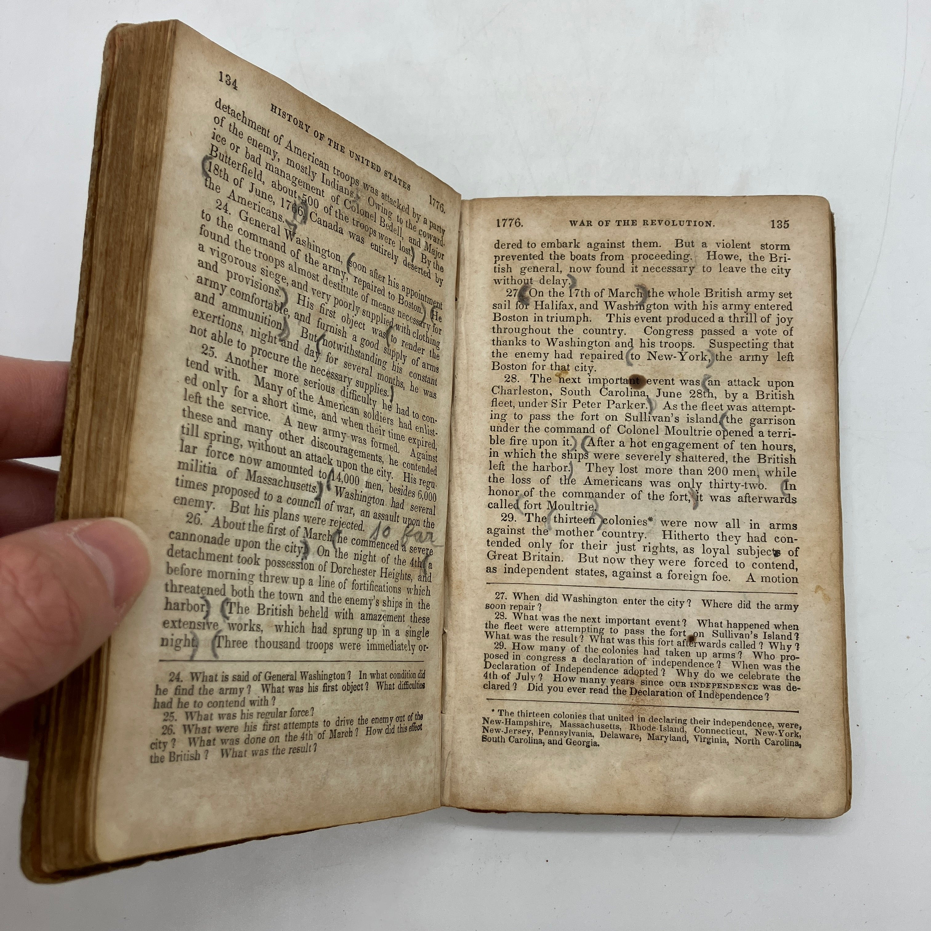 Interesting early American history textbook with some fun attempts at colorizing the black and white illustrations by a young, bored pupil.