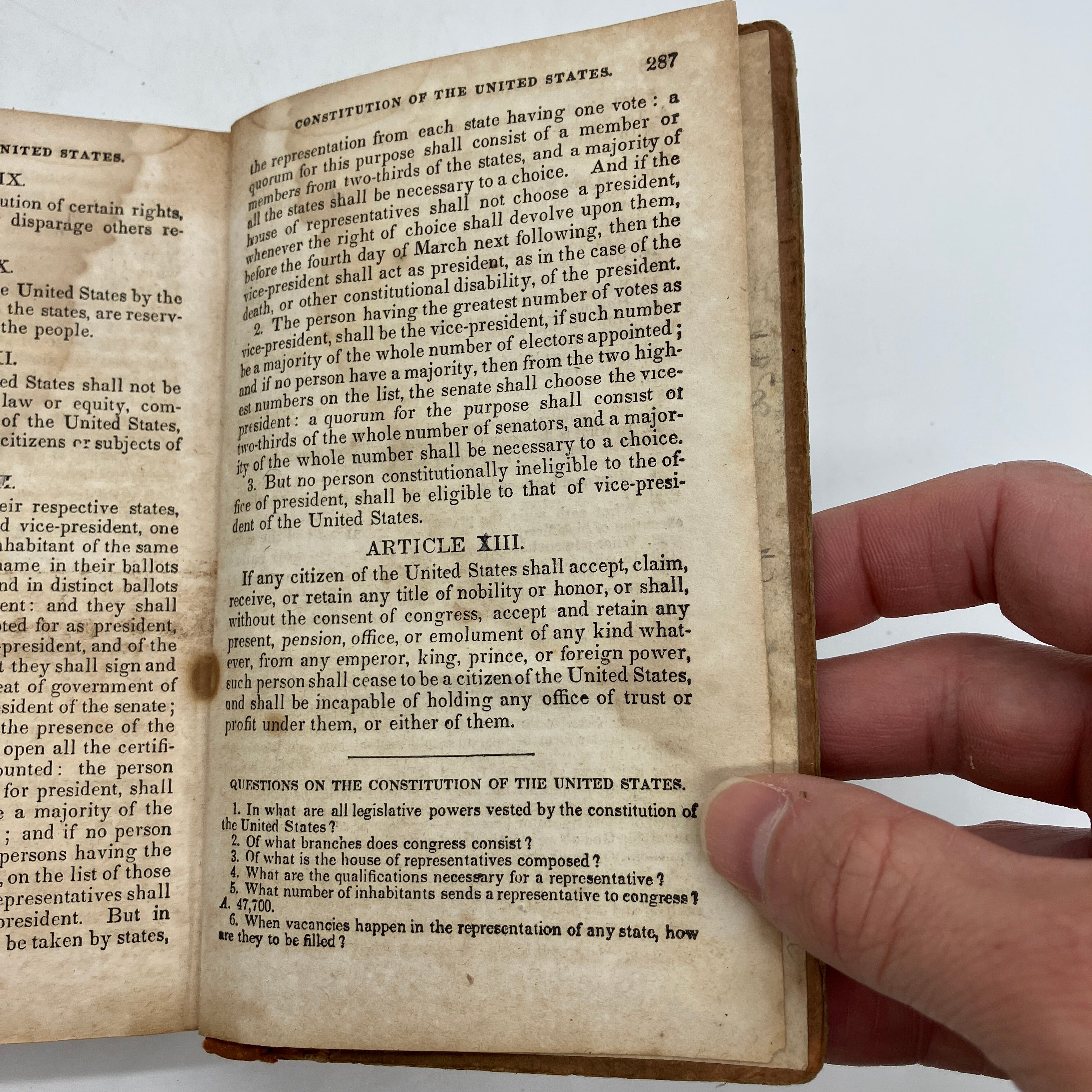 Page 287 incorrectly prints the Titles of Nobility Amendment as the Thirteenth Amendment. This was a popular confusion during the first half of the 19th century that made it's way into this textbook. The actual 13th amendment, abolishing slavery, was passed in 1865. The Titles of Nobility amendment passed Congress on May 1, 1810 but failed to be ratified by the states, short by just 2 states. However, it was mistakenly included in many early 19th century printings of the Constitution and therefore thought by many at the time to be ratified.