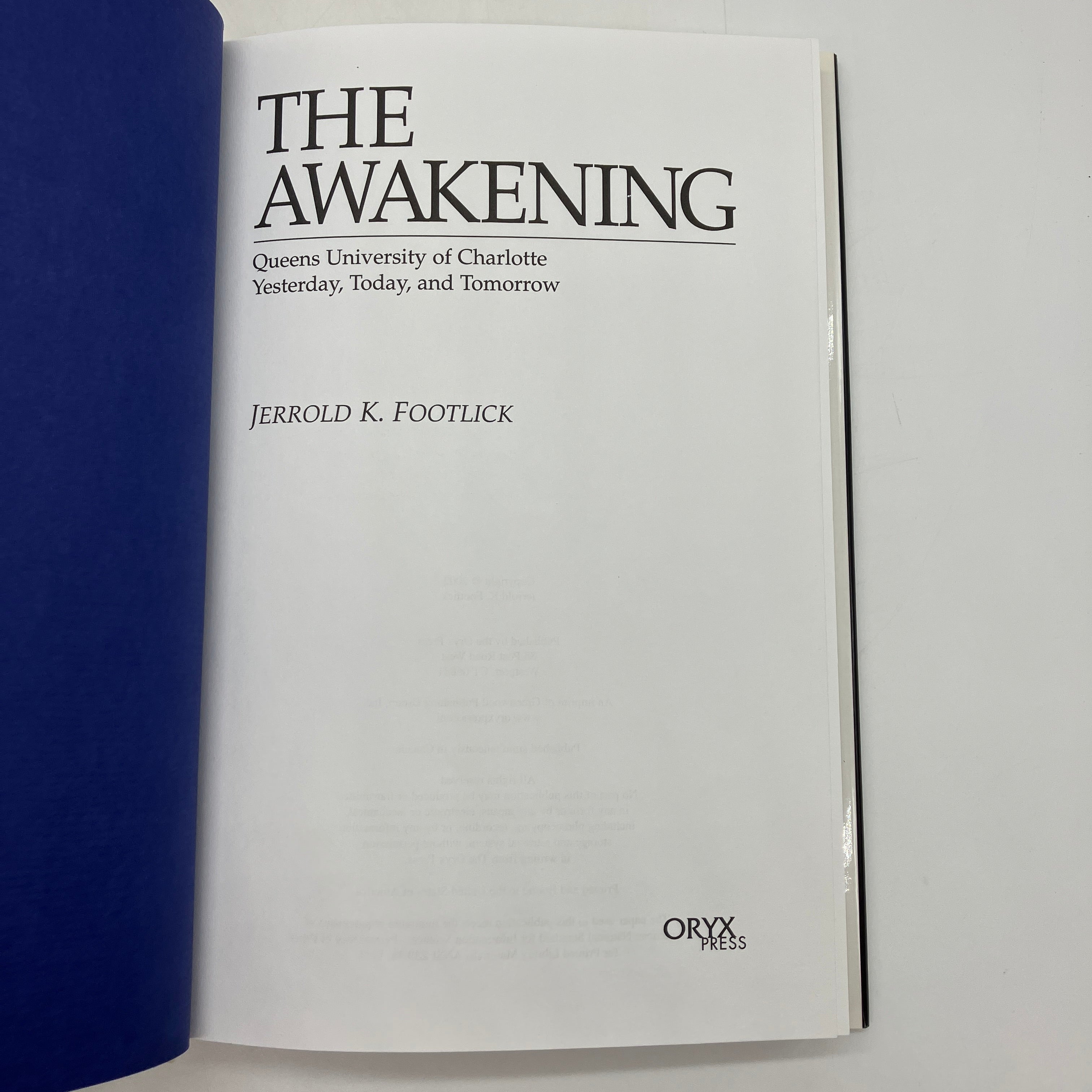 Oryx Press, 2002. Cloth bound hardcover with dust jacket of The Awakening: Queens University of Charlotte, Yesterday, Today, and Tomorrow by Jerrold Footlick.