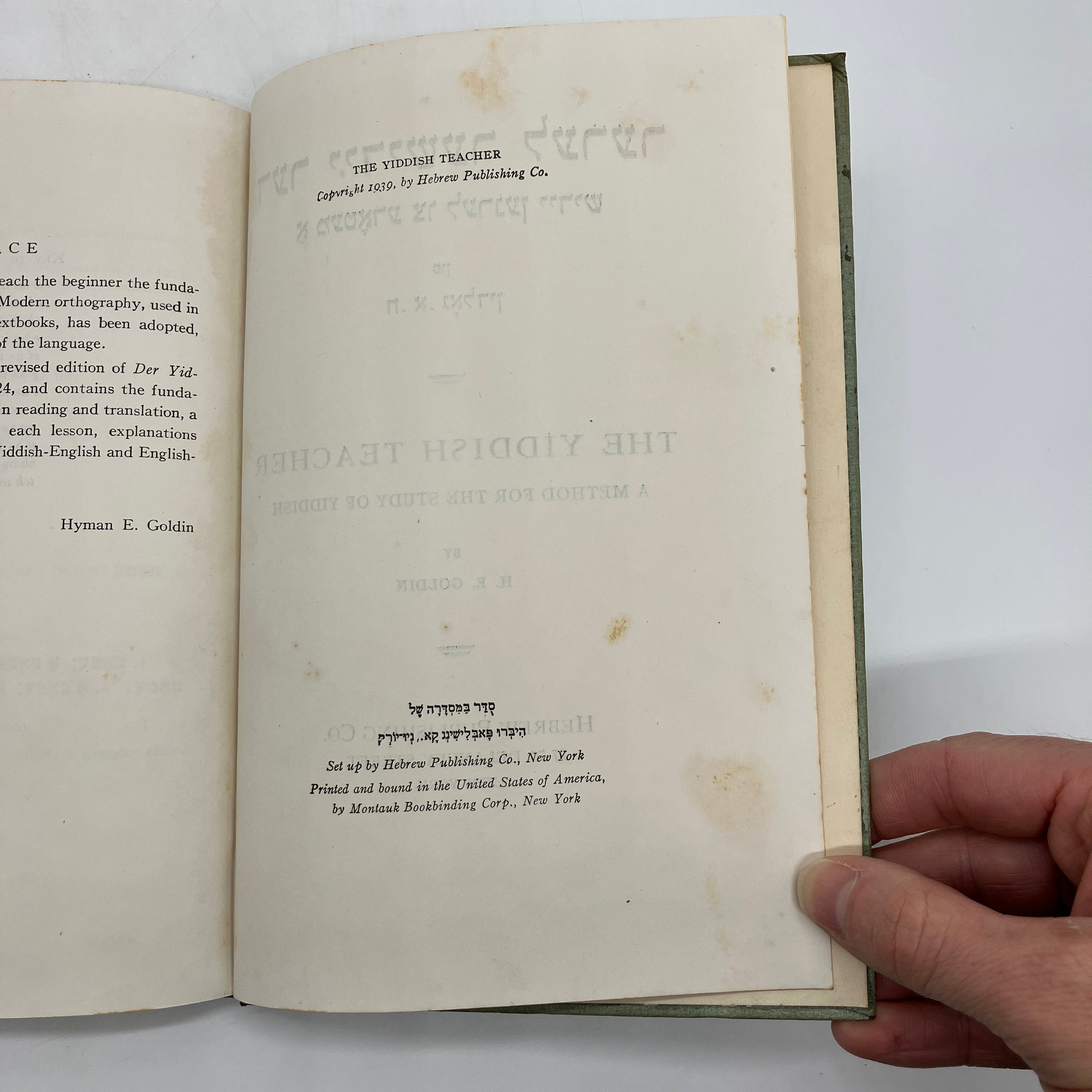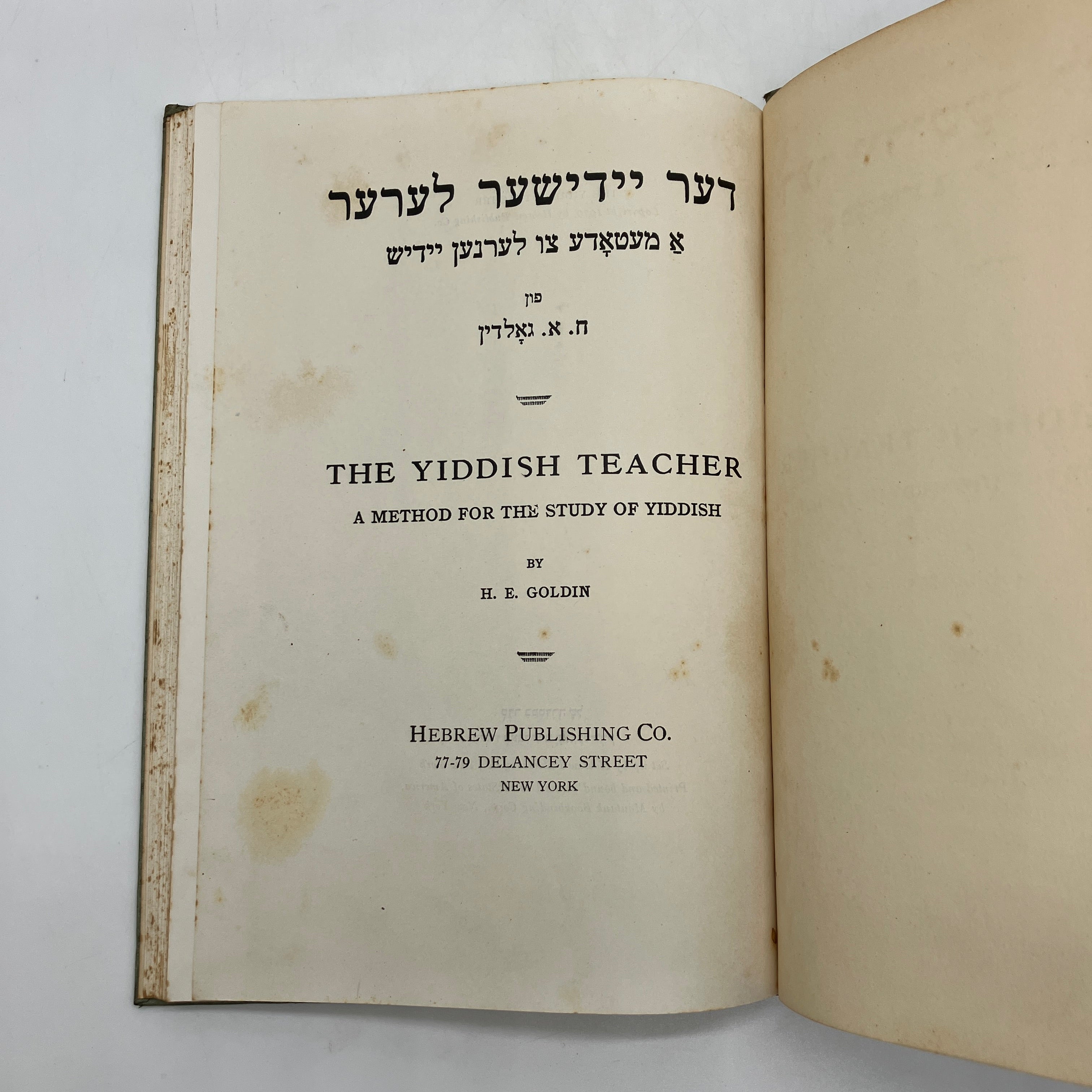 Hebrew Publishing Co., 1939. First edition cloth bound hardcover of The Yiddish Teacher: A Method for the Study of Yiddish by Hyman Elias Goldin.