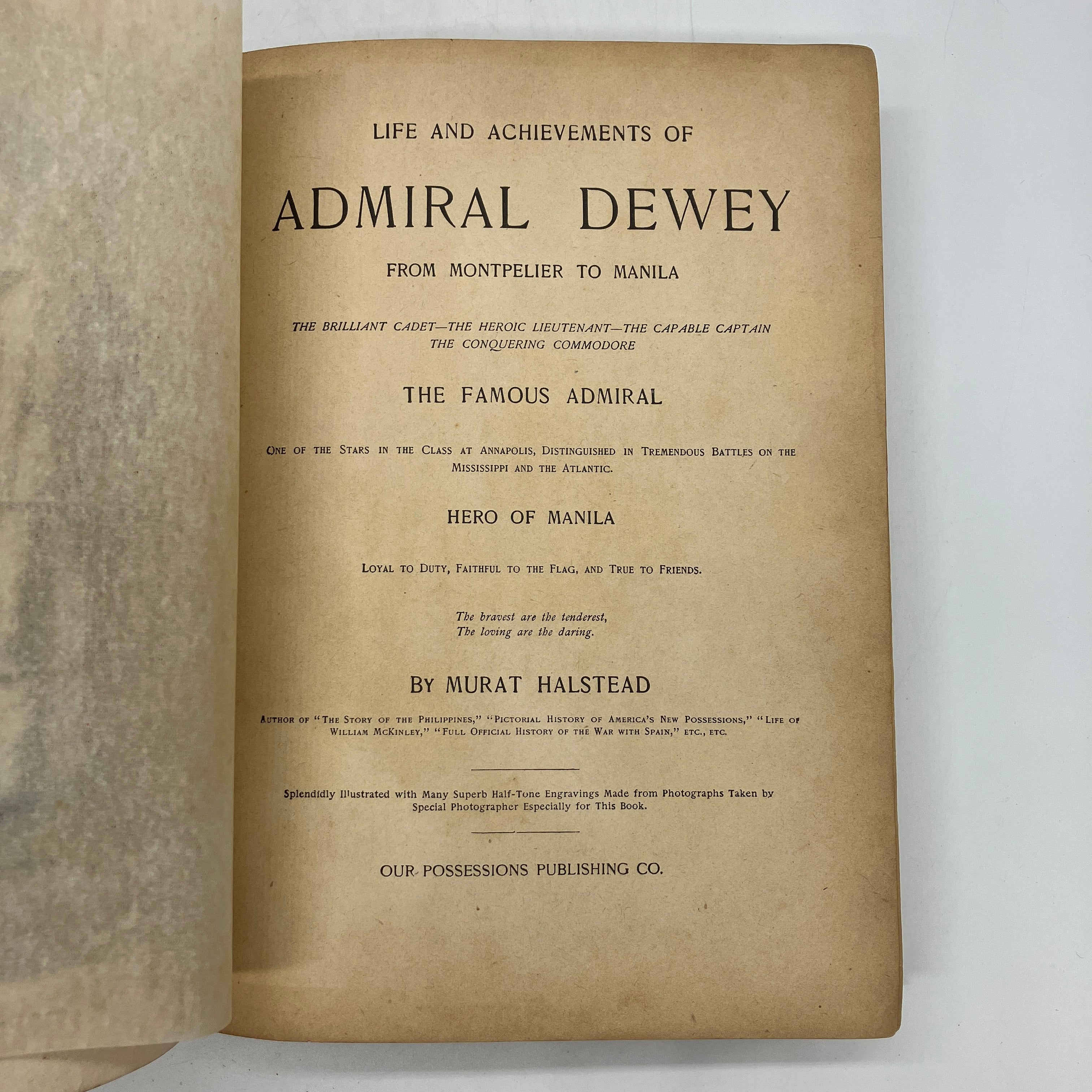 Our Possessions Publishing Co., 1899. Large antiquarian first edition cloth bound hardcover of Life and Achievements of Admiral Dewey From Montpelier to Manila by Murat Halstead.