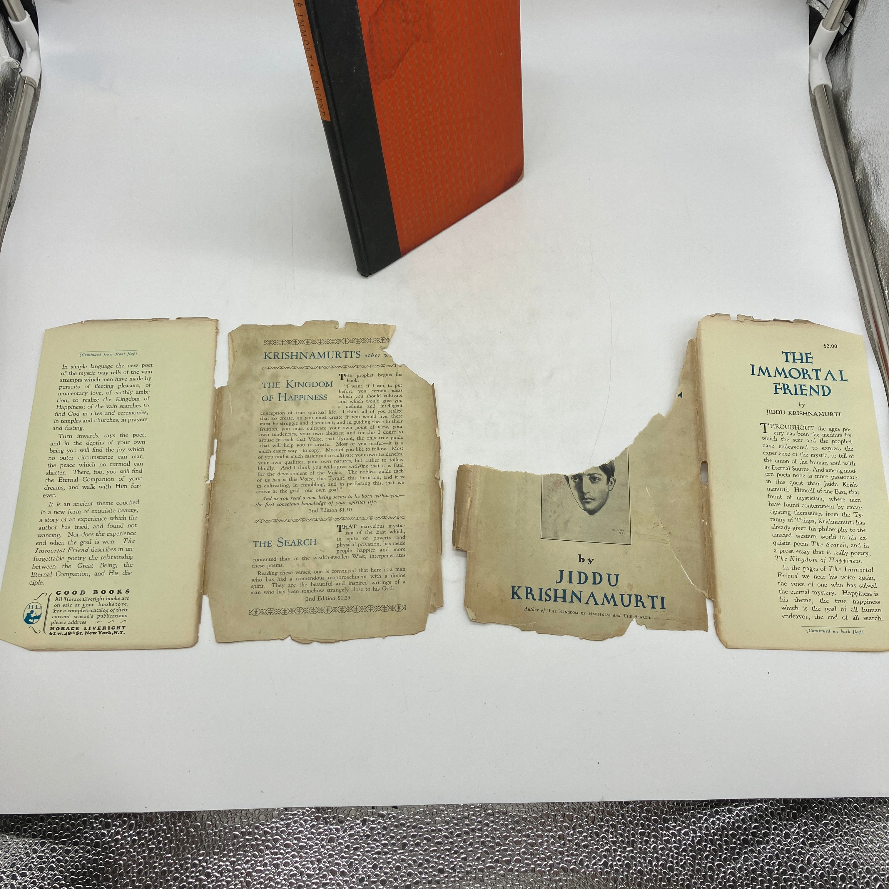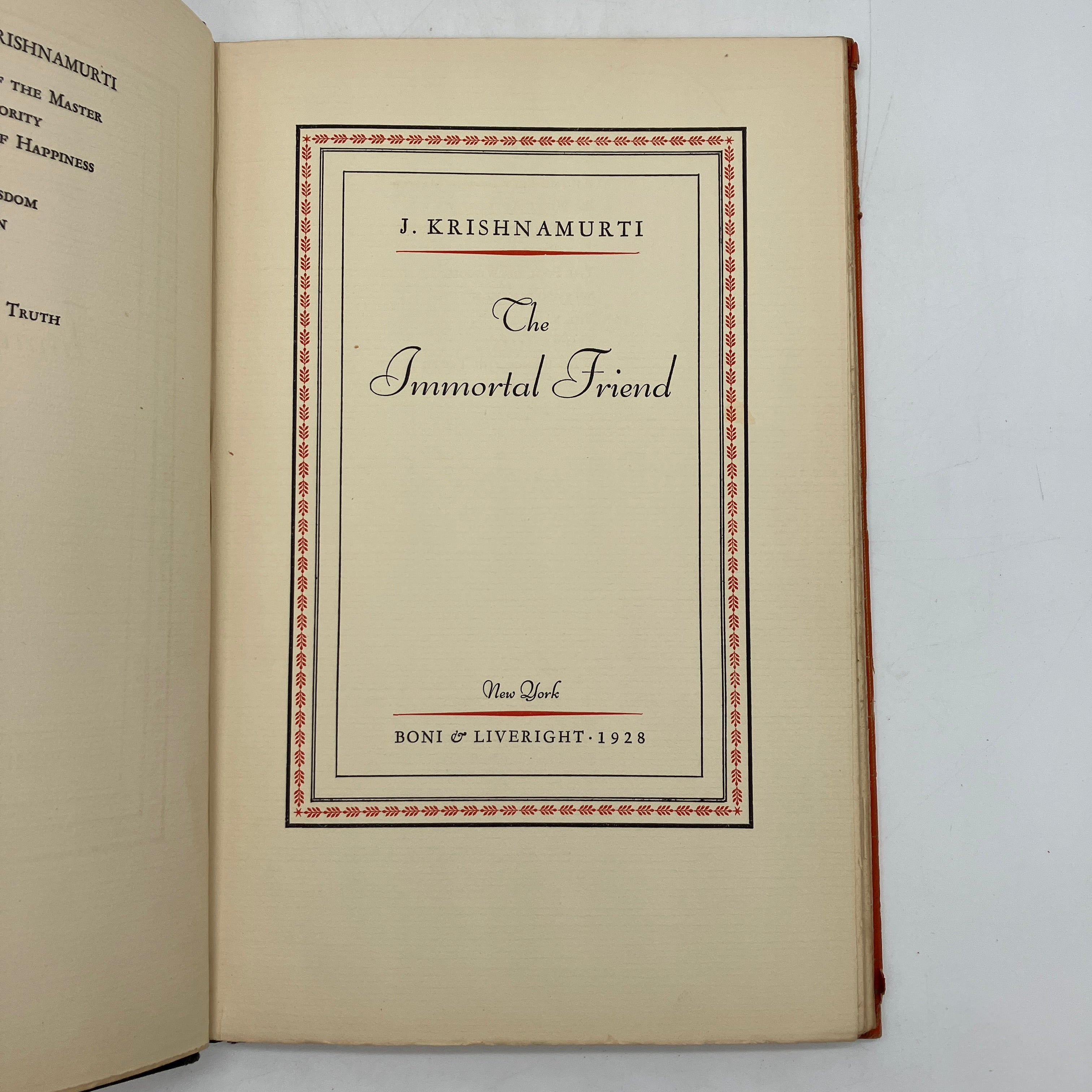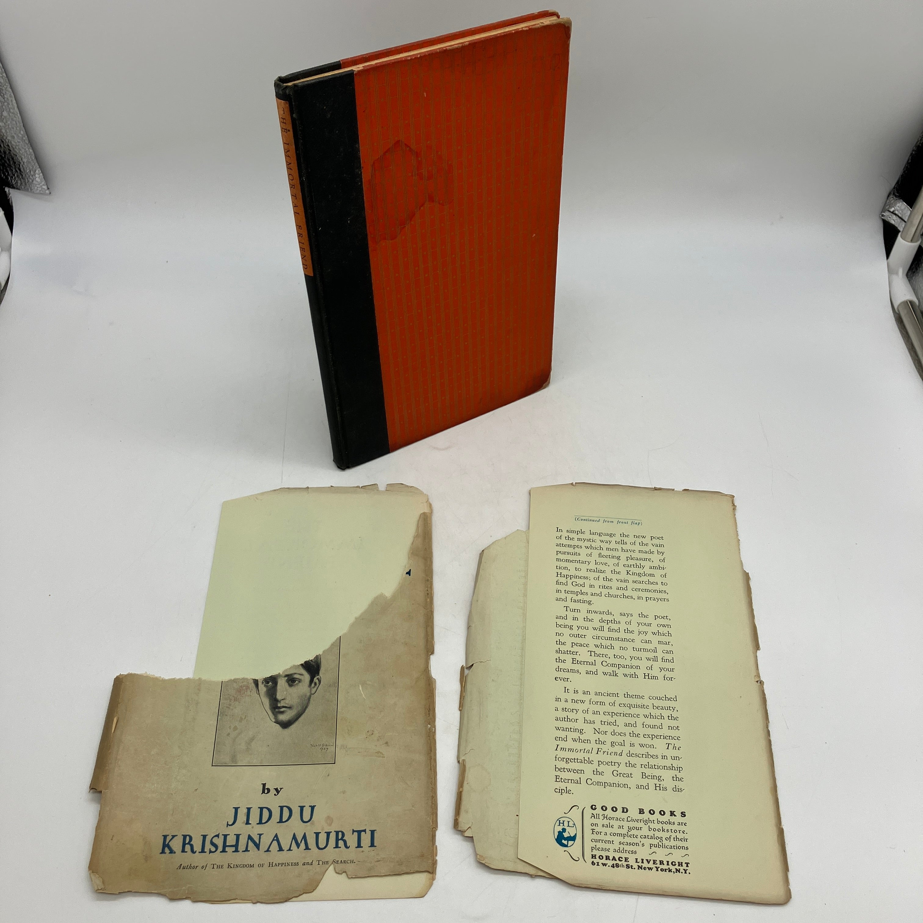 Boni & Liveright, 1928. First edition cloth bound hardcover with dust jacket of The Immortal Friend by Jiddu Krishnamurti.