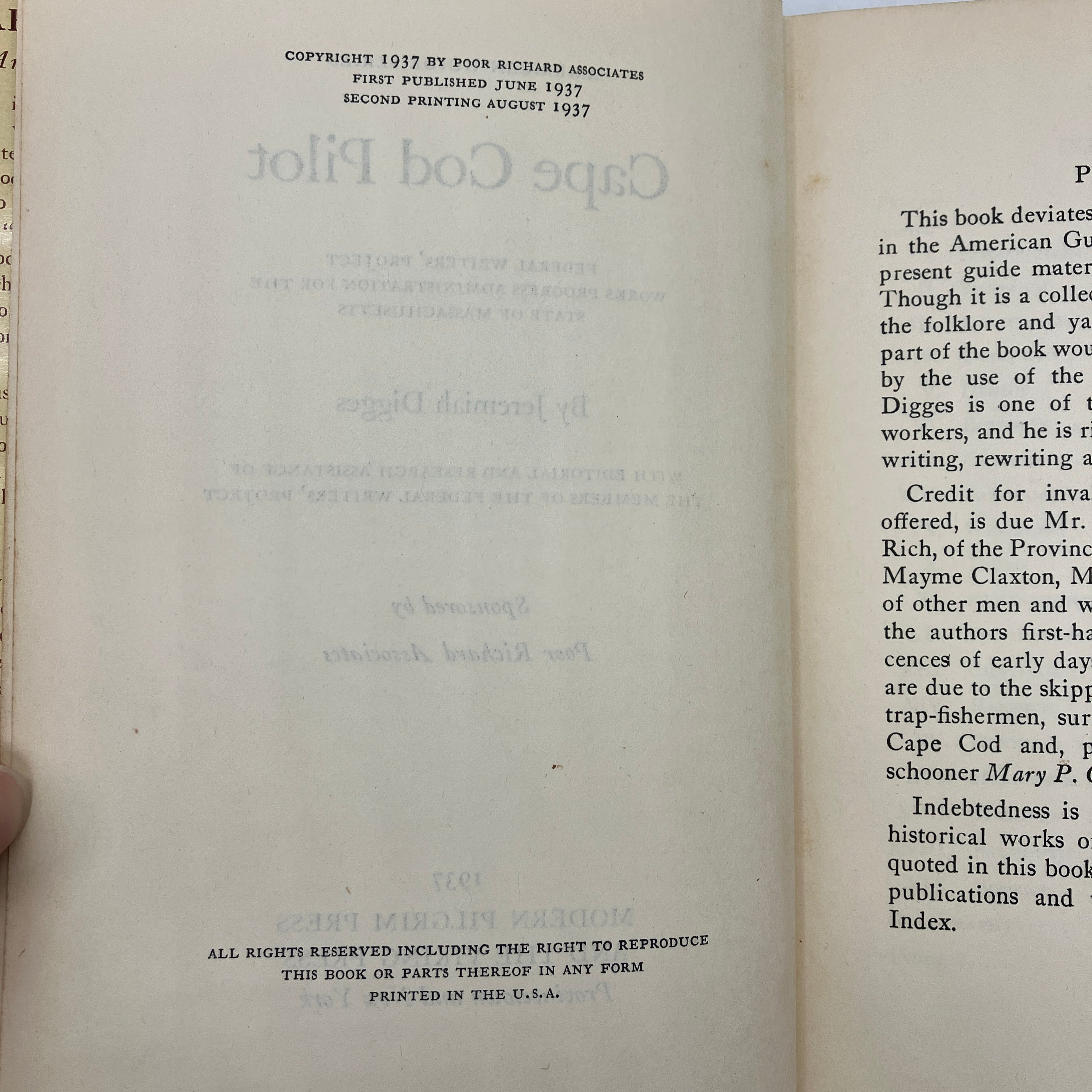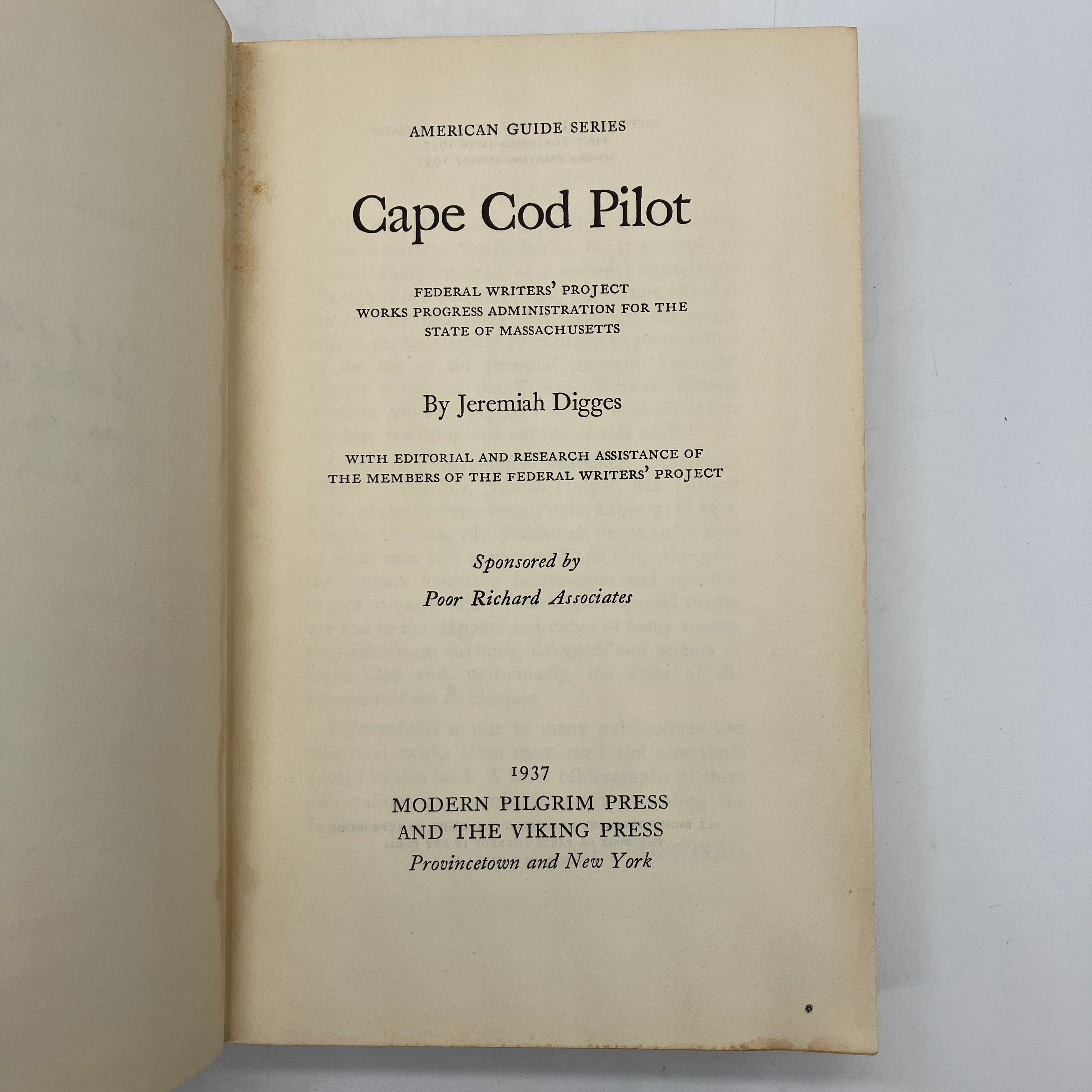 Modern Pilgrim Press & The Viking Press, 1937. Cloth bound hardcover with dust jacket of Cape Cod Pilot by Jeremiah Digges.