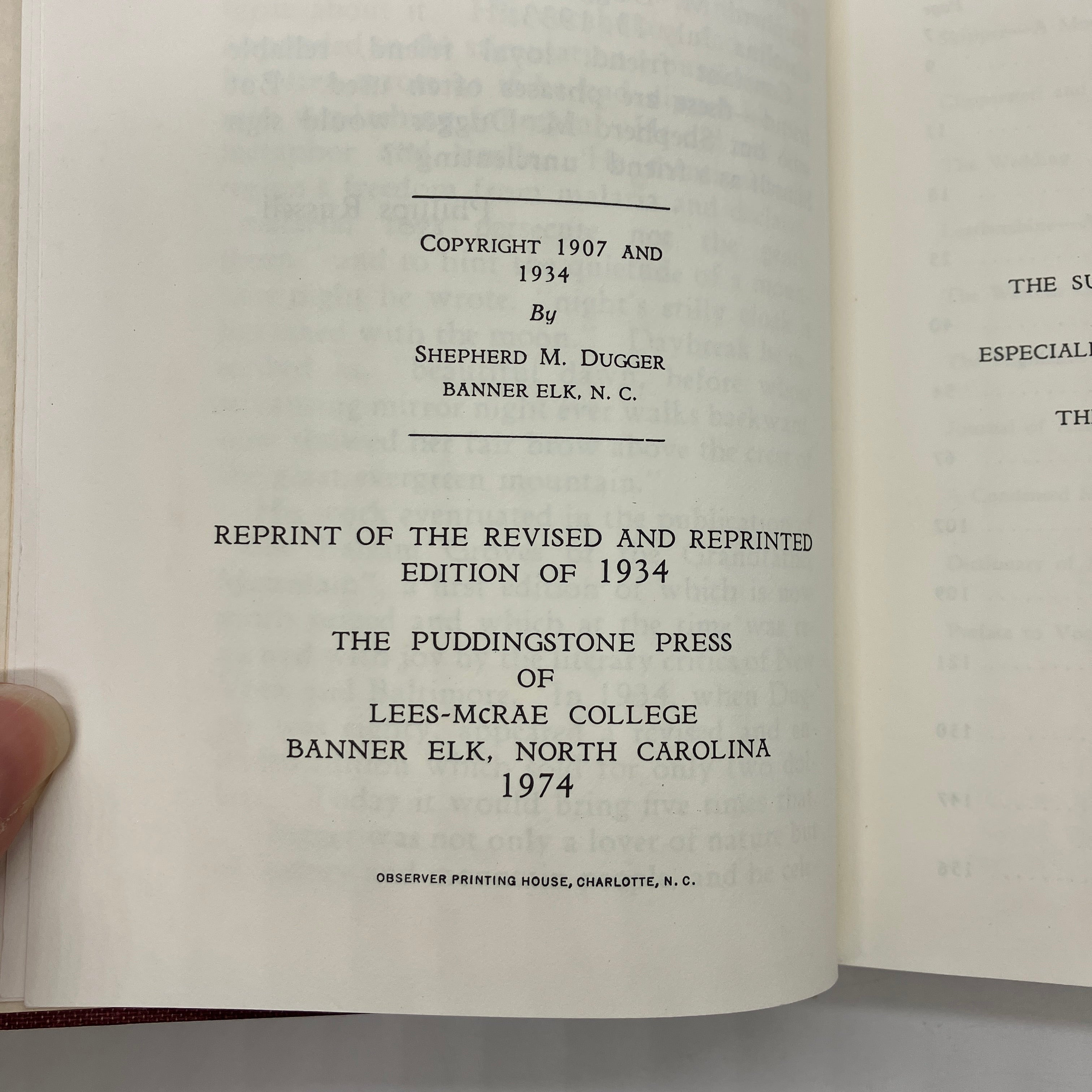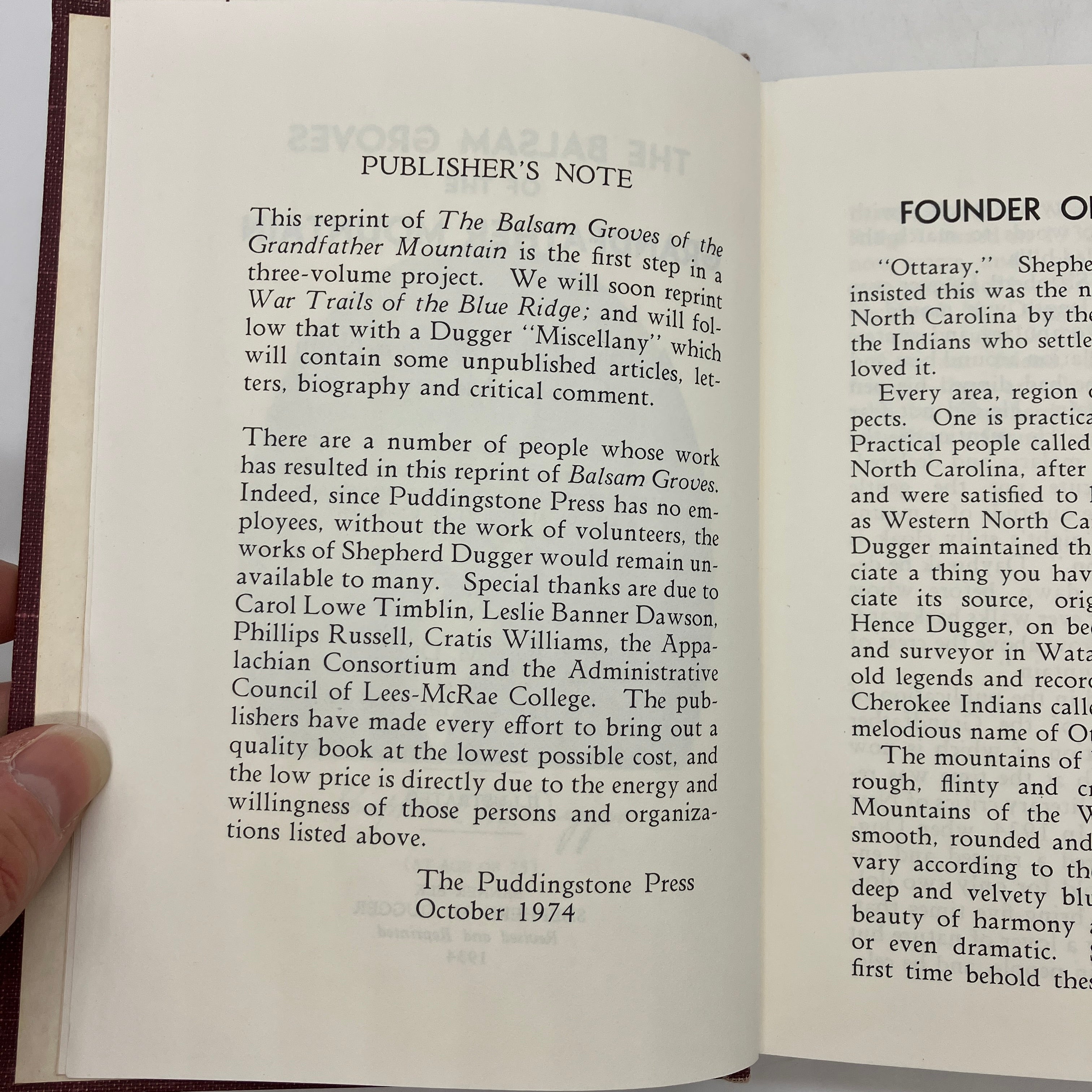 The Puddingstone Press, 1974. Cloth bound hardcover of The Balsam Groves of the Grandfather Mountain: A Tale of the Western North Carolina Mountains by Shepherd Dugger.