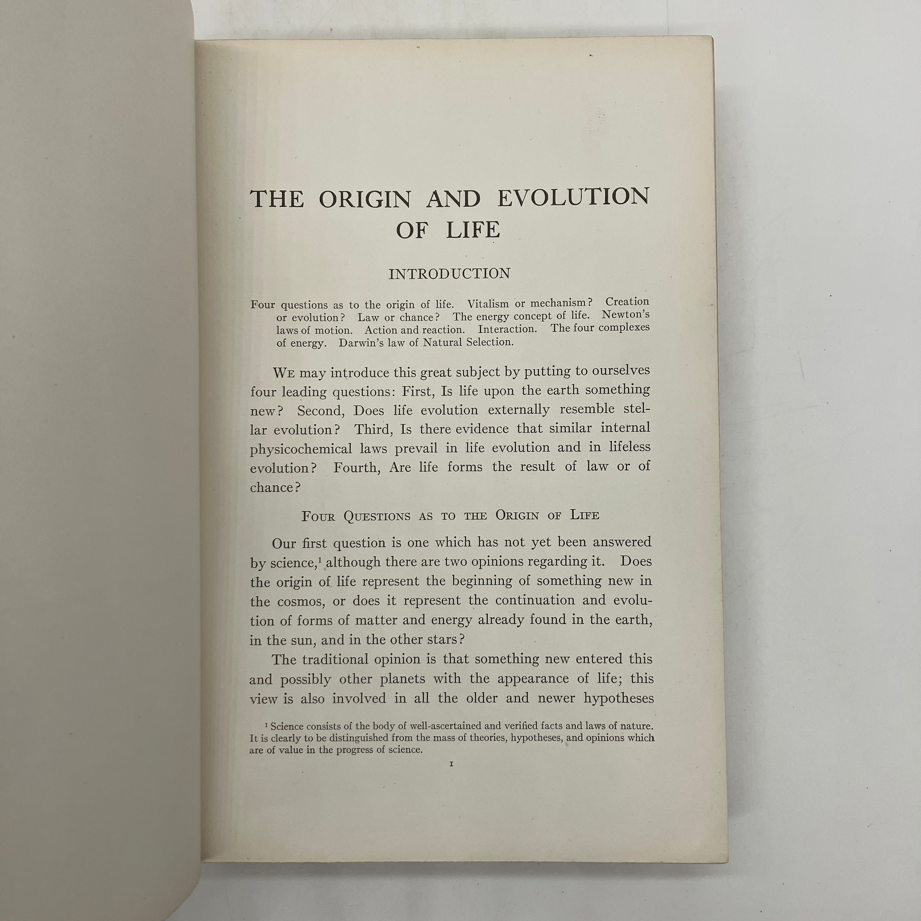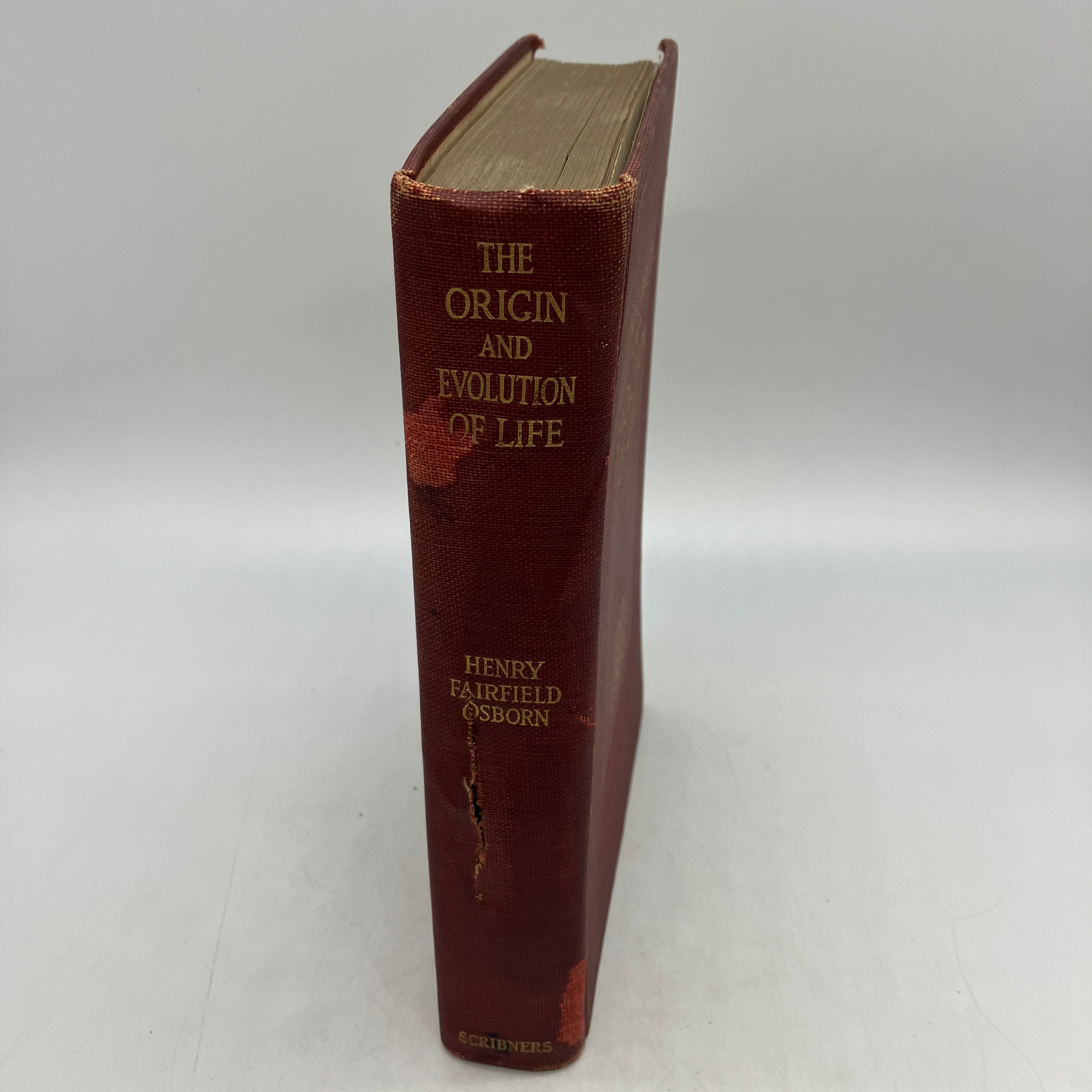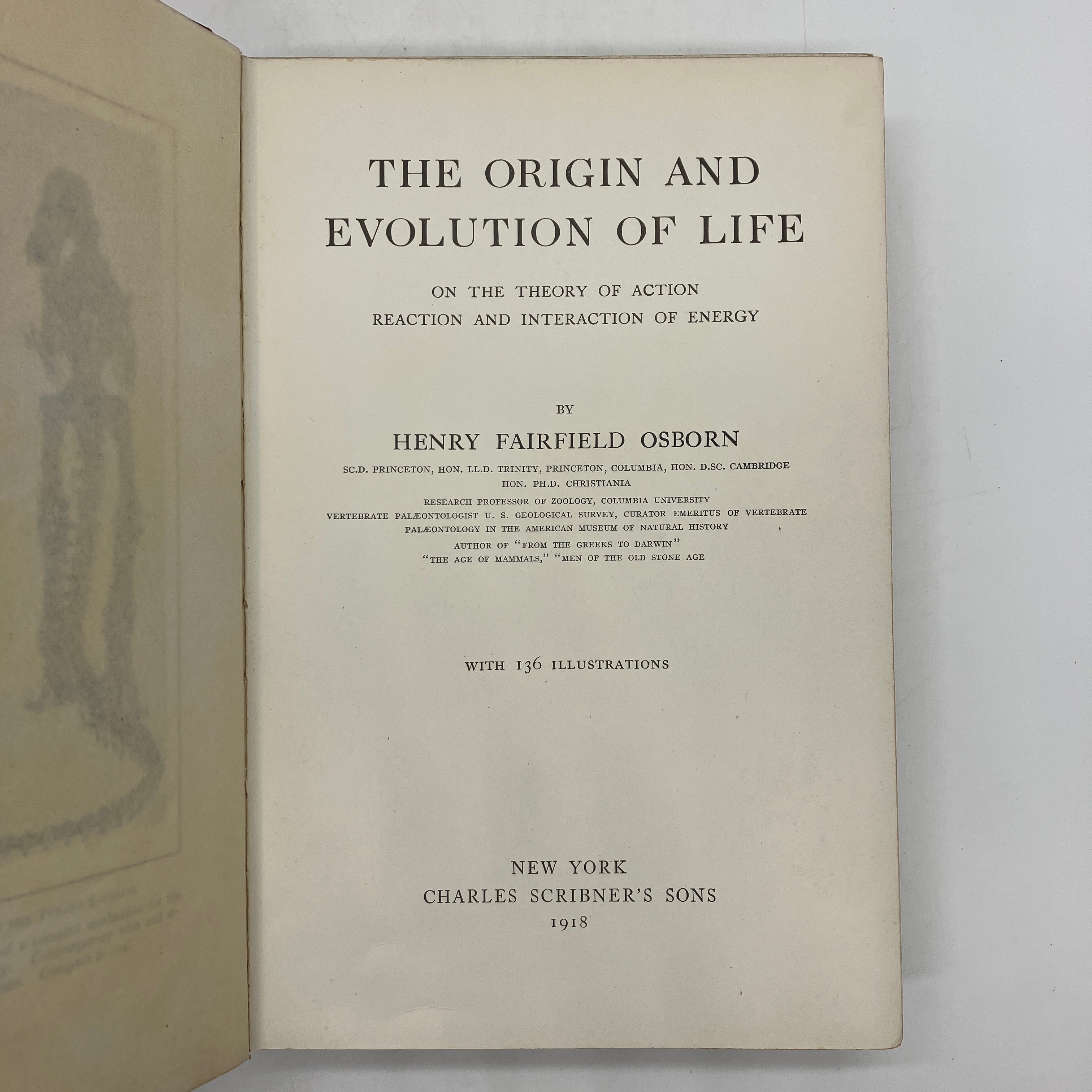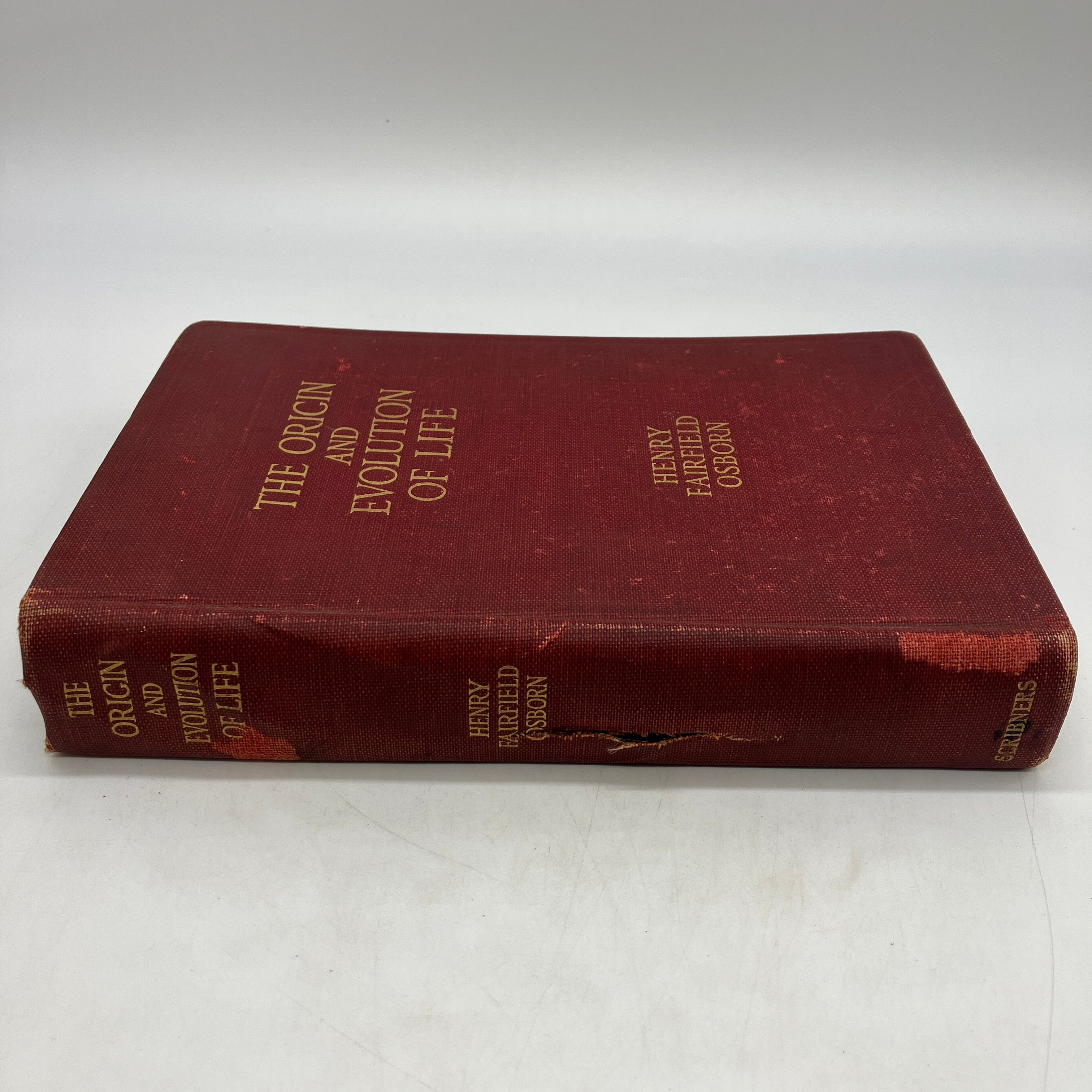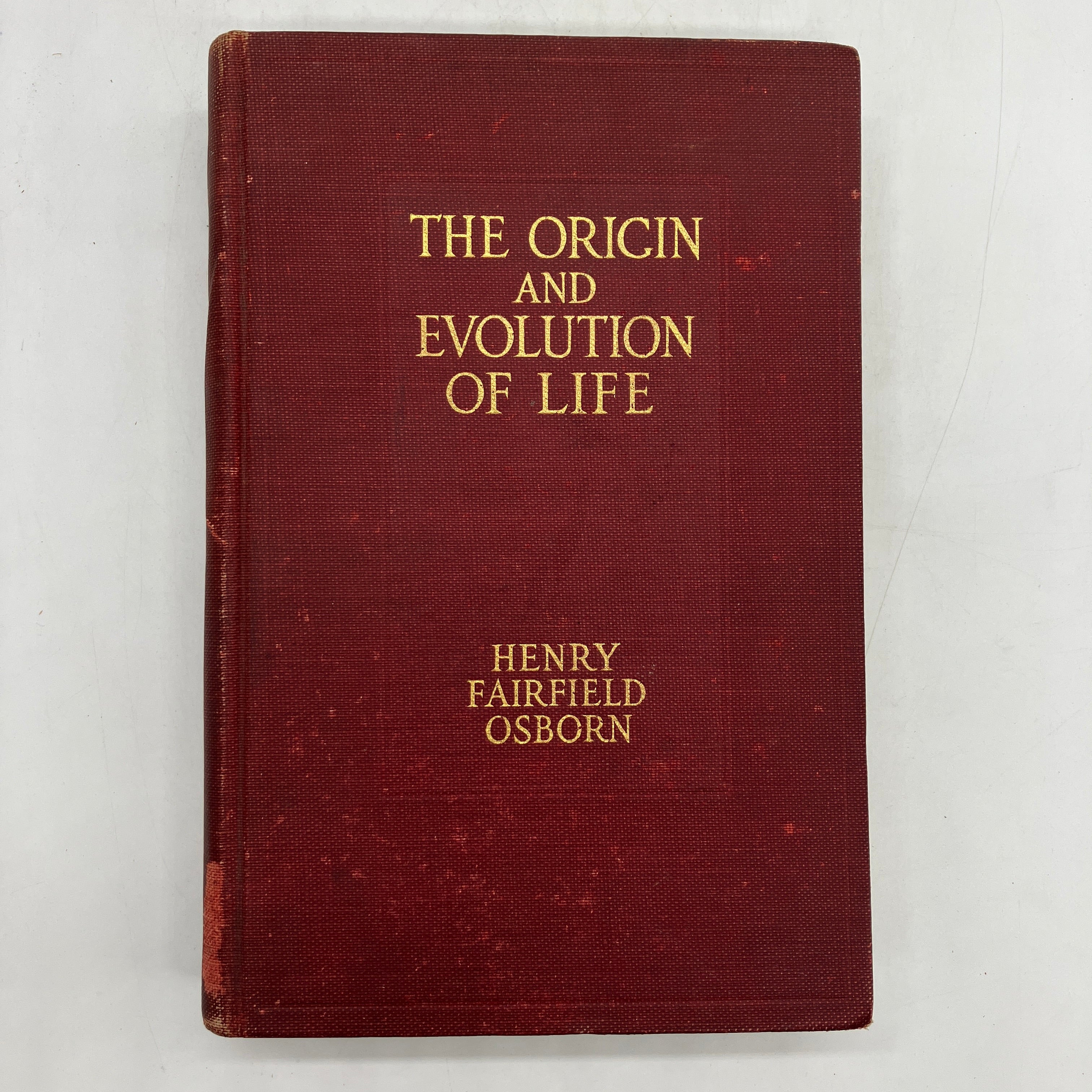 Charles Scribner's Sons, 1918. Cloth bound hardcover of The Origin and Evolution of Life: On the Theory of Action, Reaction and Interaction of Energy by Henry Osborn.