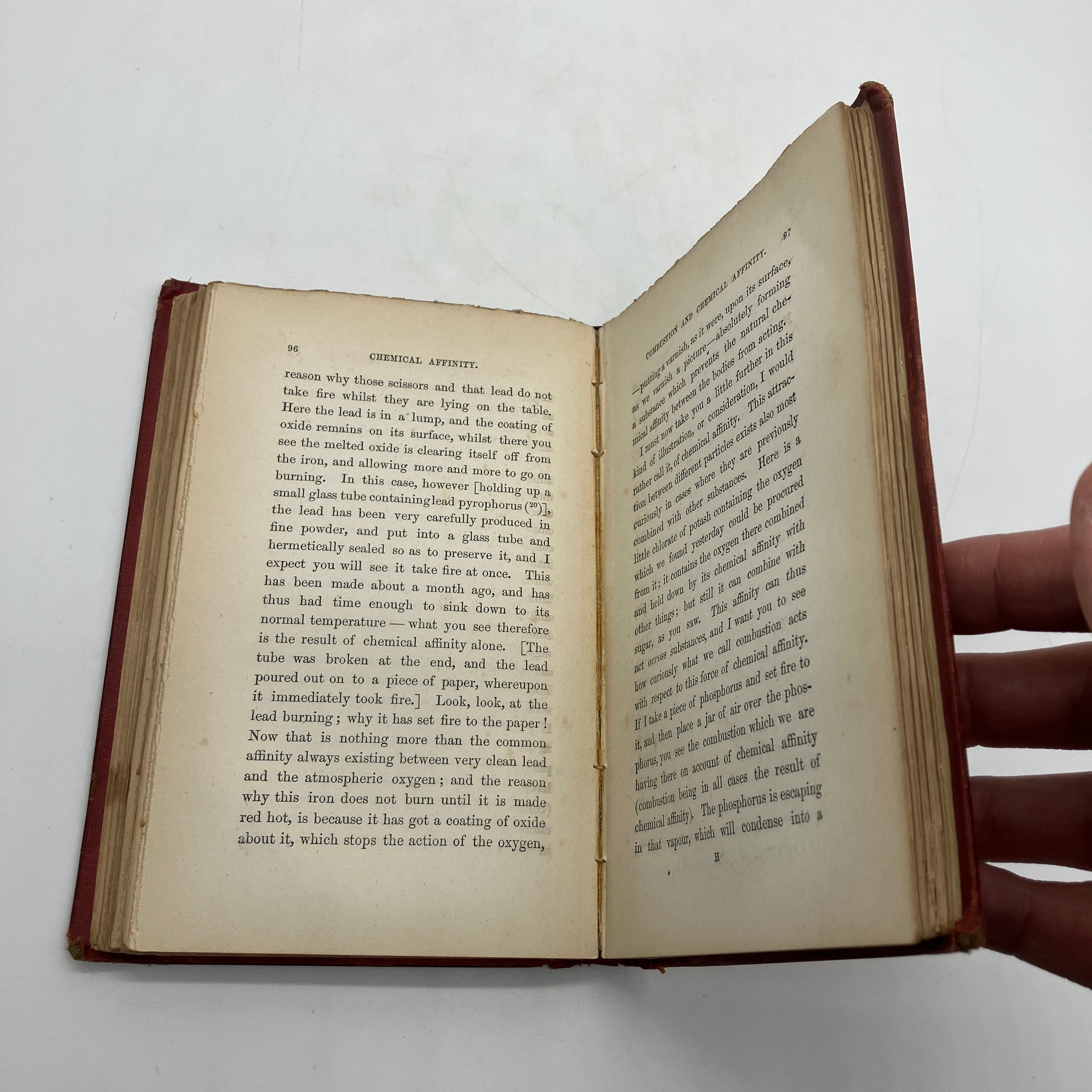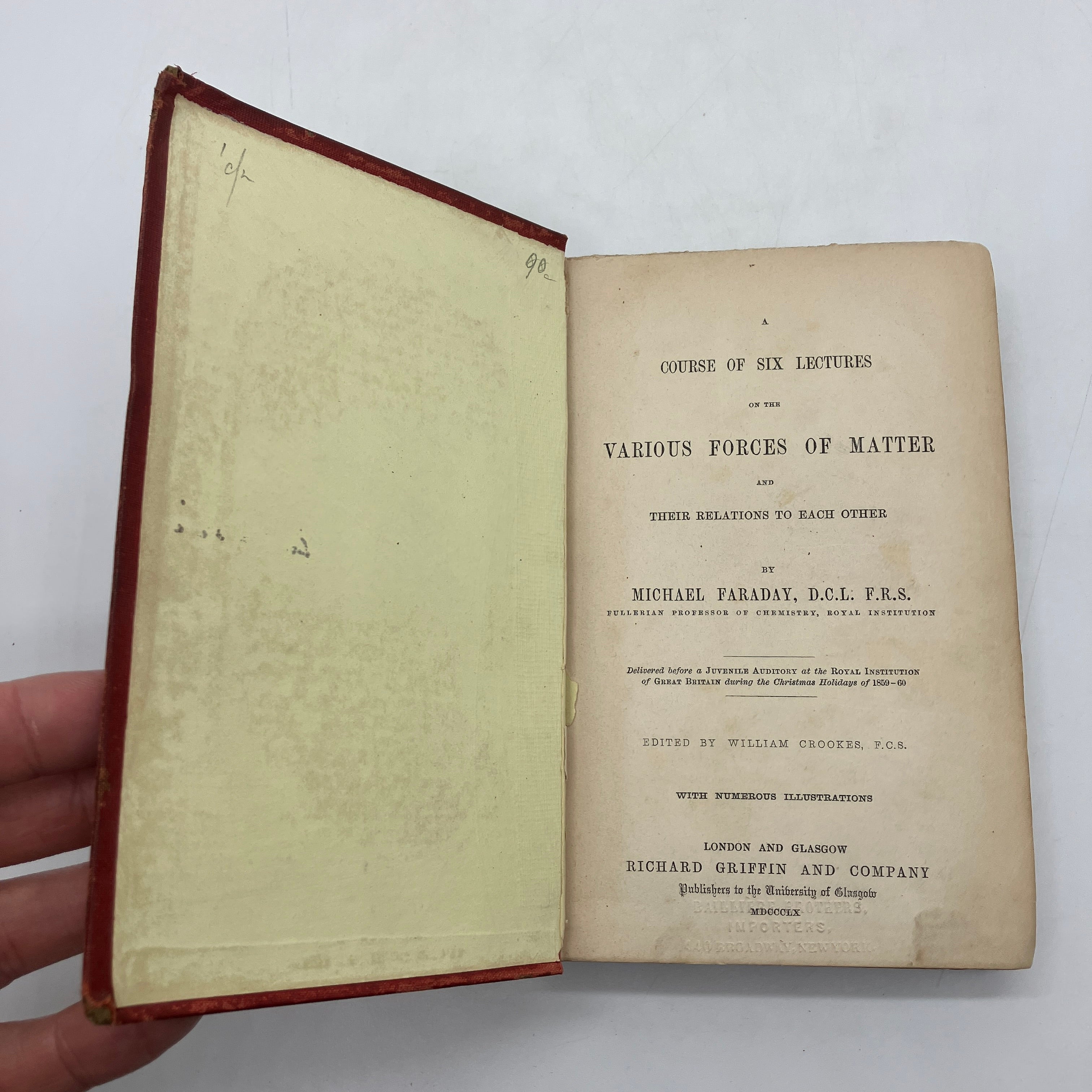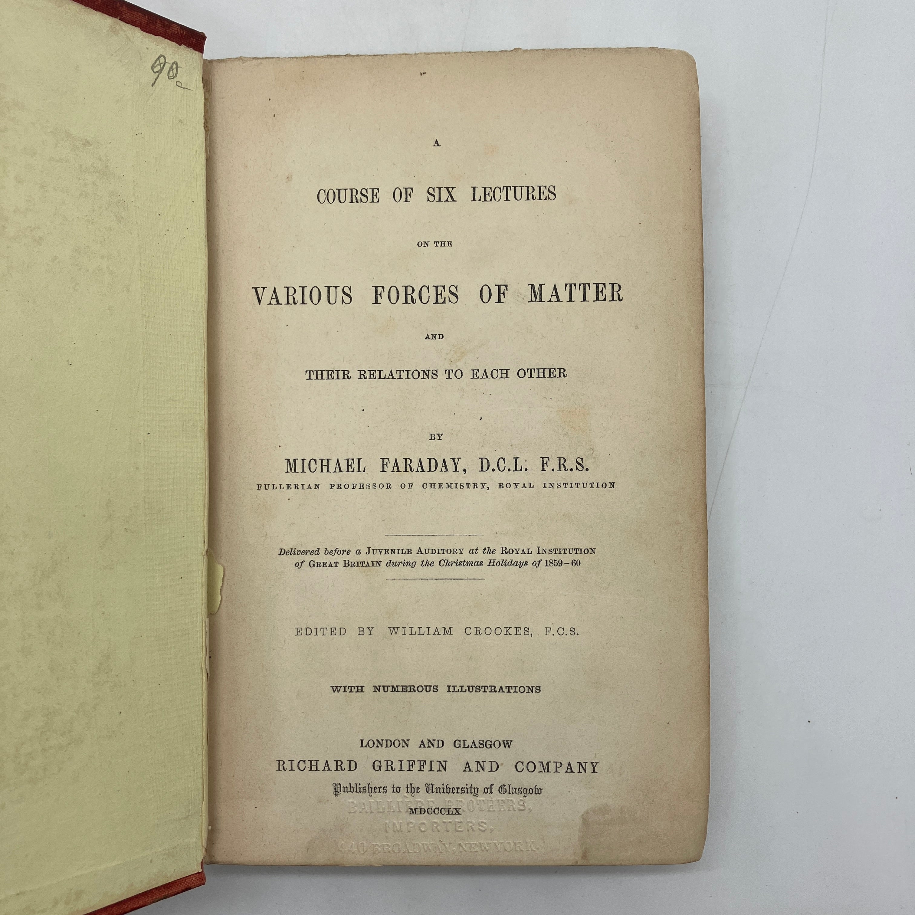 Richard Griffin and Company, 1860. First edition antiquarian cloth bound hardcover of A Course of Six Lectures on the Various Forces of Matter and Their Relations to Each Other by Michael Faraday.