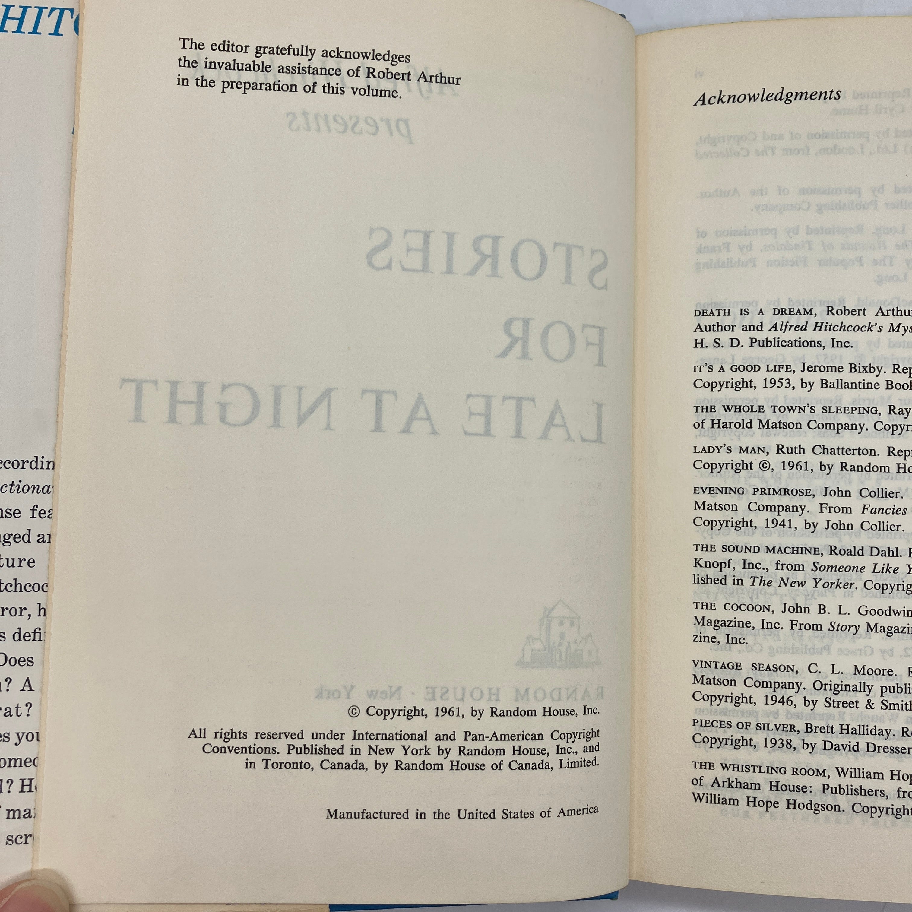 Random House, 1961. Book club edition hardcover with dust jacket of Alfred Hitchcock Presents Stories for Late at Night by Ray Bradbury, Roald Dahl & More.