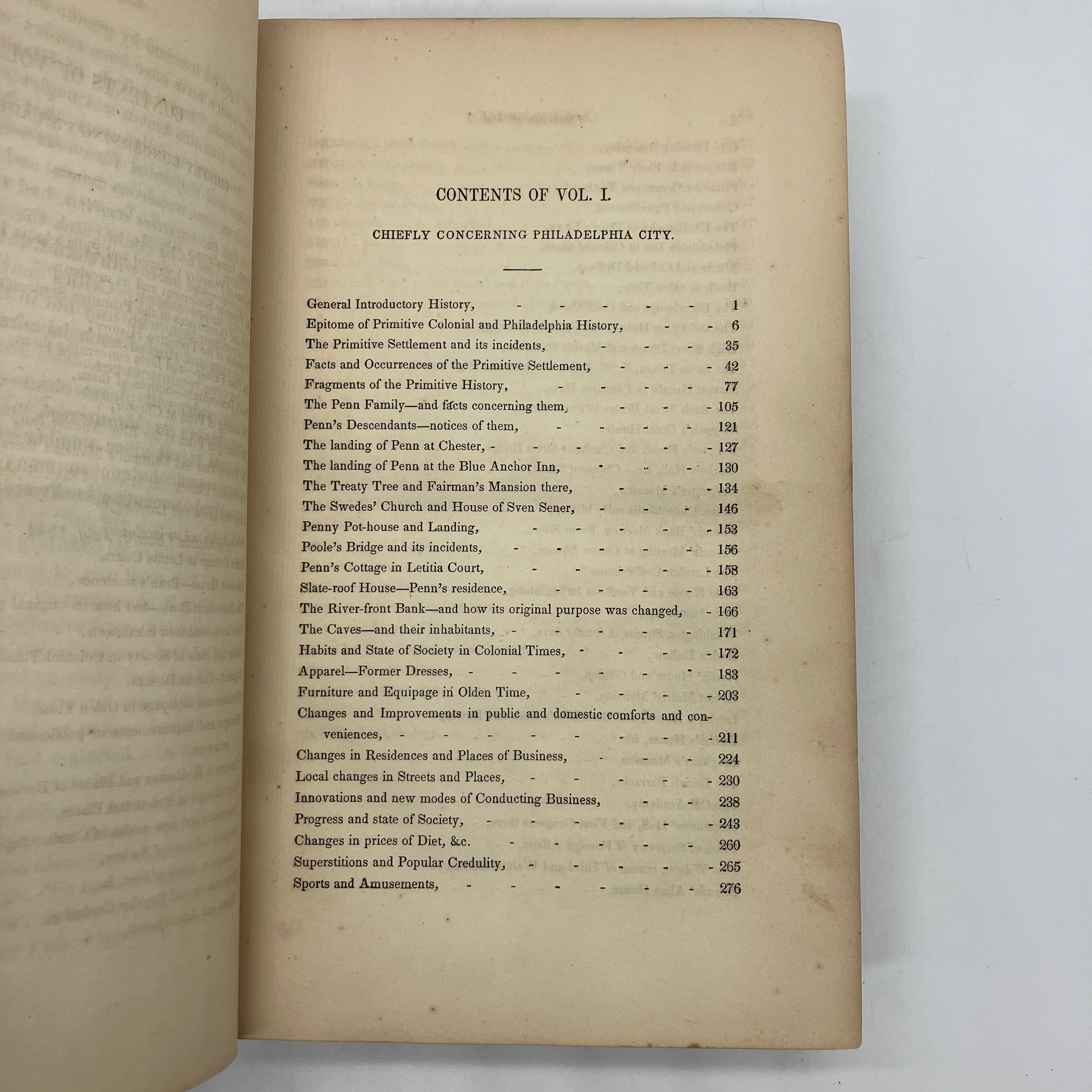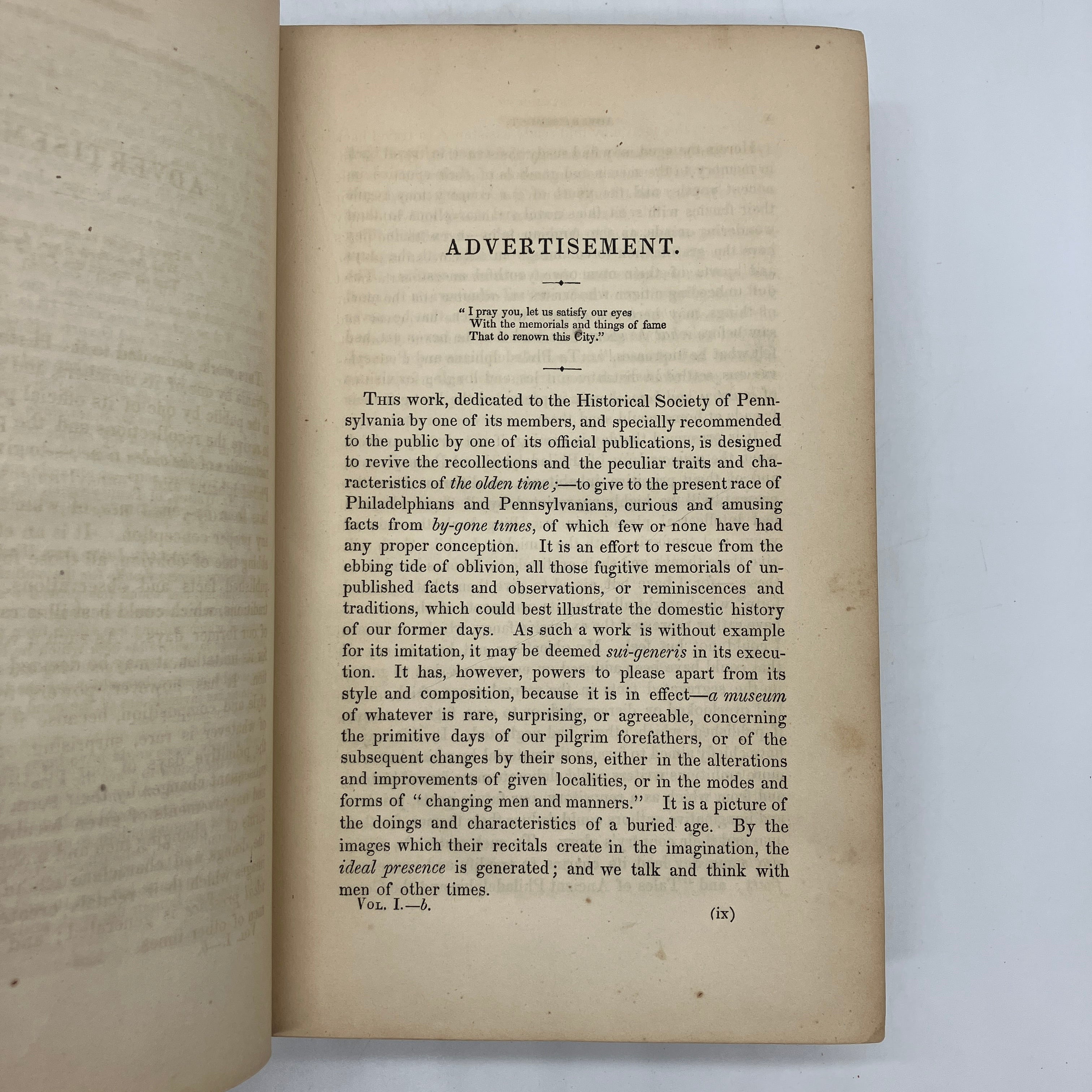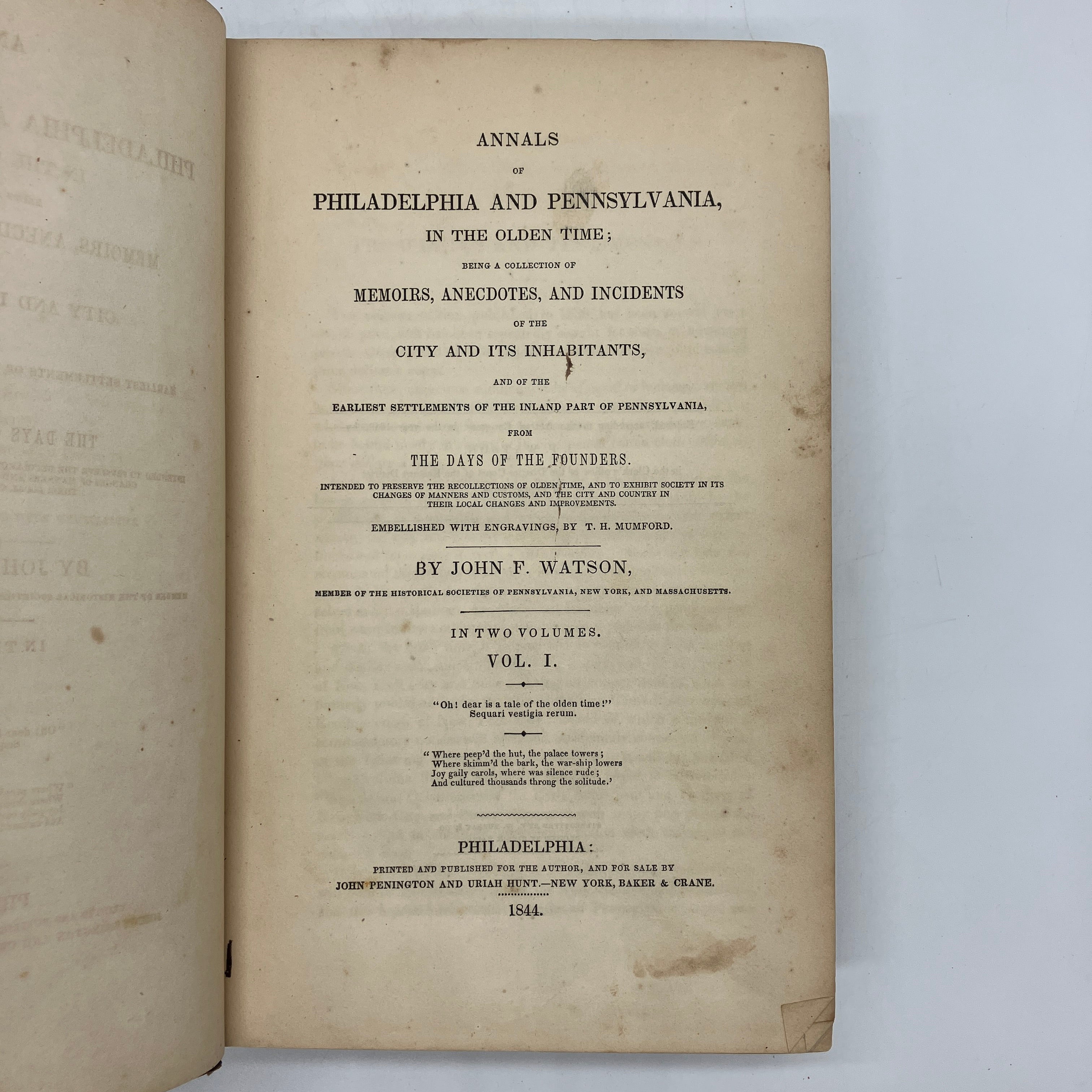 John Watson, 1844. Volume 1 only of a 2 volume set. antiquarian cloth bound hardcover of Annals of Philadelphia and Pennsylvania, In the Olden Time; Being A Collection of Memoirs, Anecdotes, and Incidents of the City and Its Inhabitants, And of the Earliest Settlements of the Inland Part of Pennsylvania, From the Days of the Founders, Volume 1 by John Watson.