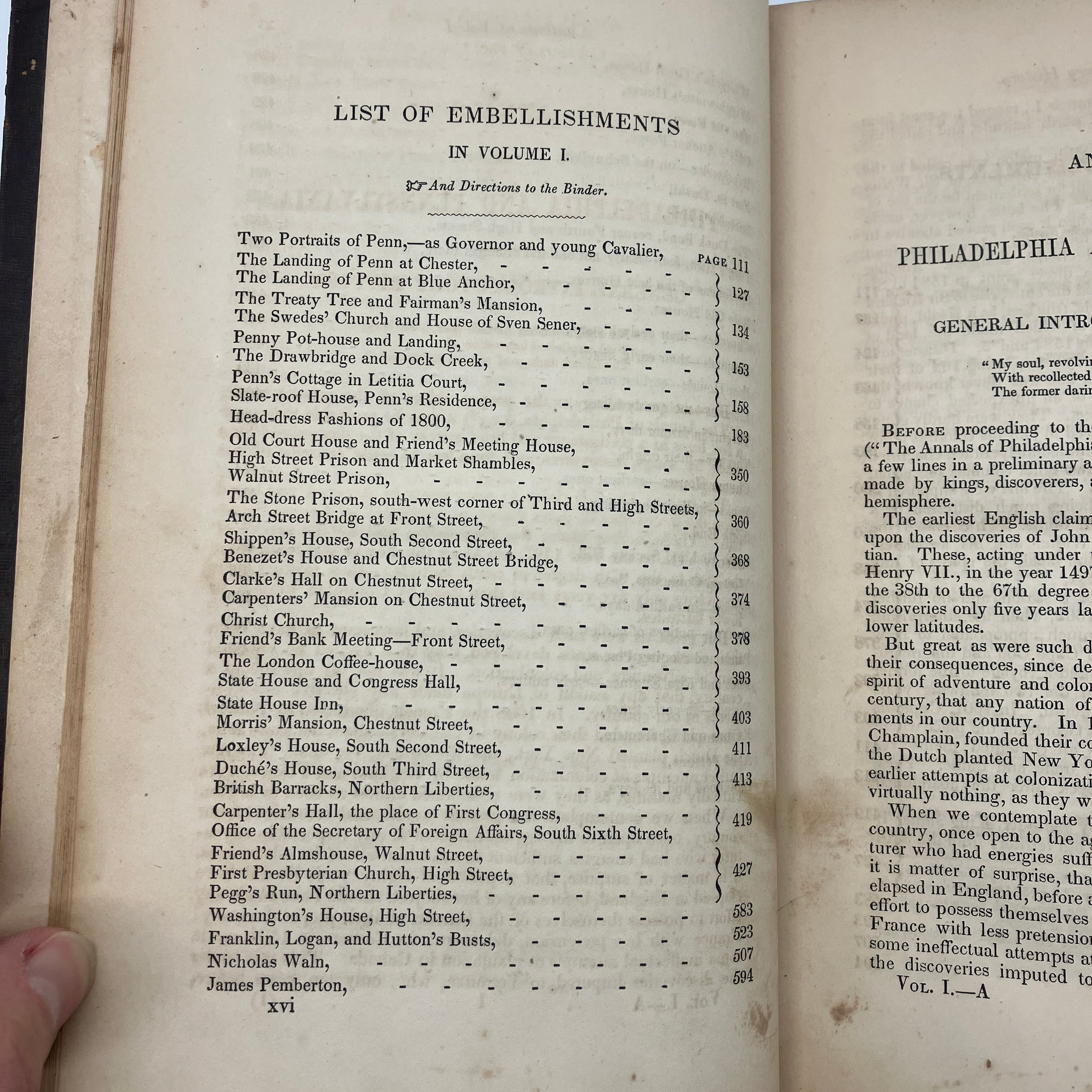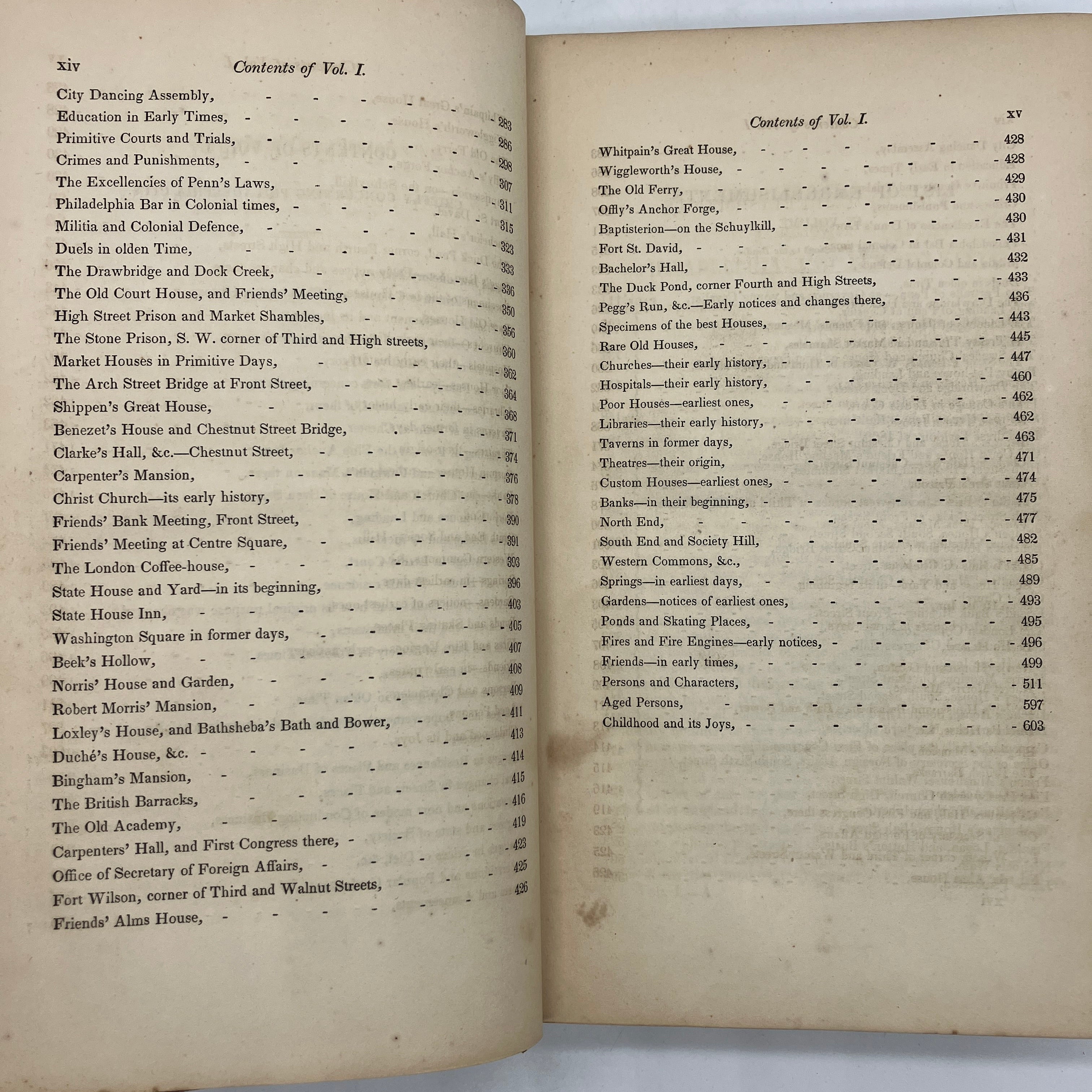 Meticulously documents the history, traditions, and early life of Philadelphia and the broader state of Pennsylvania. Watson compiled personal recollections, interviews with long-time residents, old documents, and drawings, in his mission to preserve the history of the region during its colonial and early post-Revolutionary periods.