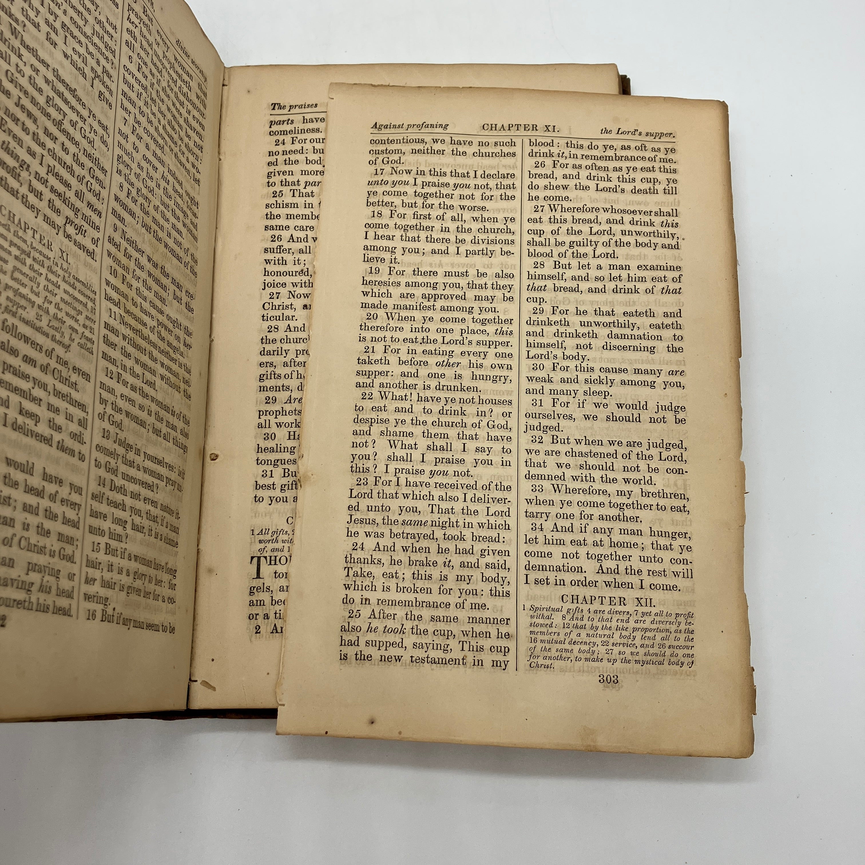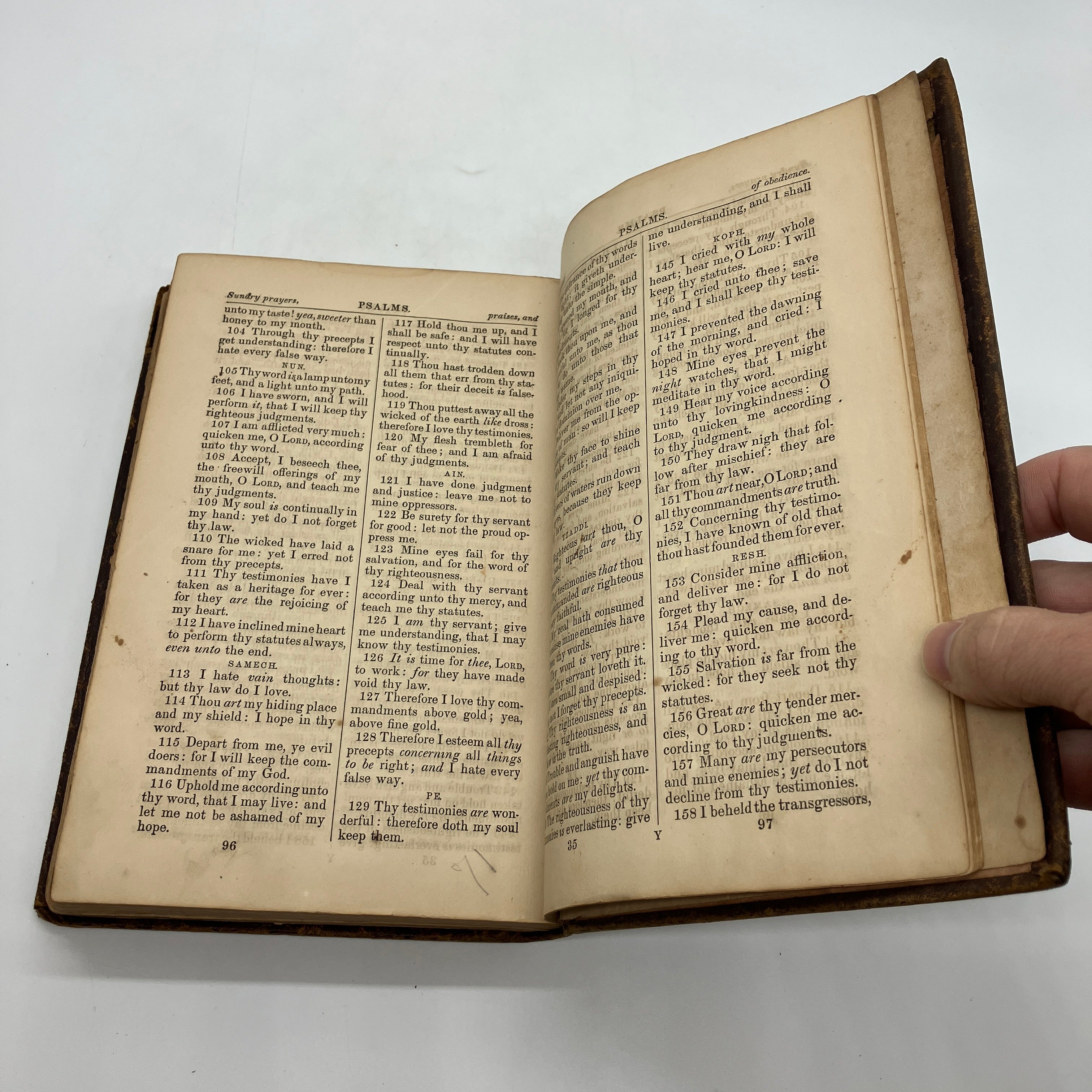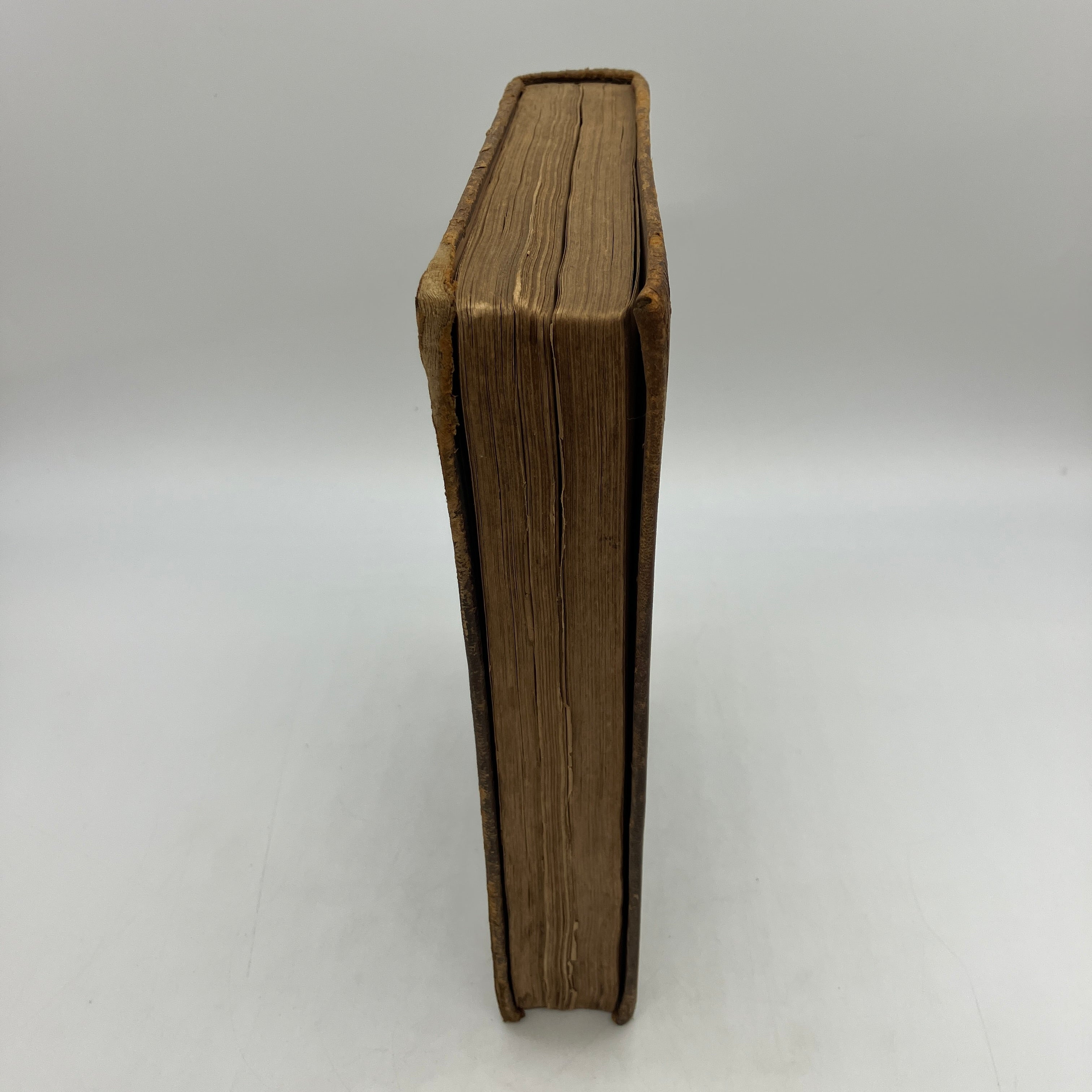 Good condition. Solid binding. Covers very worn and scuffed. 2 pages (p. 117 & 303) are detached from the binding and loosely inserted in place. Front fly leaf is torn and partially detached but is currently attached. Some stains to the interior pages. One pencil marking found to the margin of Psalms. Previous owner gift inscription, dated 1869, to the front fly leaf. Pages crisp. Solid antiquarian book with shelf wear.