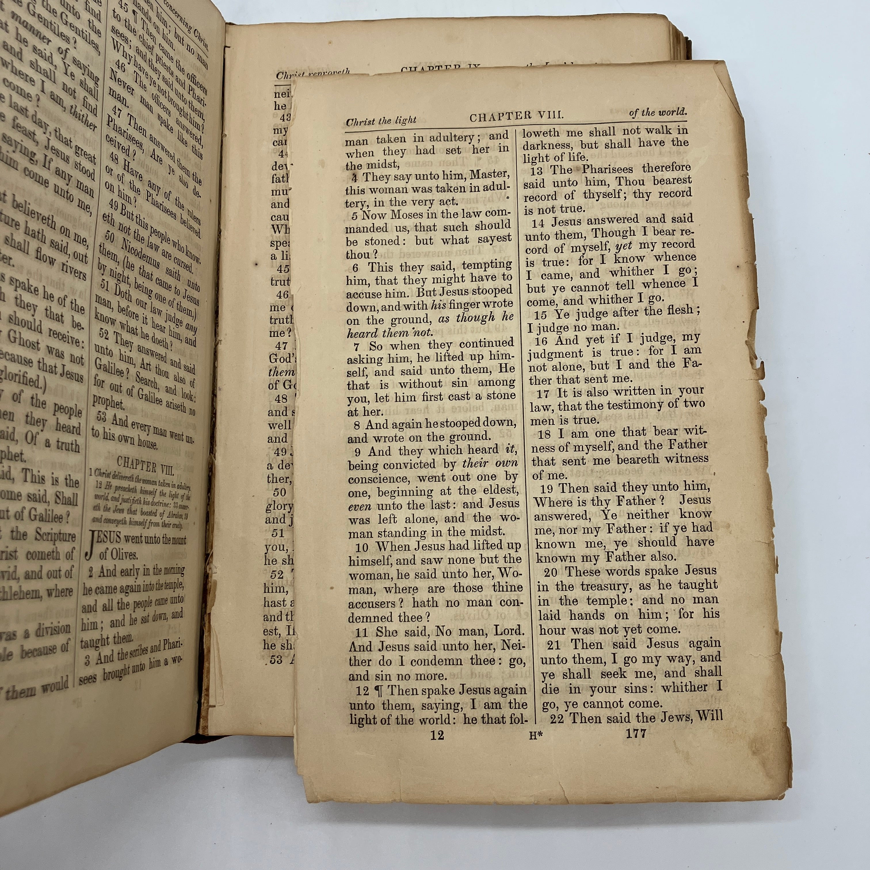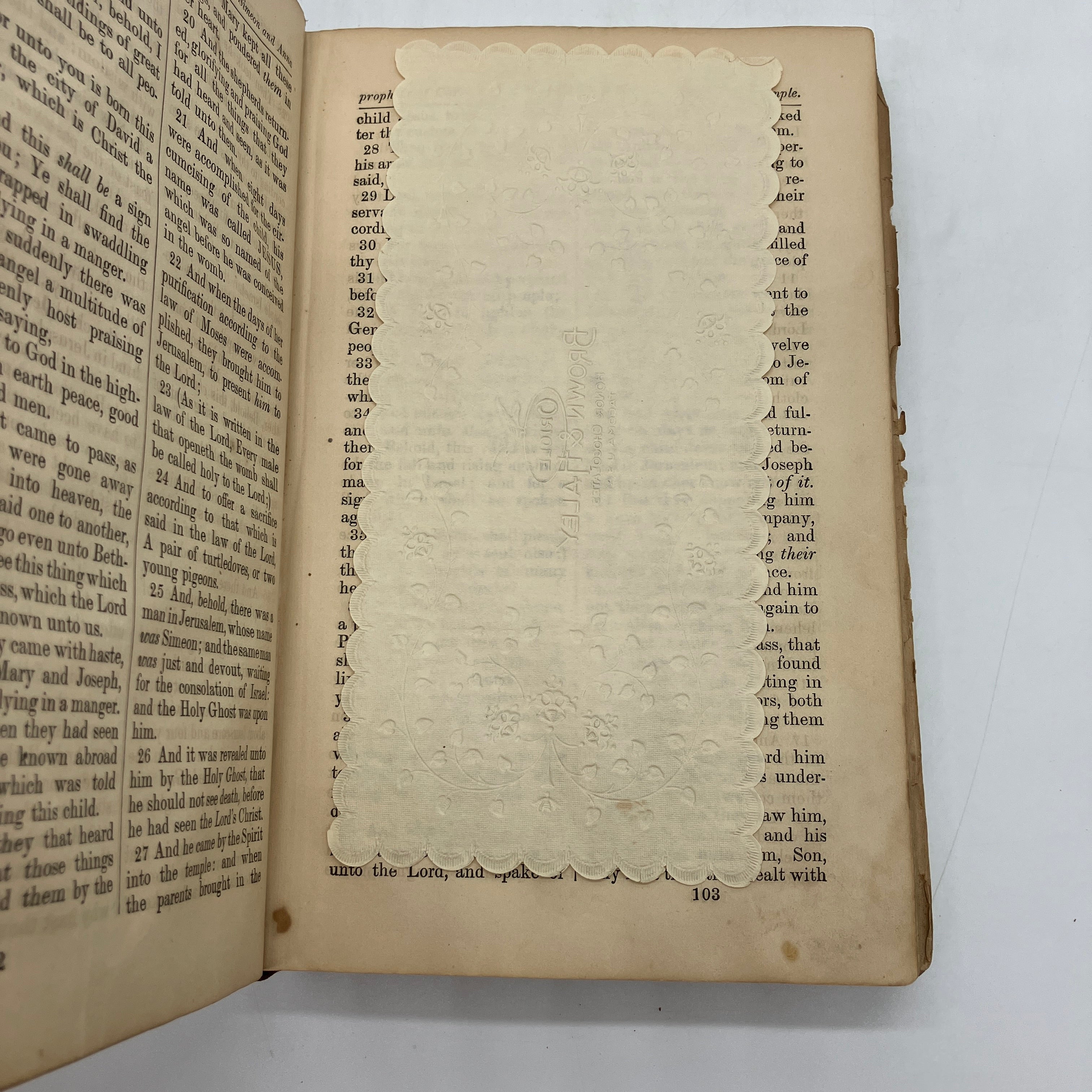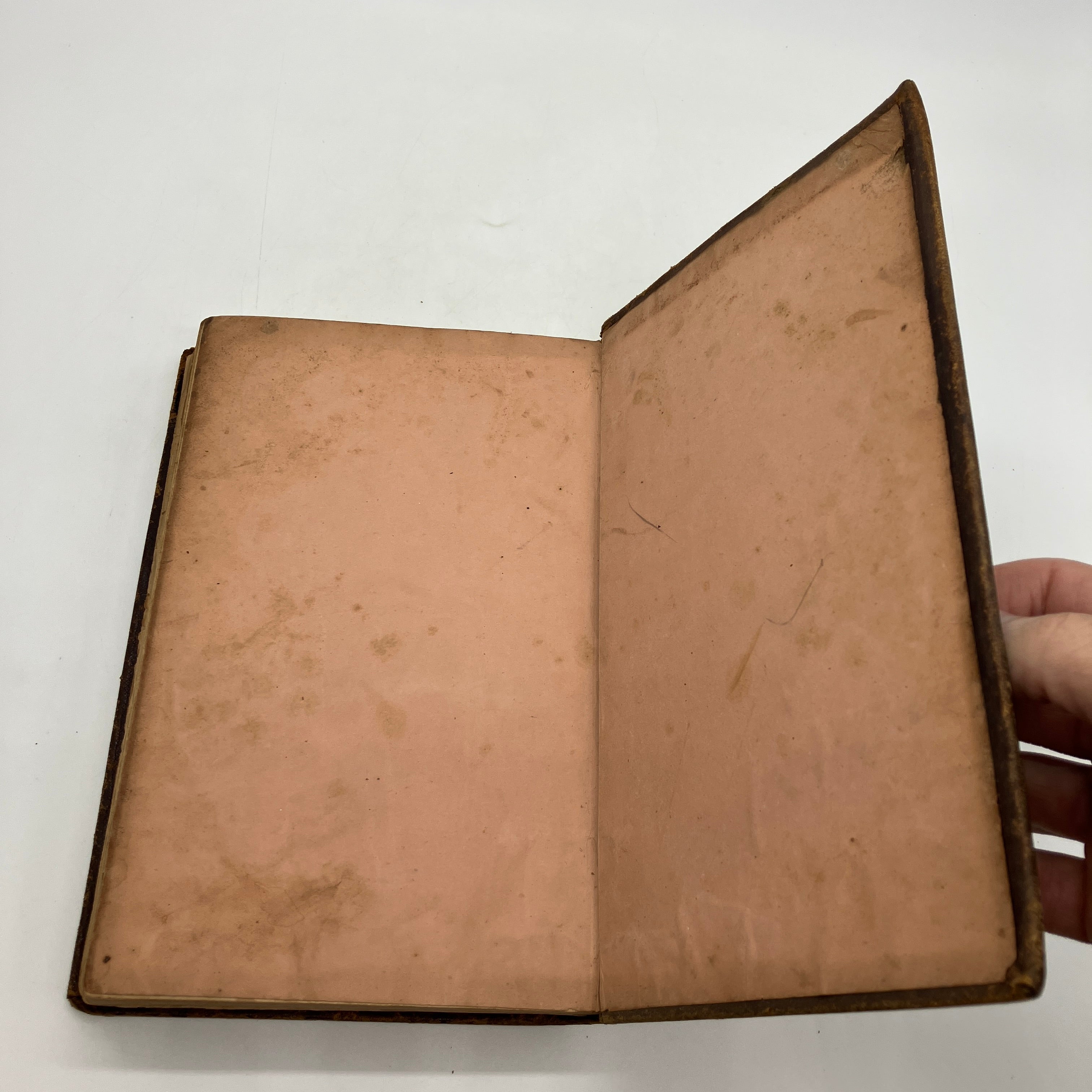 Good condition. Solid binding. Covers very worn and scuffed. 2 pages (p. 117 & 303) are detached from the binding and loosely inserted in place. Front fly leaf is torn and partially detached but is currently attached. Some stains to the interior pages. One pencil marking found to the margin of Psalms. Previous owner gift inscription, dated 1869, to the front fly leaf. Pages crisp. Solid antiquarian book with shelf wear.