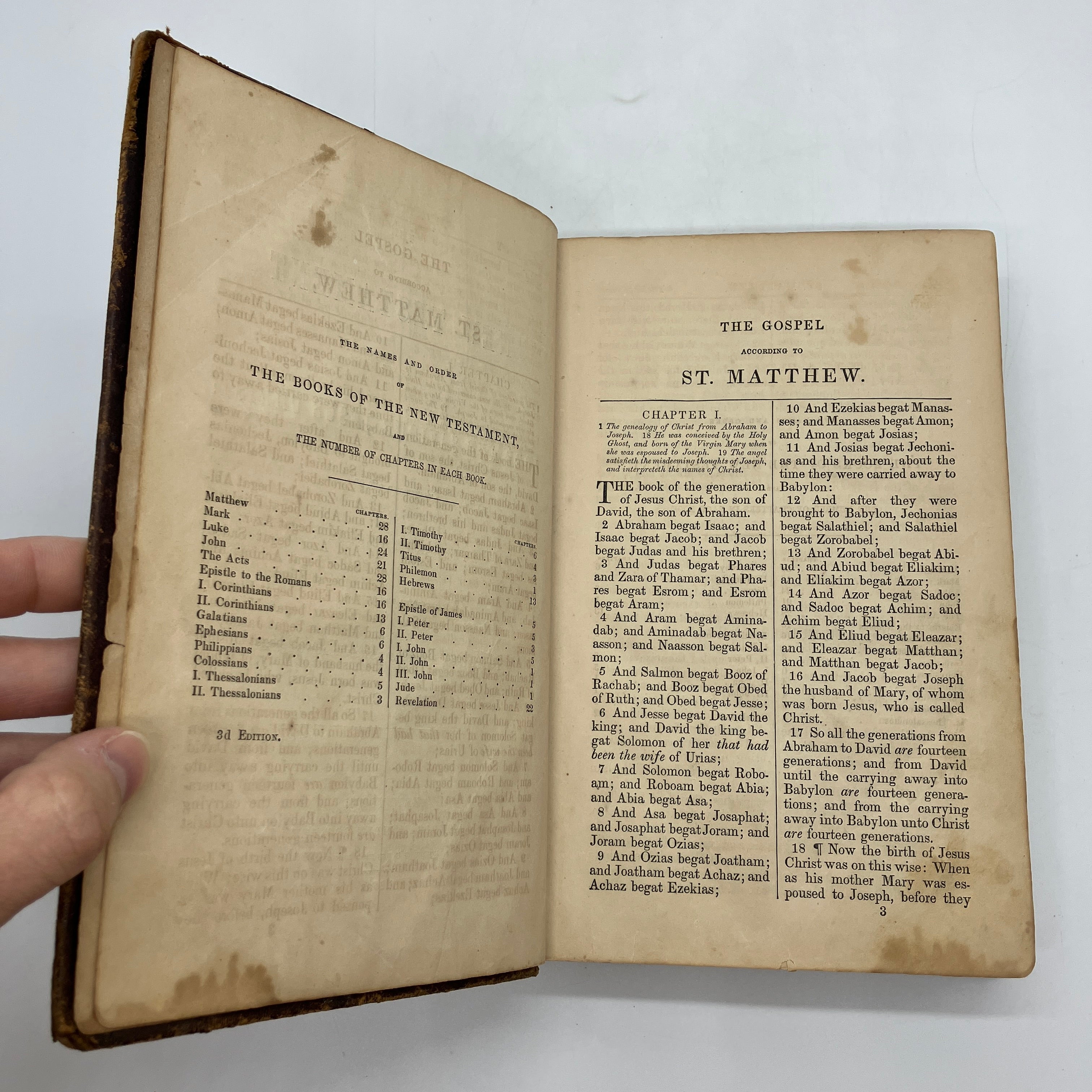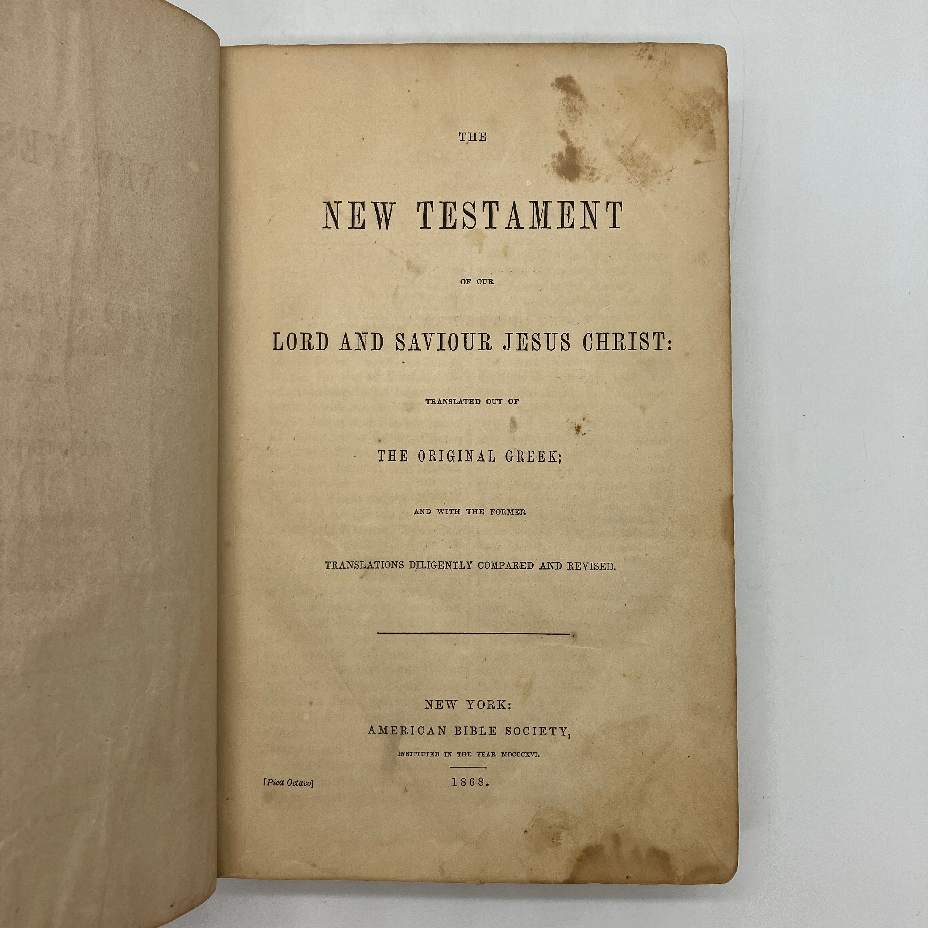 American Bible Society, New York, 1868. Antiquarian leather bound hardcover of The New Testament of Our Lord and Saviour Jesus Christ: Translated out of the Original Greek; and with the Former Translations Diligently Compared and Revised by American Bible Society.