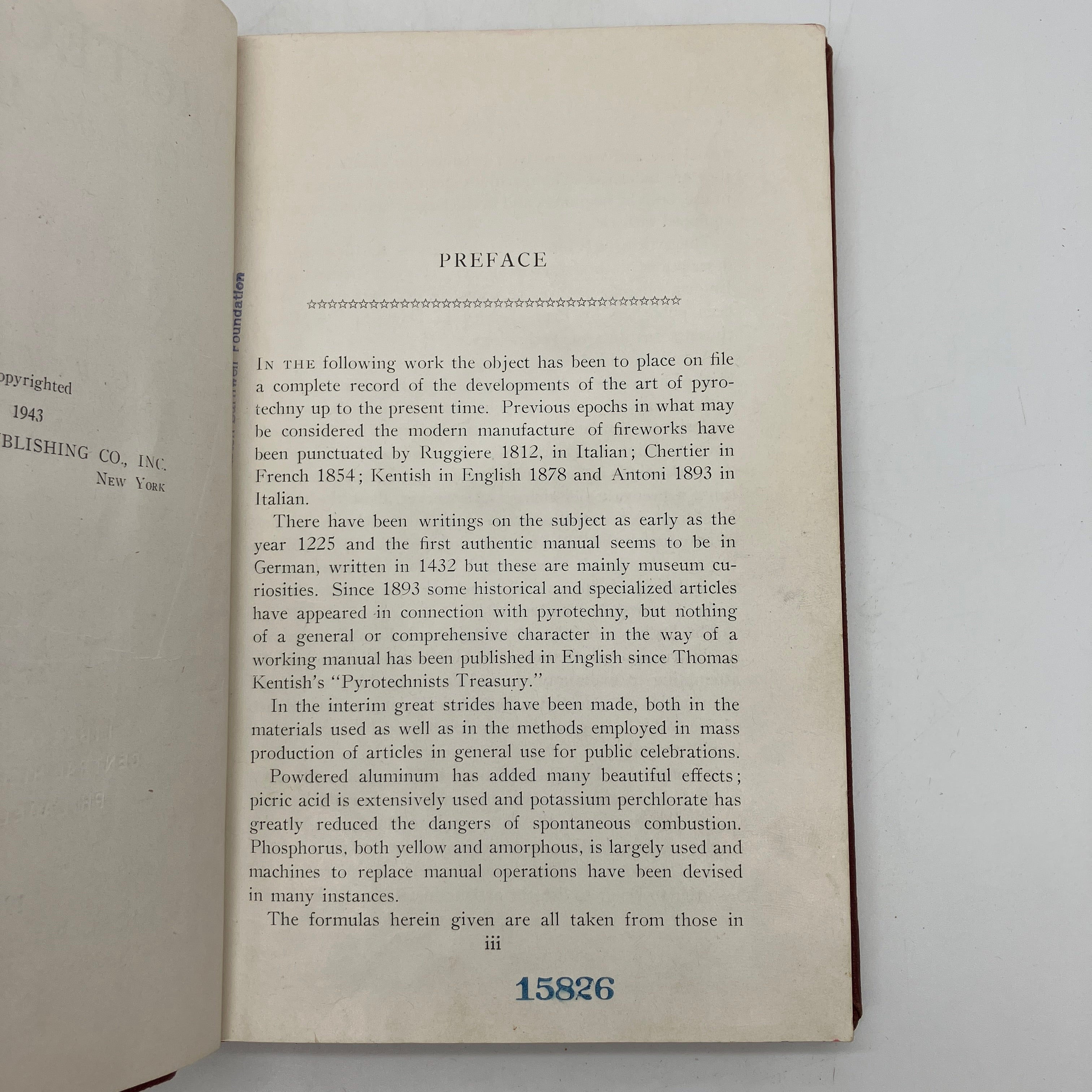 Chemical Publishing Co., 1943. Cloth bound hardcover of Pyrotechnics: Civil and Military by G.W. Weingart.