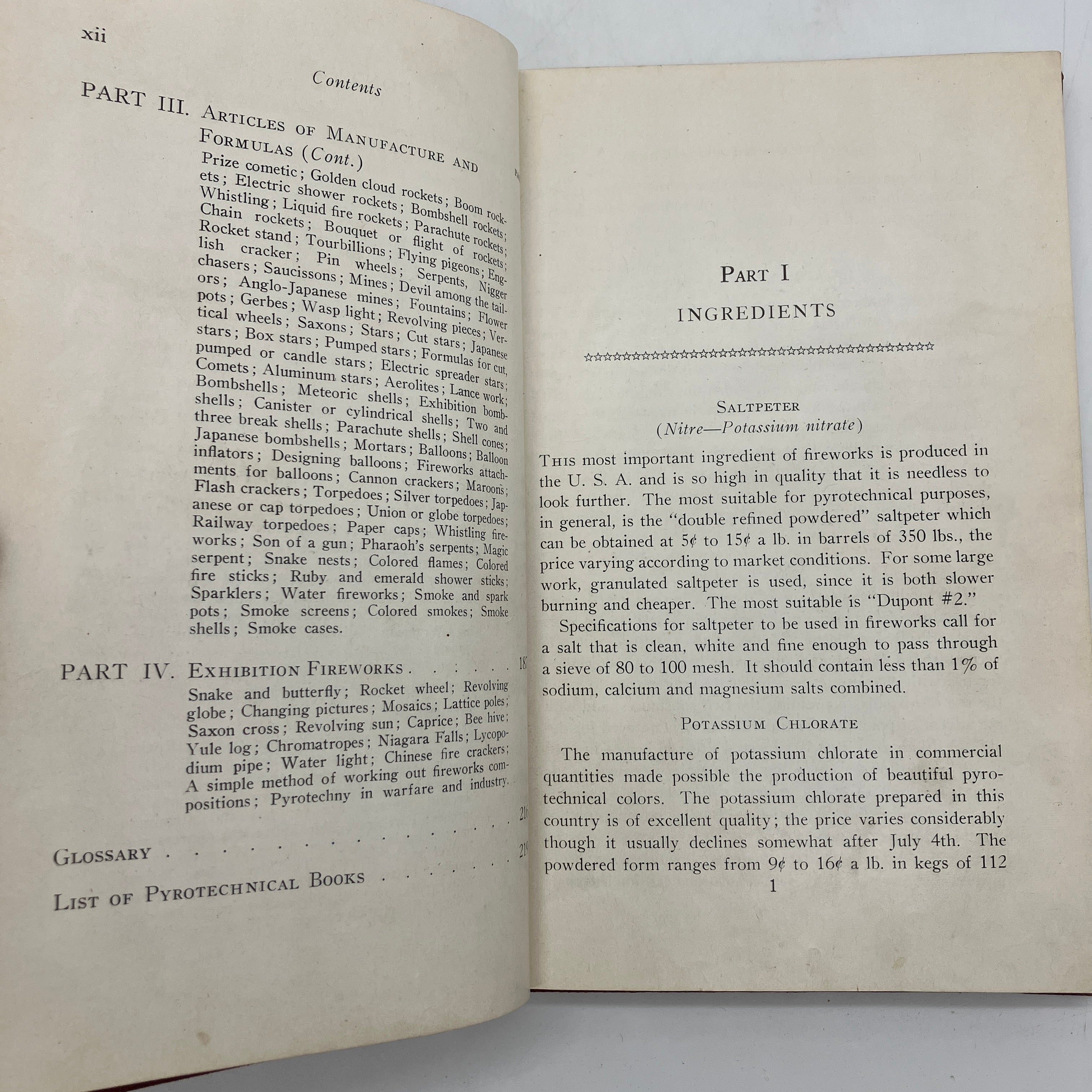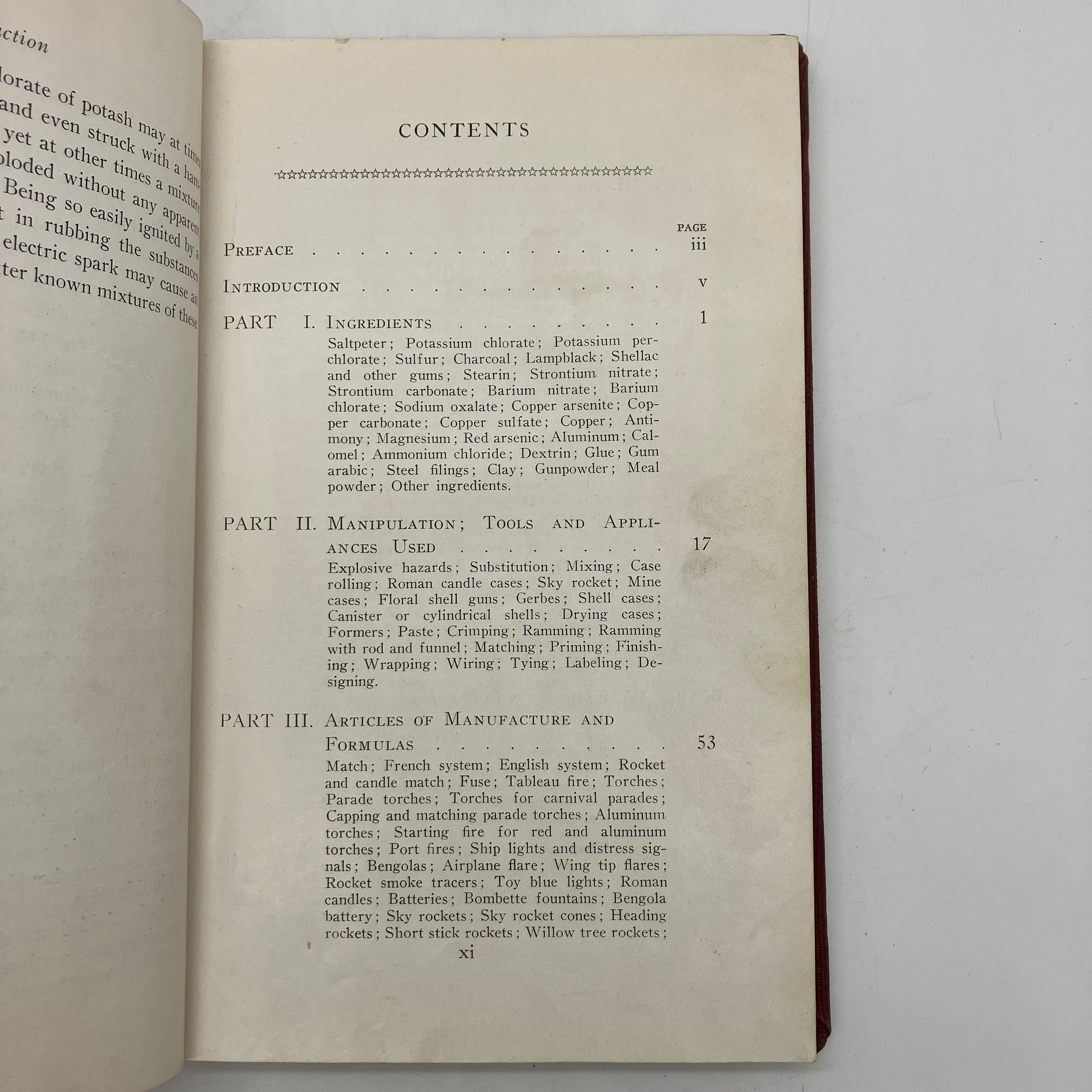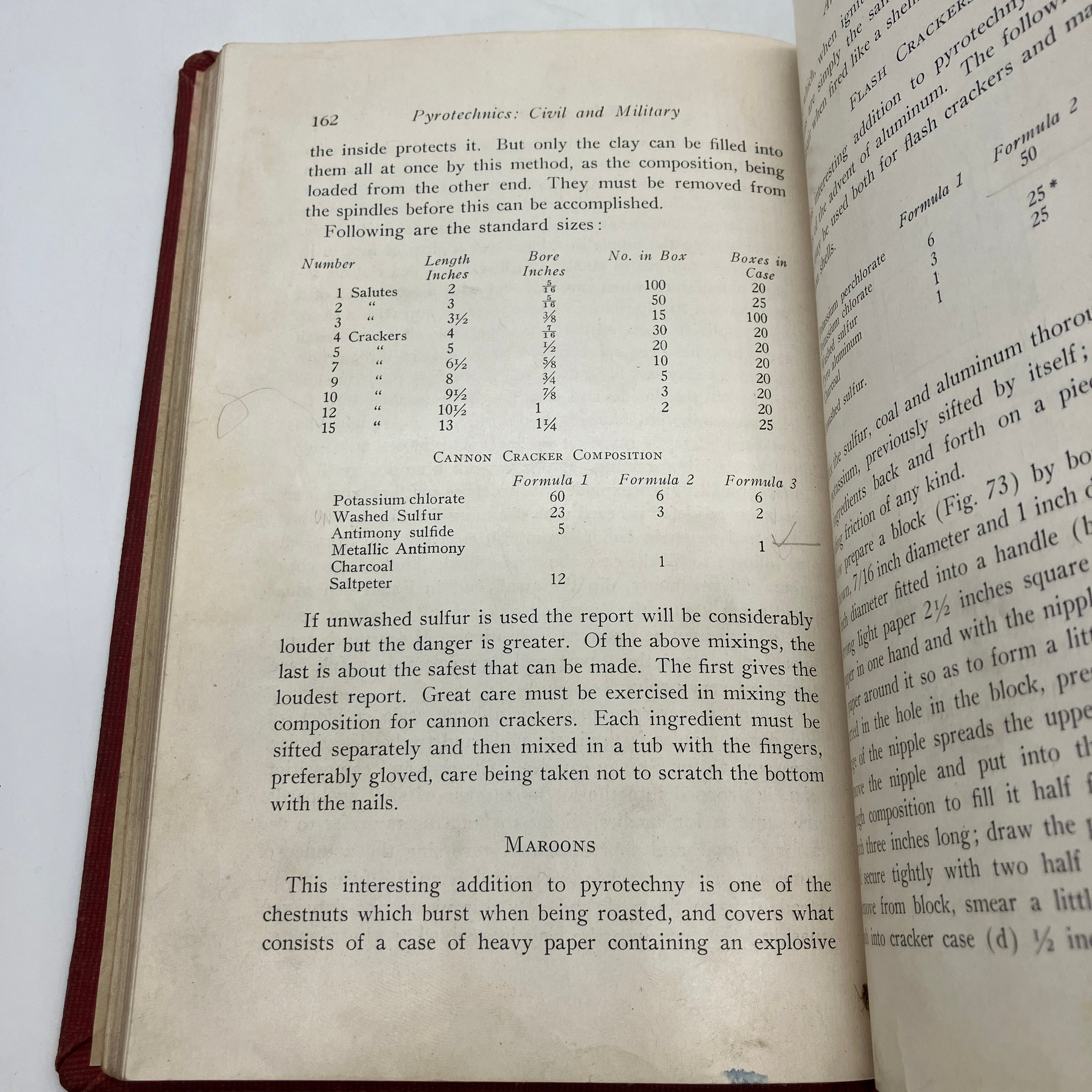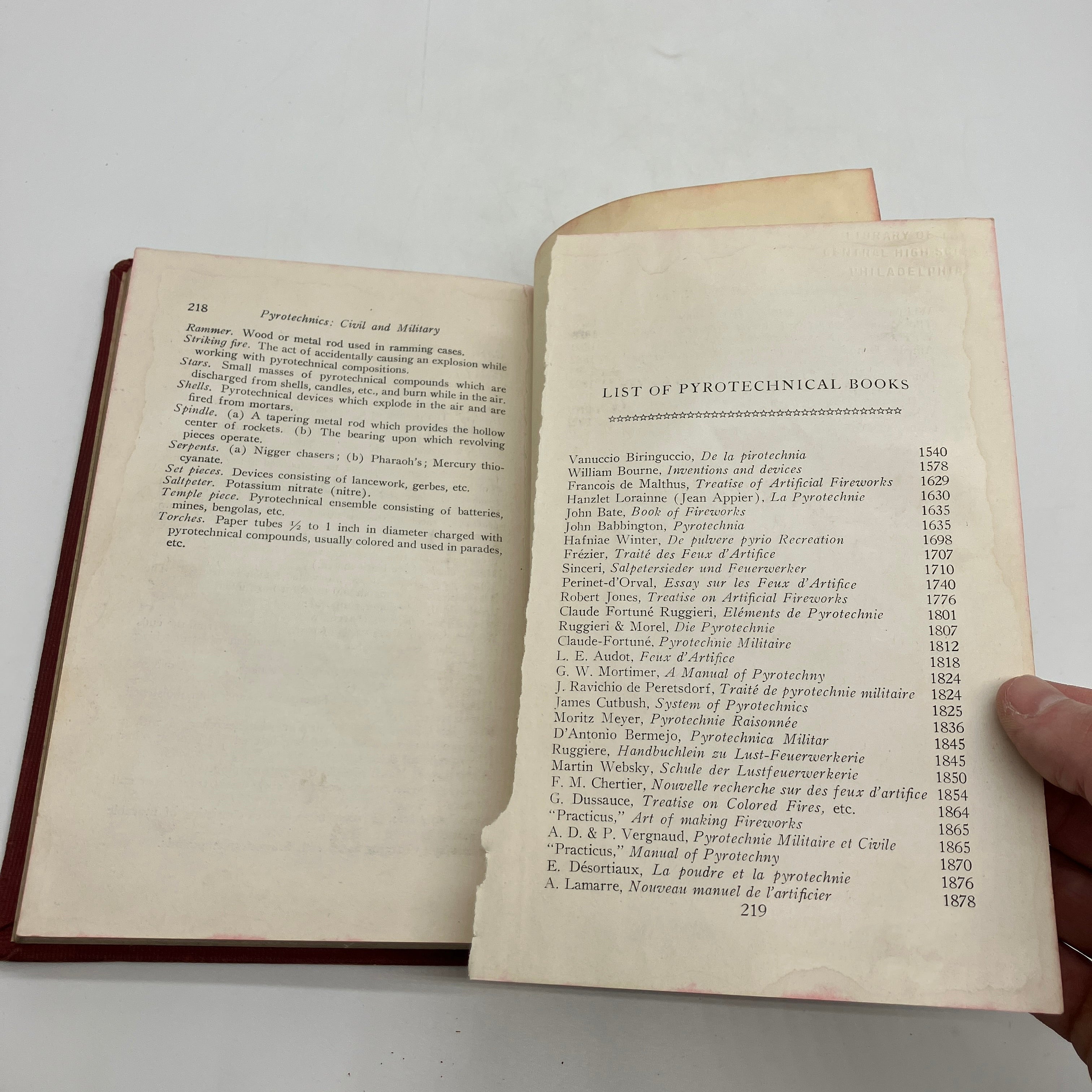 This volume is an expanded, revised version of Weingart's original 1937 manual, but it was notably re-titled Pyrotechnics: Civil and Military, shifting focus from recreational fireworks to the military importance of flares, signals, and tracer compounds during the war.