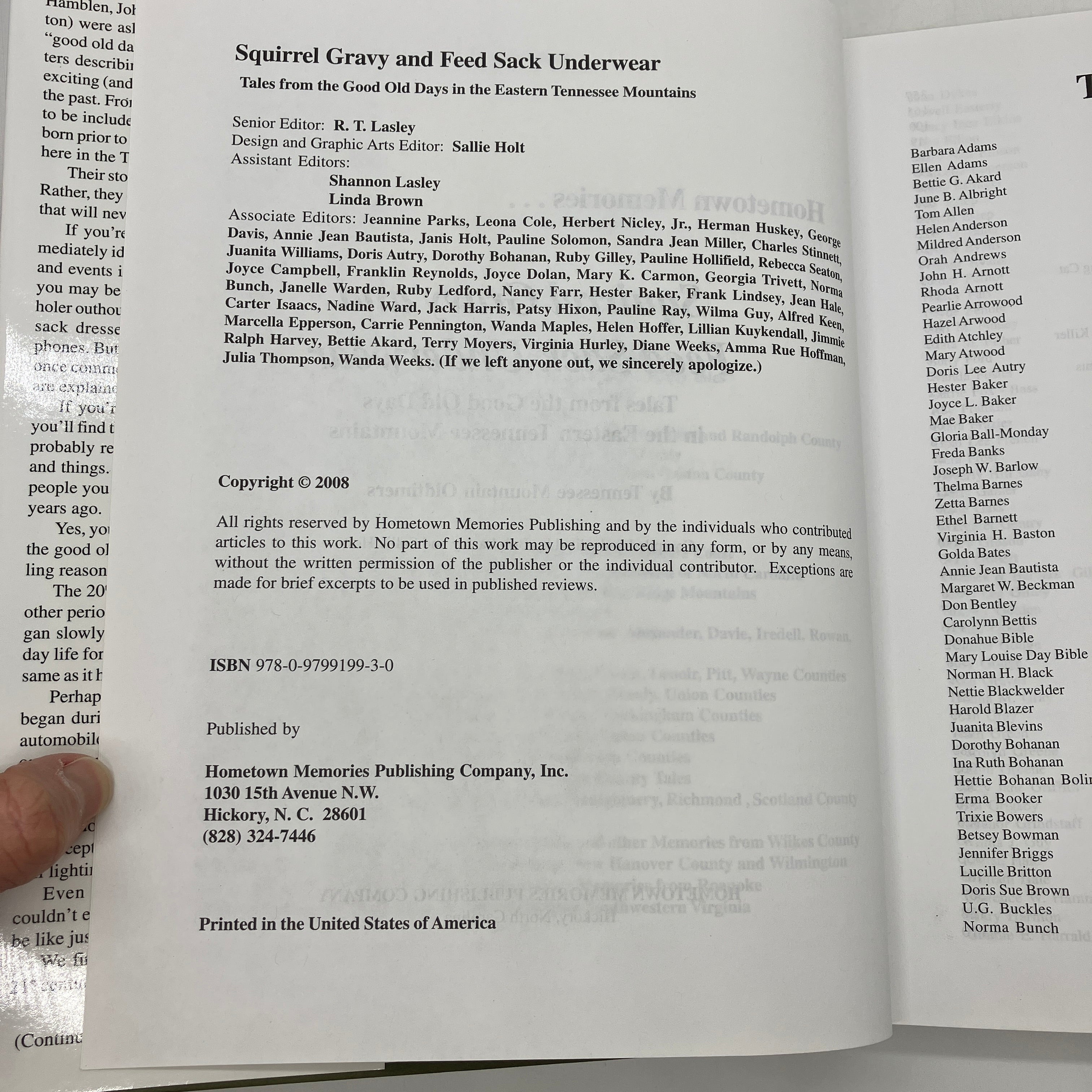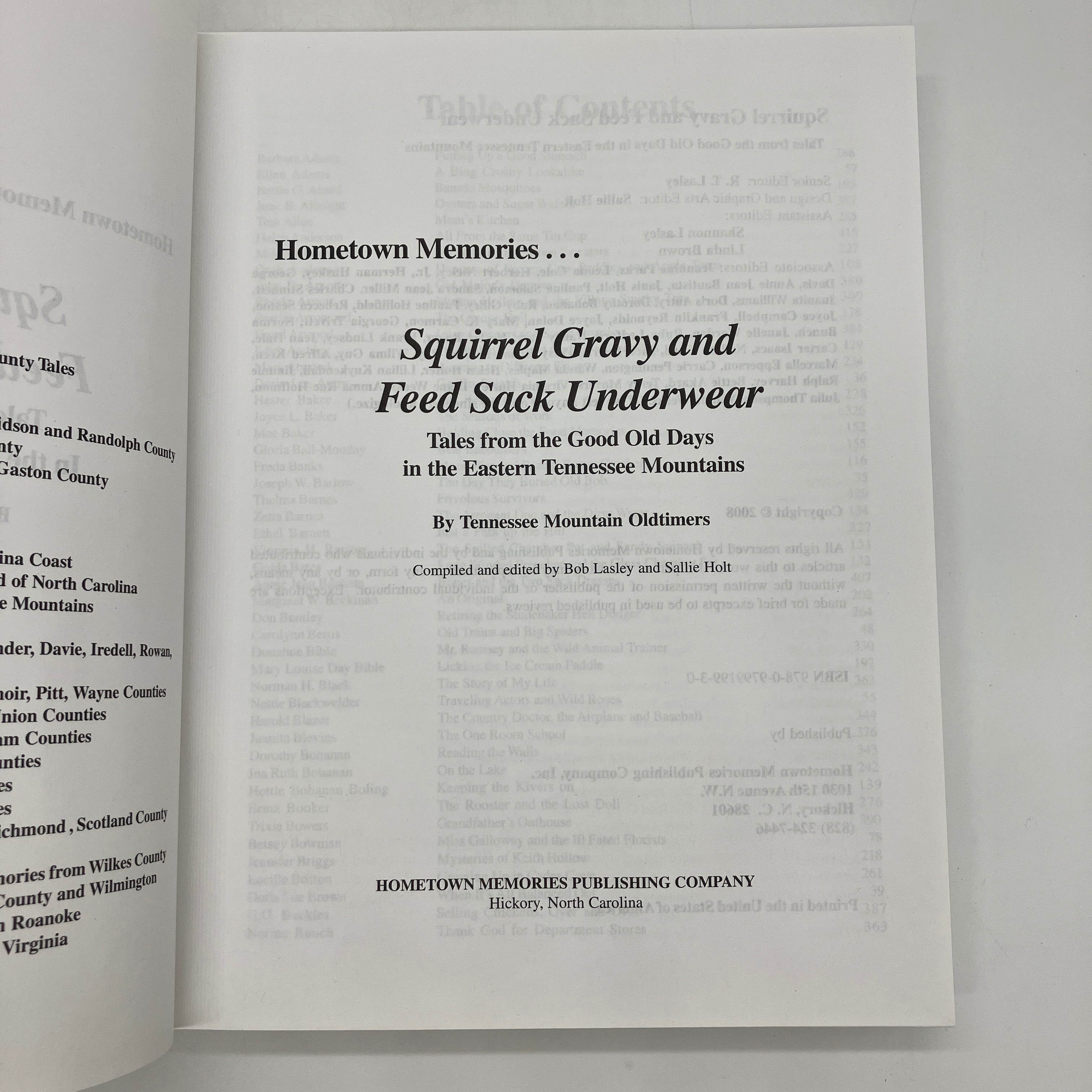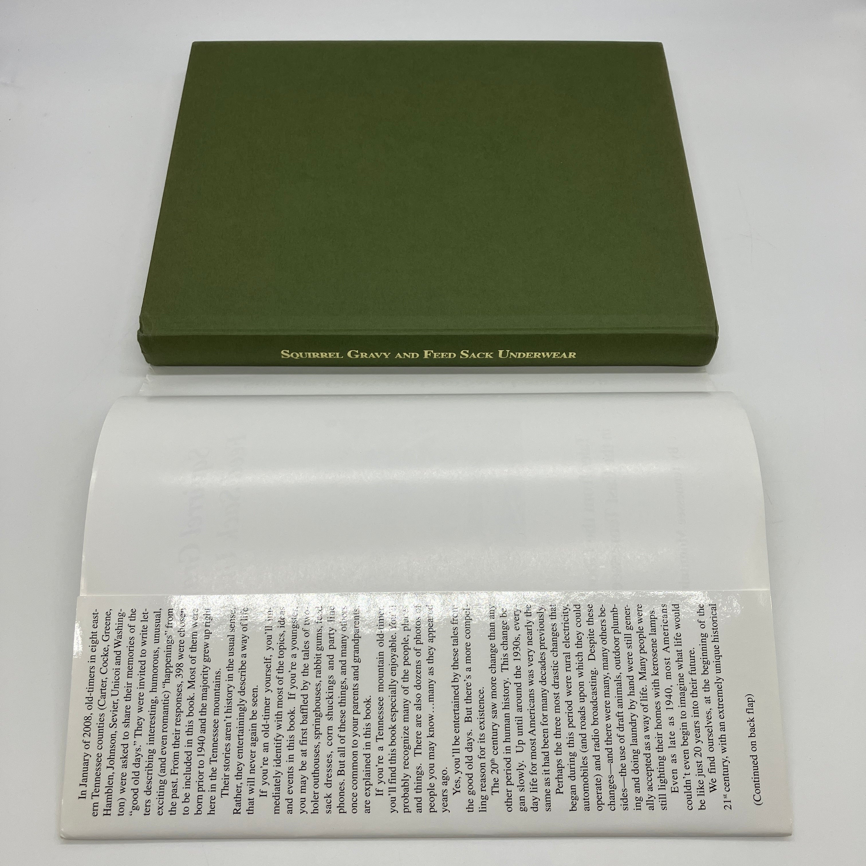 Hometown Memories Publishing Company, 2008. Large hardcover with dust jacket of Squirrel Gravy and Feed Sack Underwear: Tales From the Good Old Days in the Eastern Tennessee Mountains by Tennessee Mountain Oldtimers.