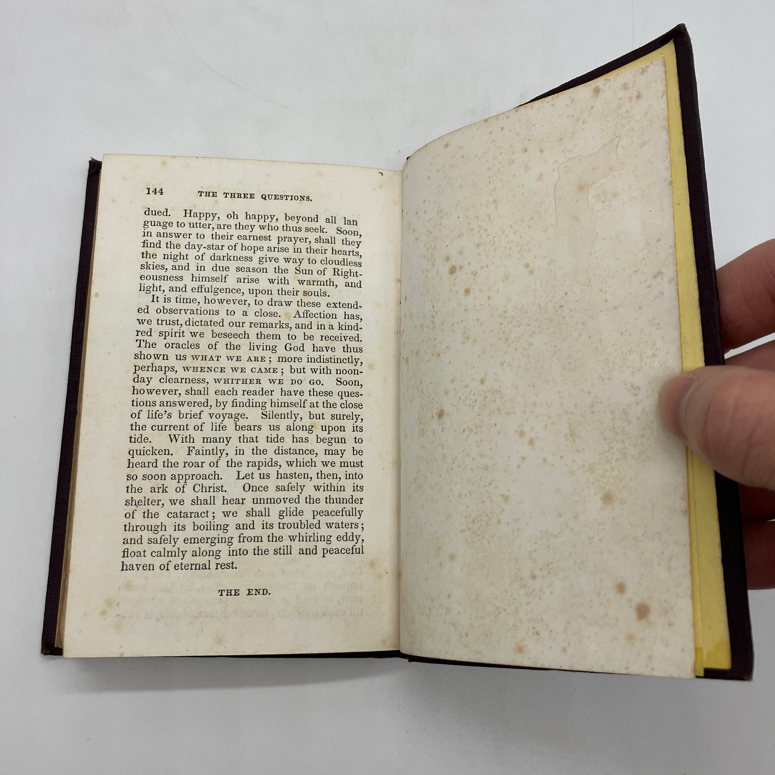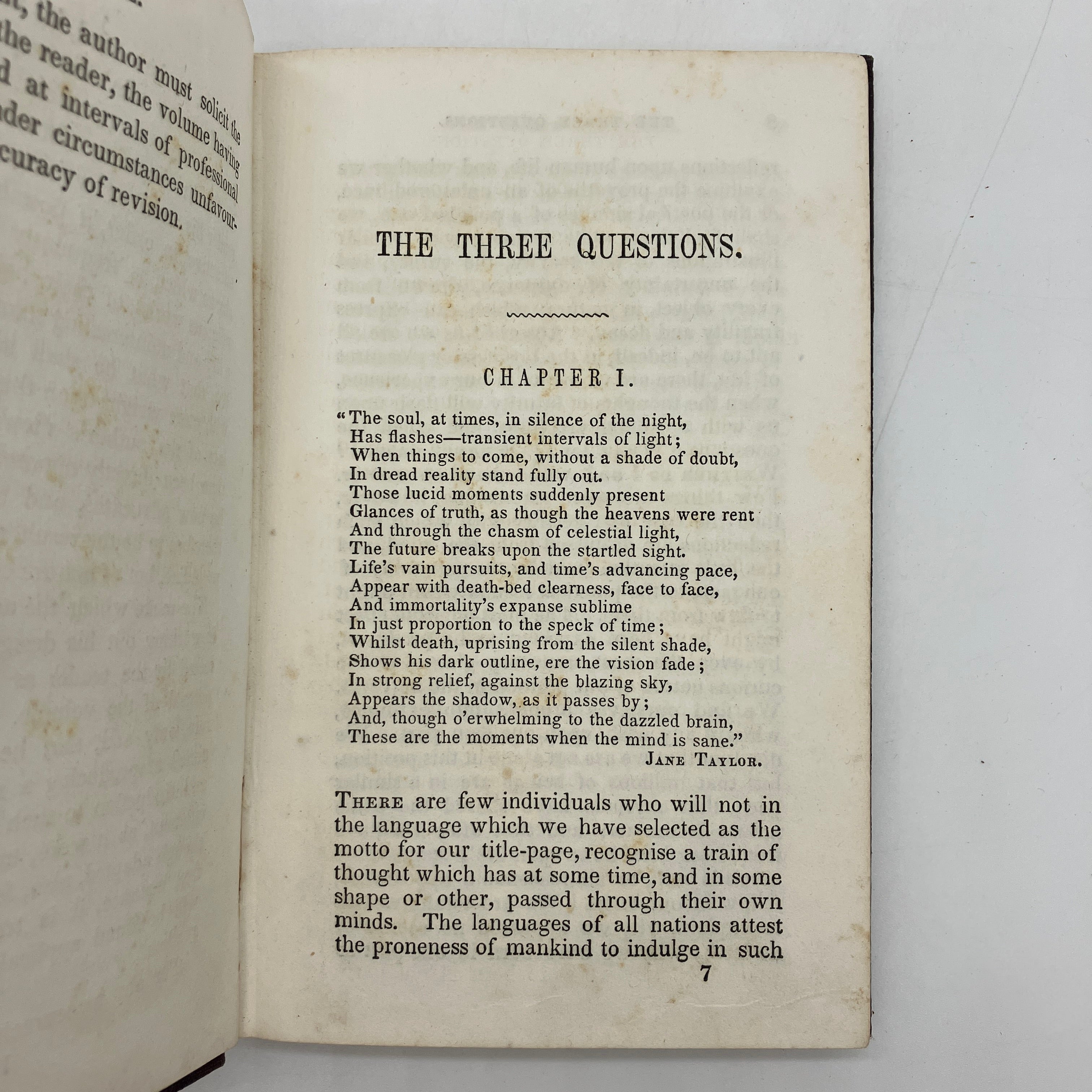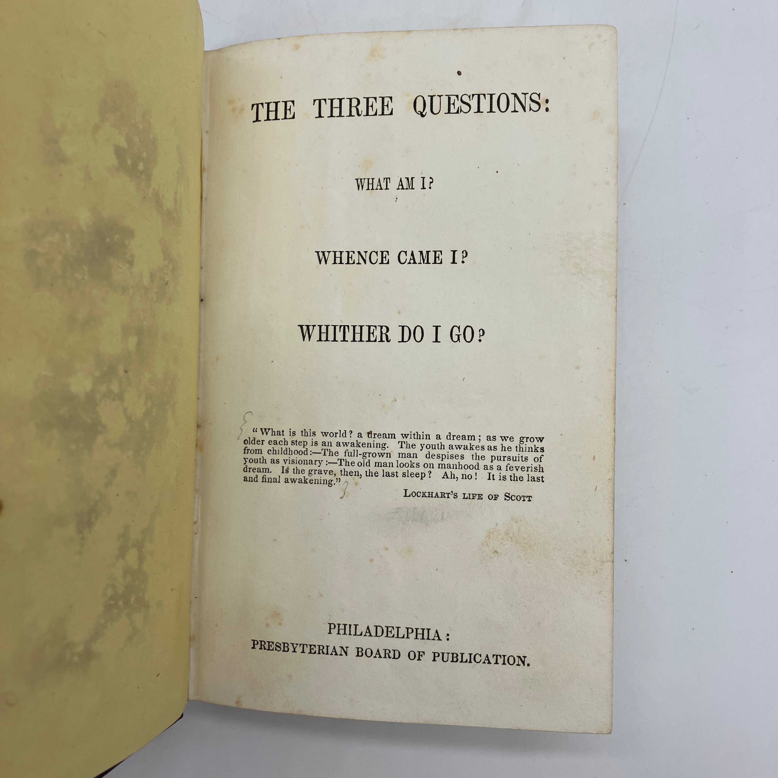 Presbyterian Board of Publication, circa 1882. Antiquarian cloth bound hardcover of The Three Questions: What Am I? Whence Came I? Whither Do I Go? by William Haig Miller.