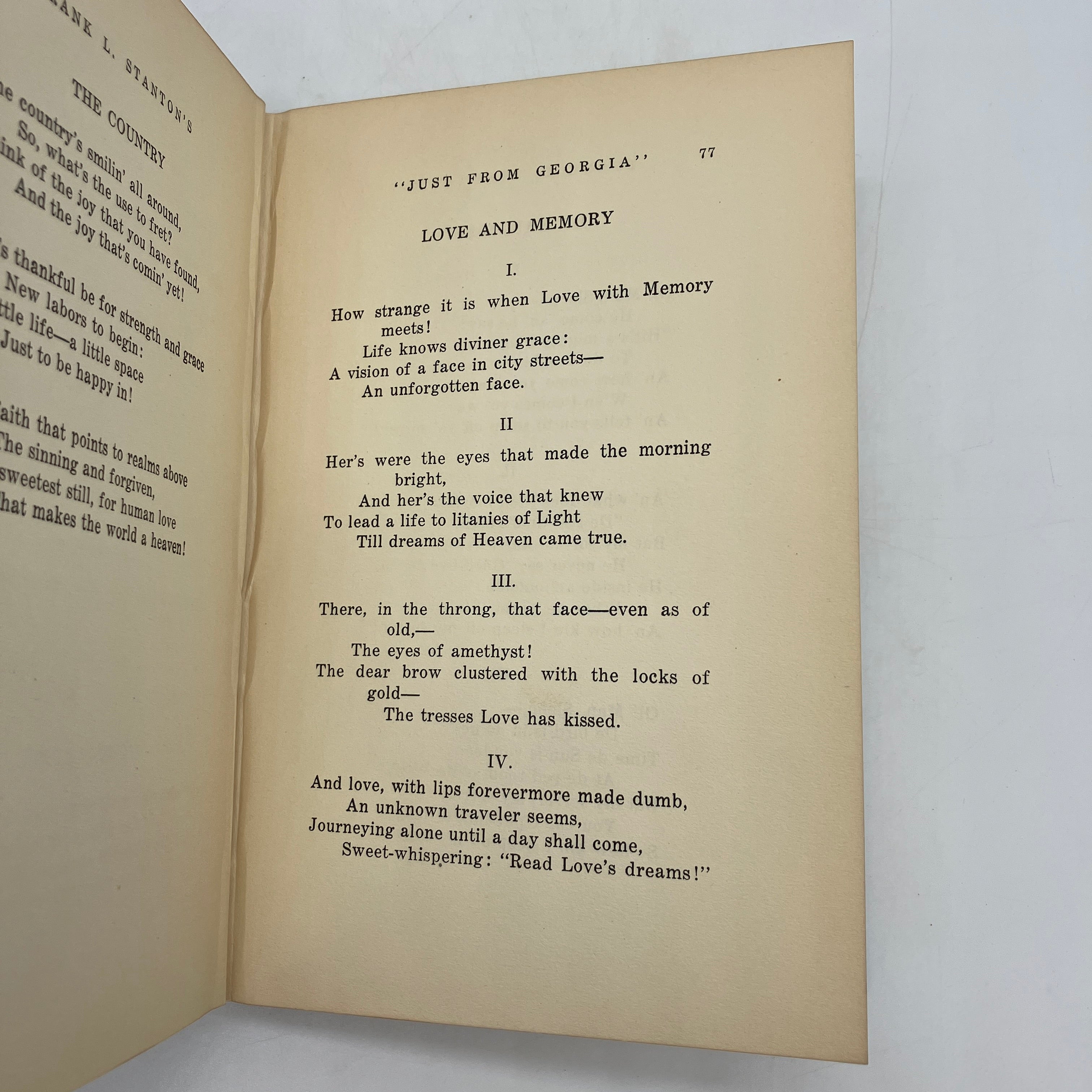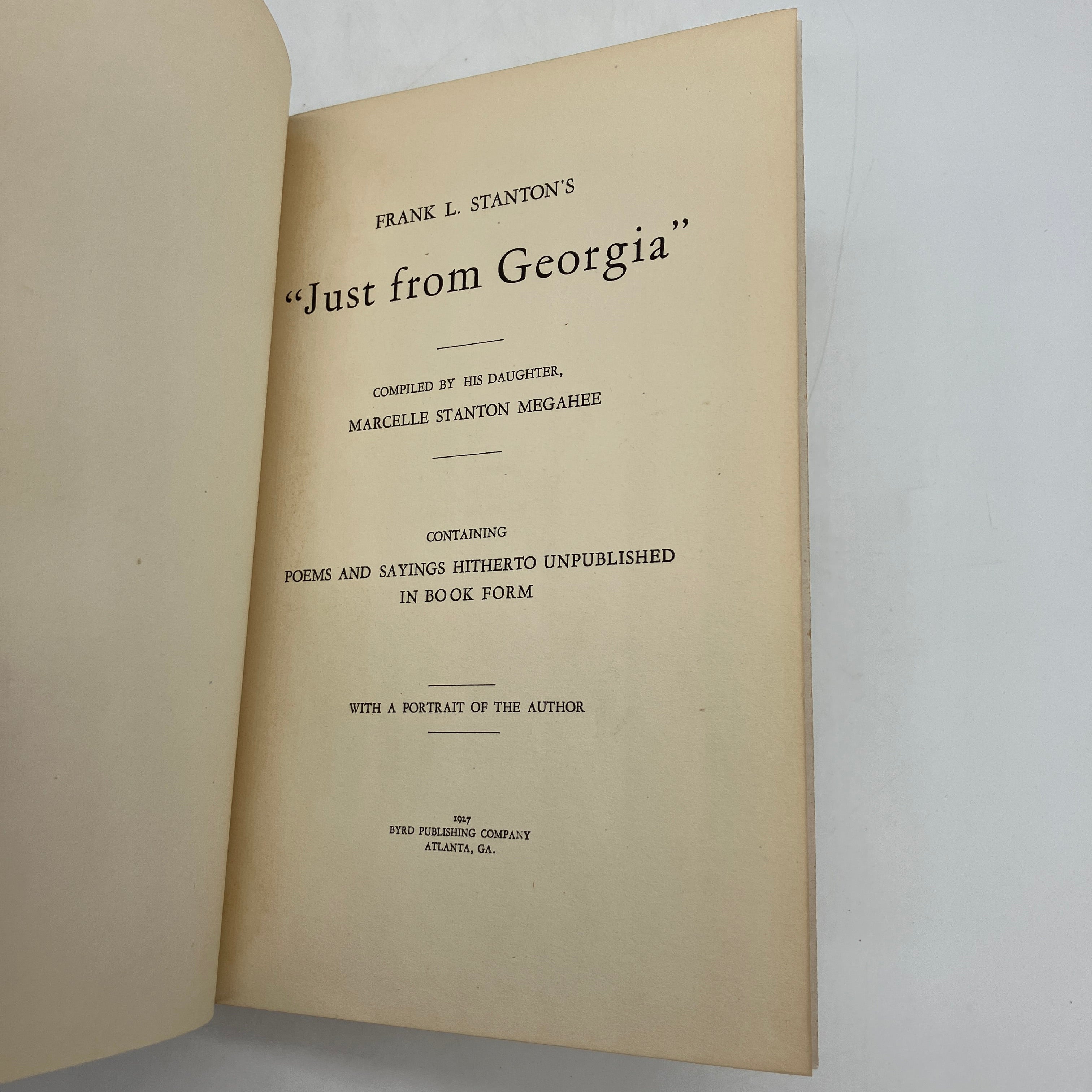 Byrd Publishing Company, 1927. First edition cloth bound hardcover of Frank L. Stanton's "Just From Georgia" compiled by his daughter Marcelle Stanton Megahee.
