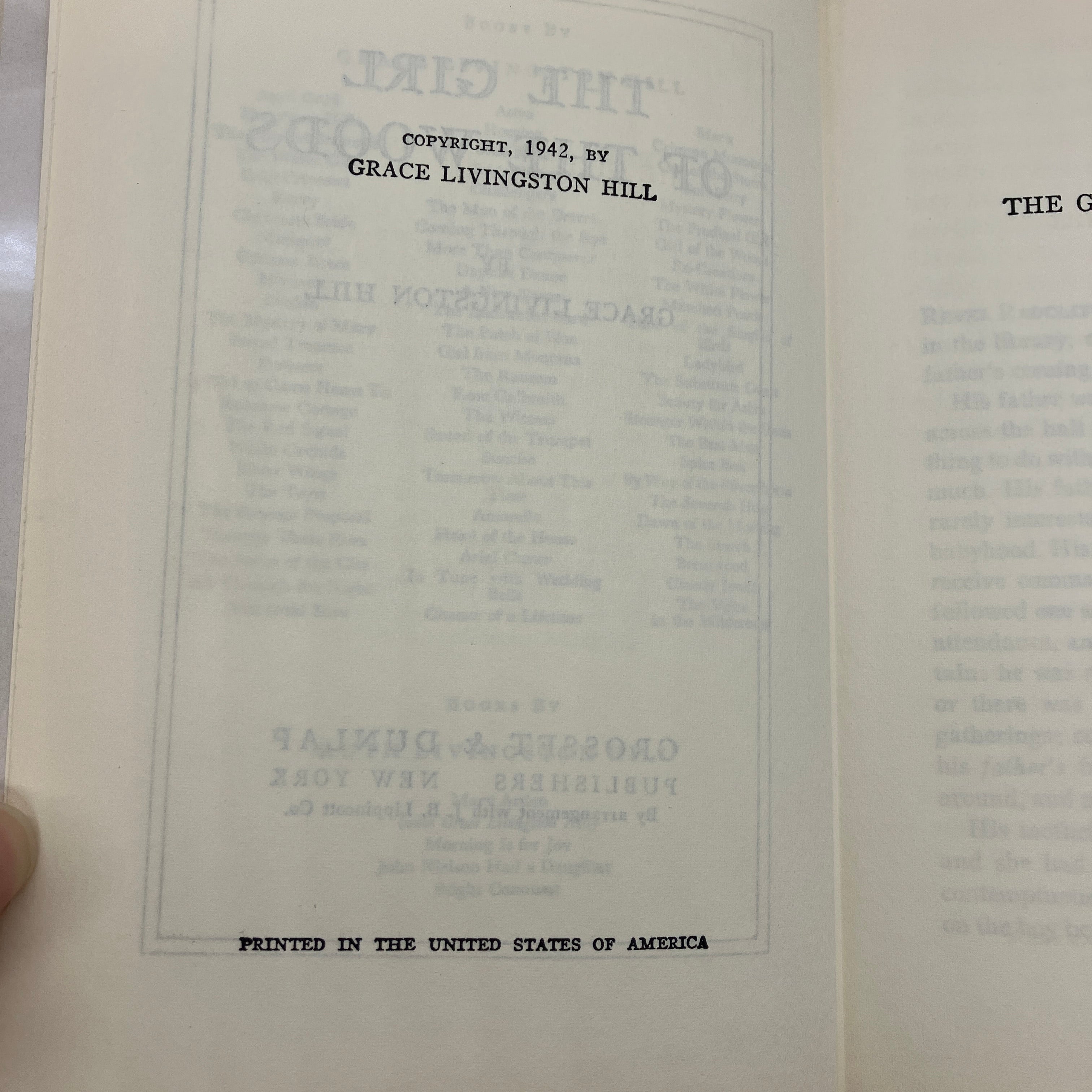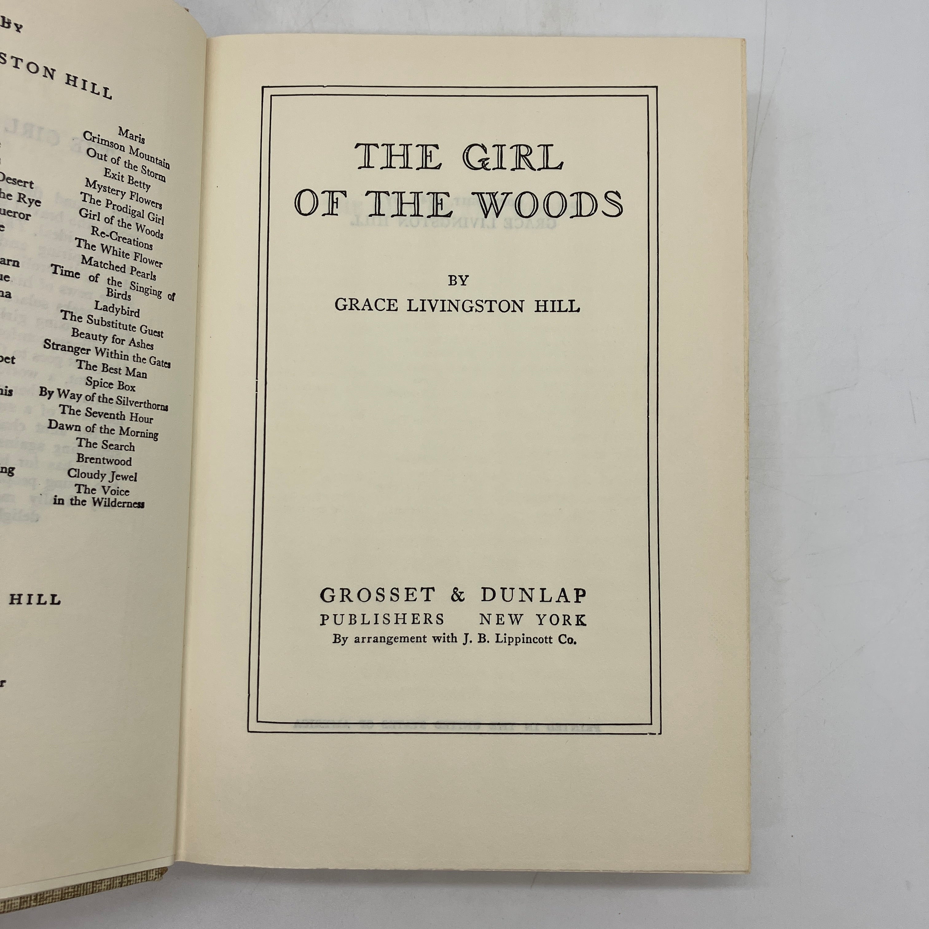 Grosset & Dunlap, 1942. Cloth bound hardcover with dust jacket of The Girl of the Woods by Grace Livingston Hill.