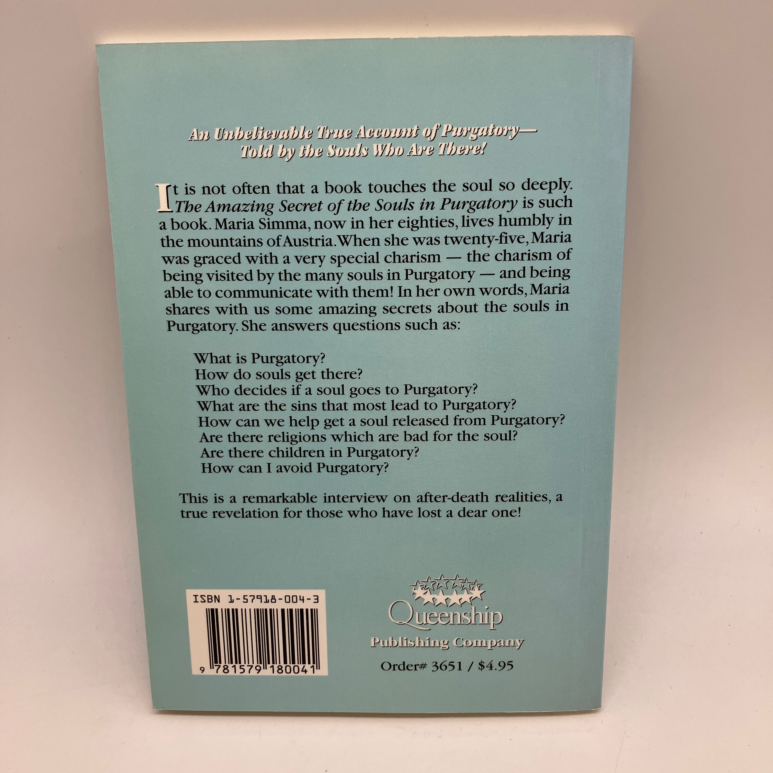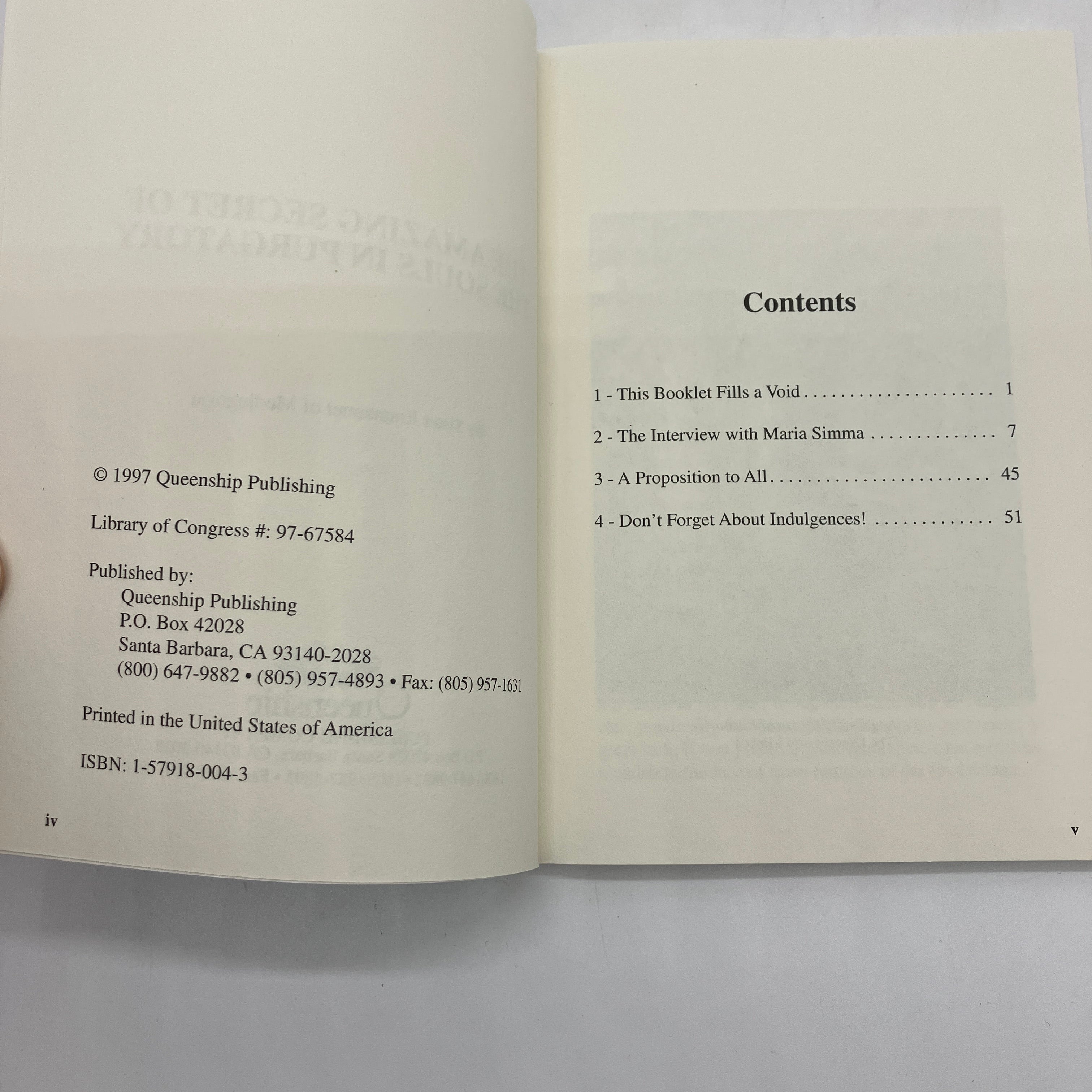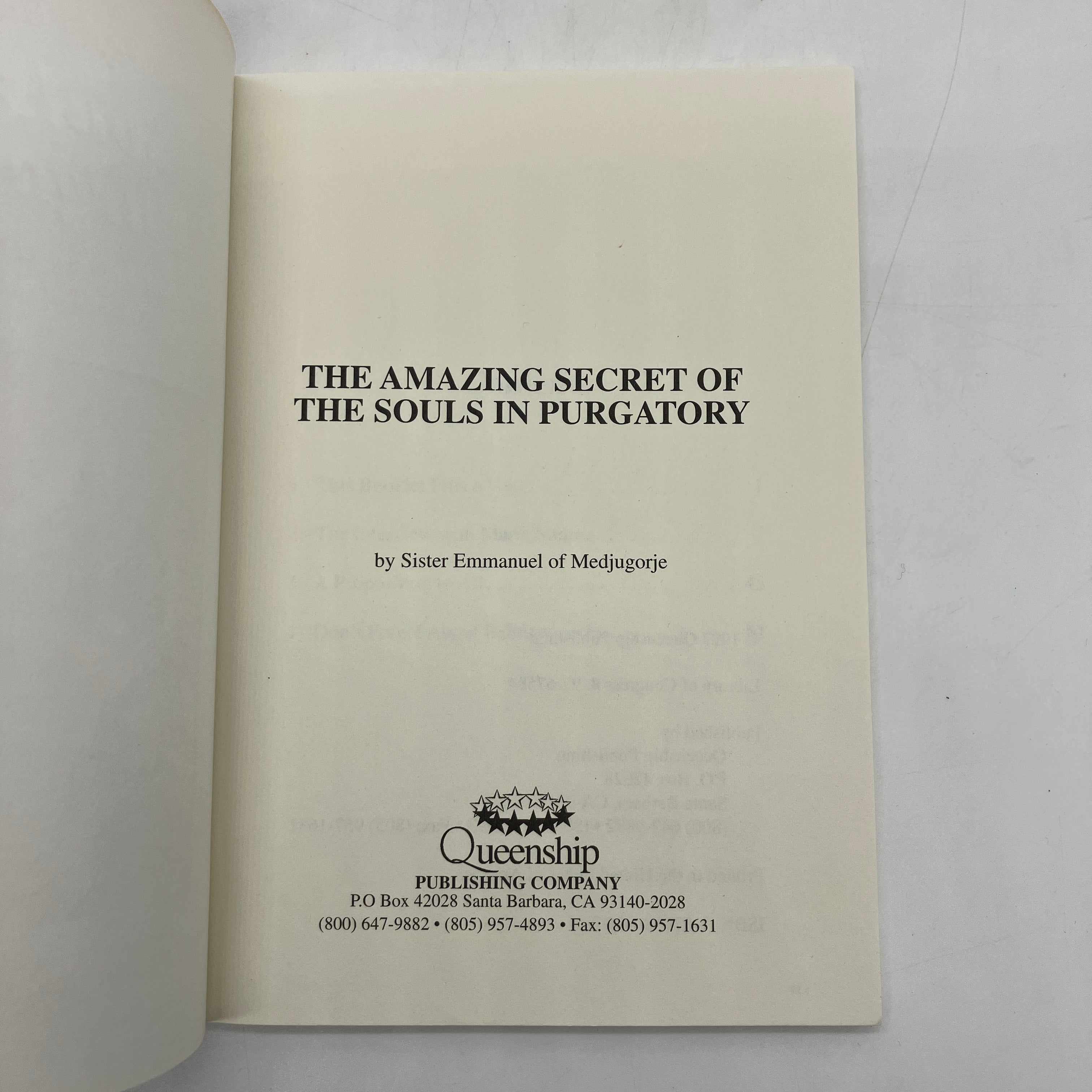Queenship Publishing Company, 1997. Trade paperback of The Amazing Secret of the Souls in Purgatory: An Interview with Maria Simma by Emmanuel of Medjugorje.