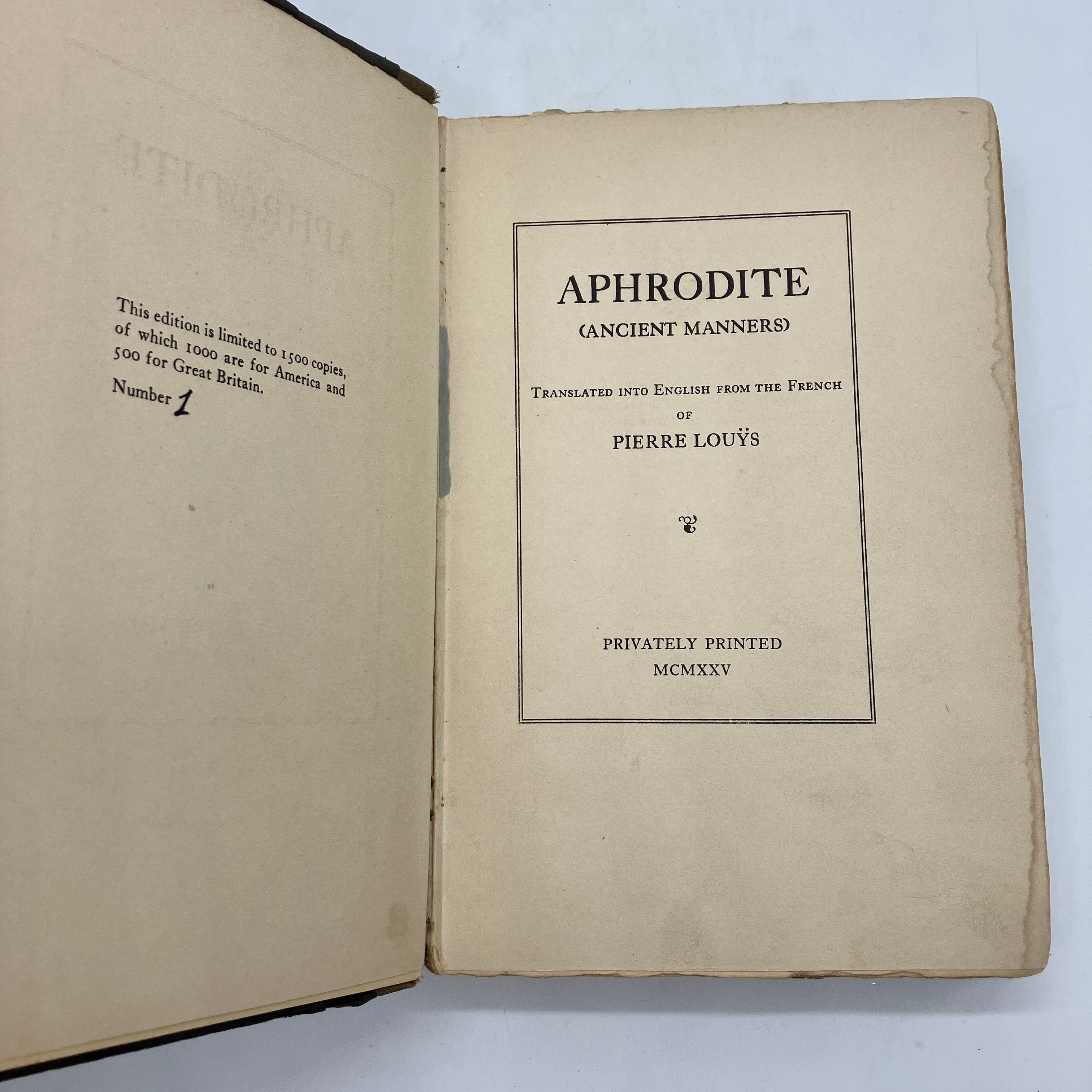 Privately Printed, 1925. Limited edition hardcover of Aphrodite, or, Ancient Manners by Pierre Louys.