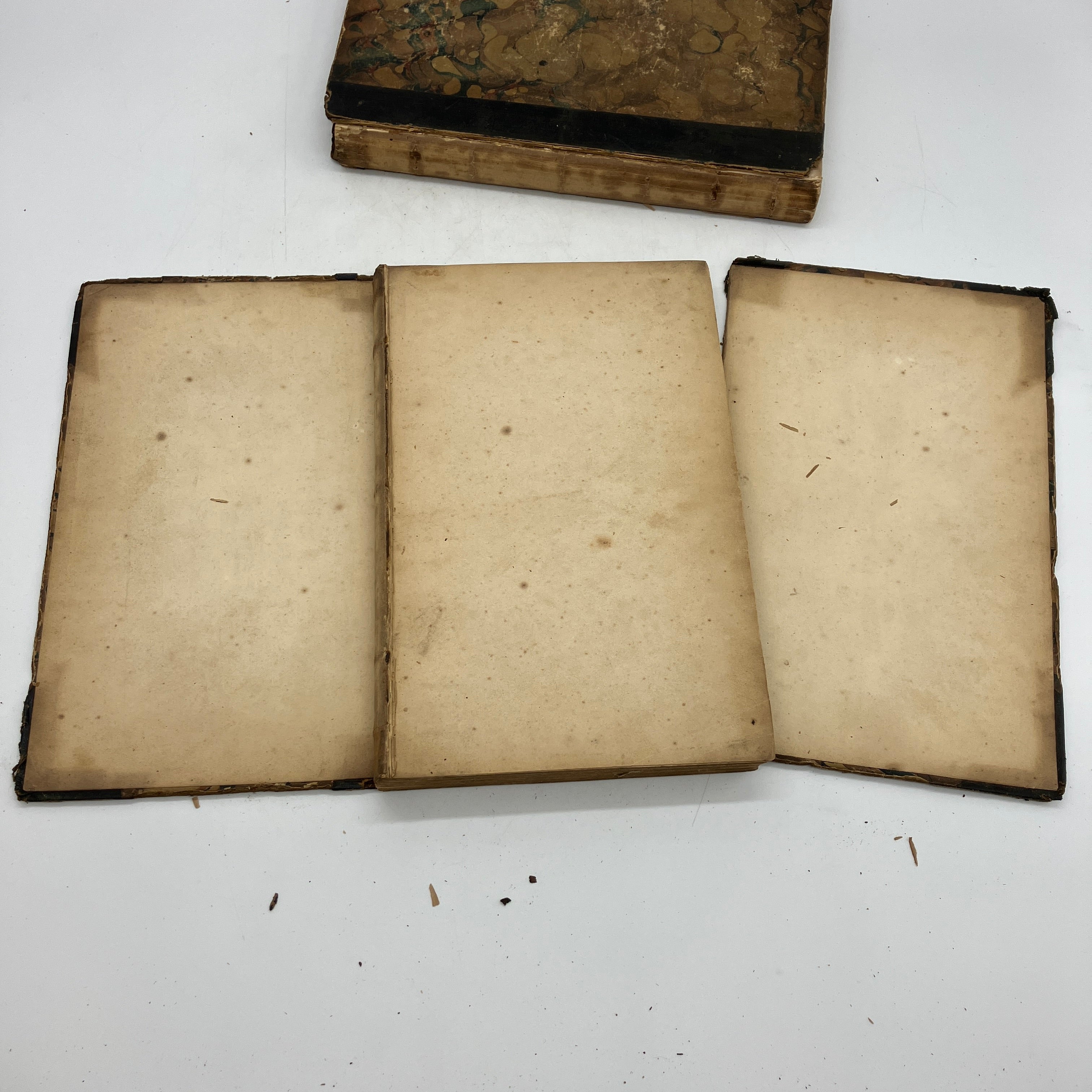 POOR condition. Covers completely detached on all 3 volumes. Front and back material similarly detached. Page blocks intact. Pages brittle and majorly chipping upon handling. Spines missing. Cover material majorly flaking apart upon handling. Be prepared for lots of flaking. Book is complete despite major flaws. Scarce antiquarian volumes in need of repair and rebinding.