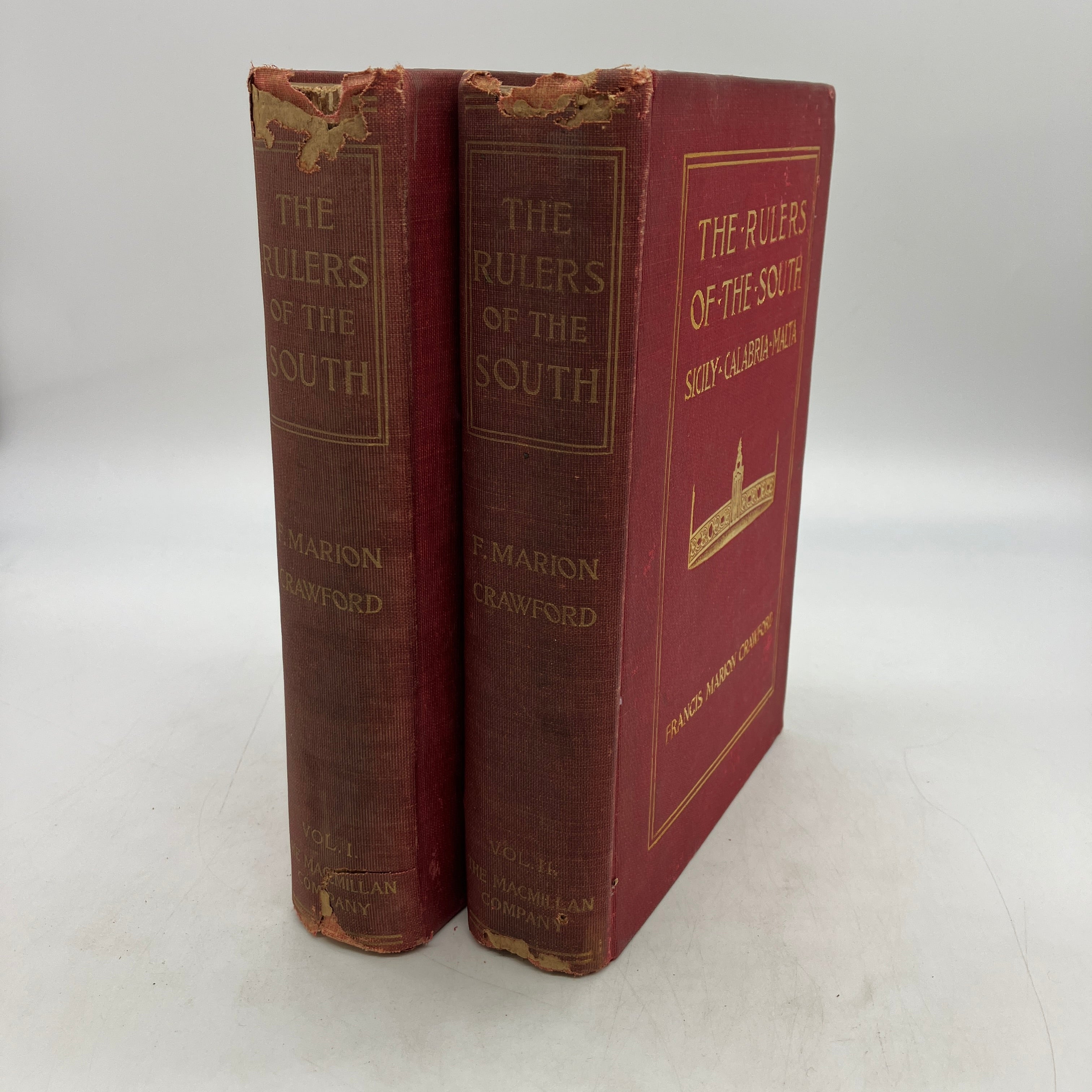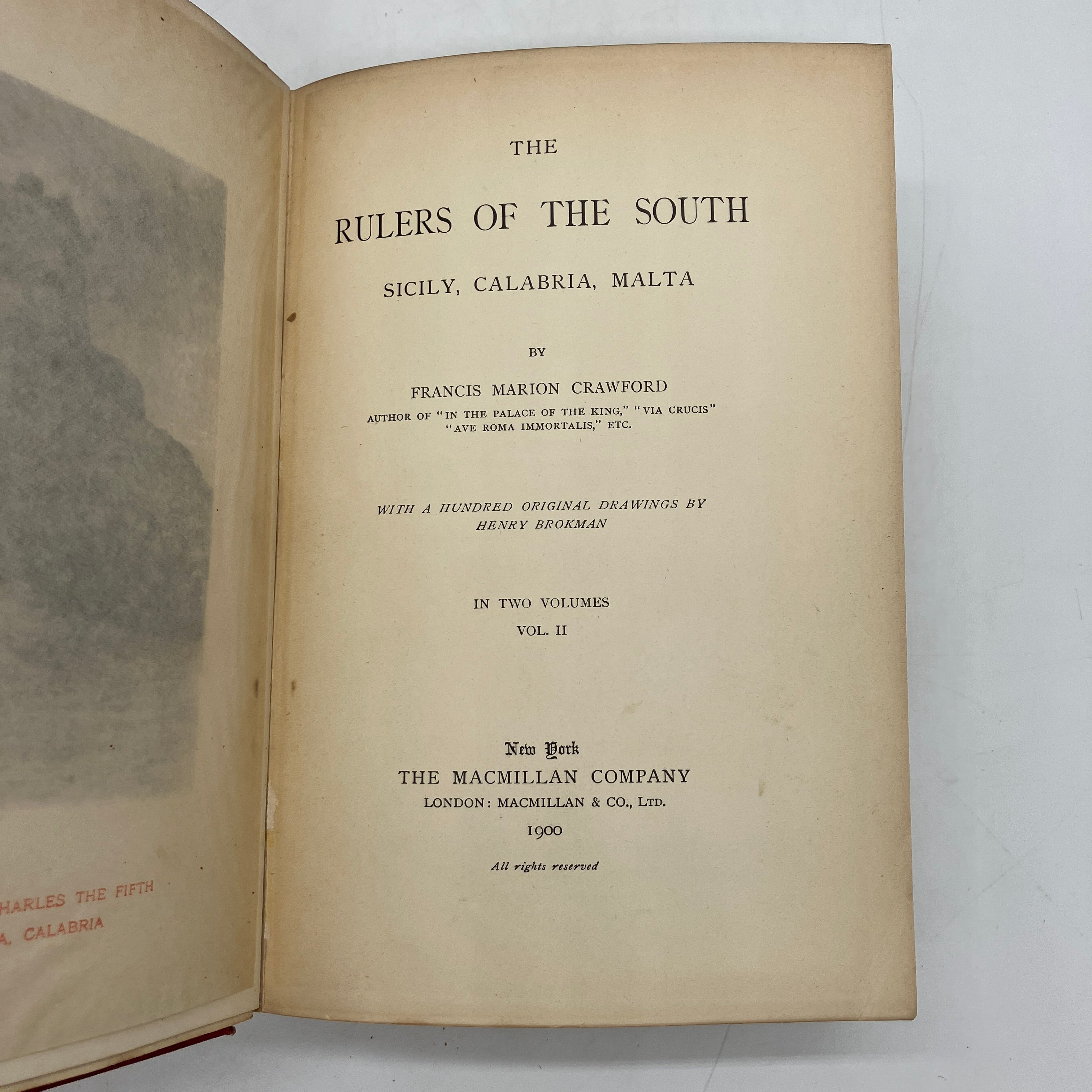 The Macmillan Company, 1900. First edition antiquarian cloth bound hardcover set of The Rulers of the South: Sicily, Calabria, Malta by Francis Marion Crawford.