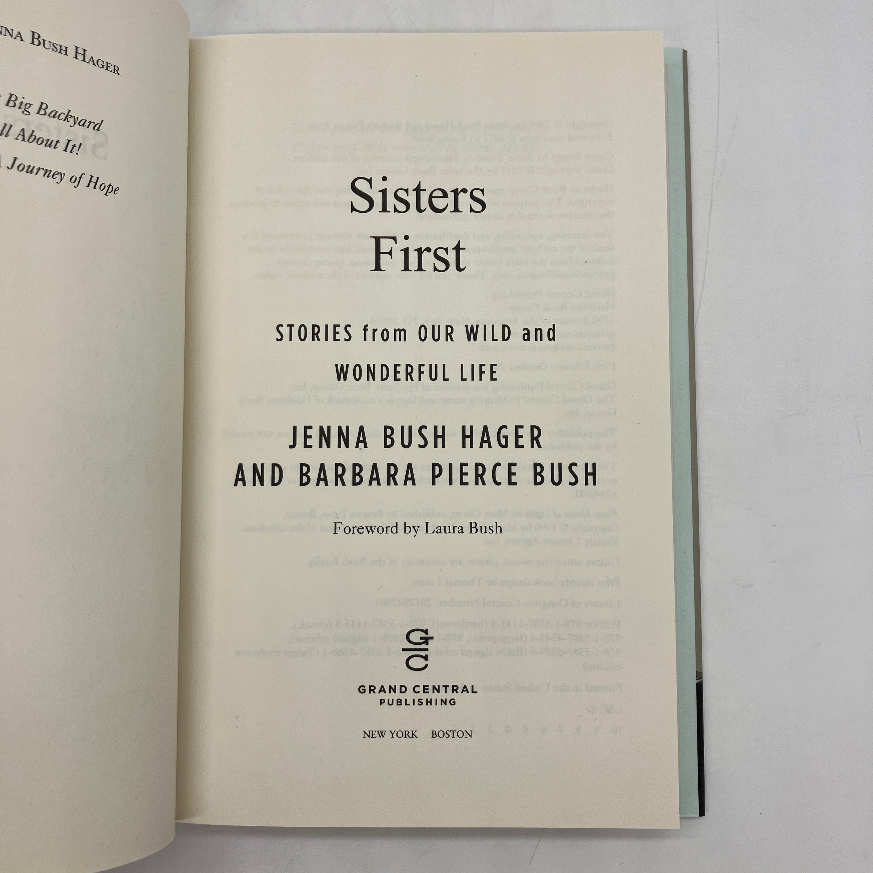 Grand Central Publishing, 2017. Signed first edition hardcover with dust jacket of Sisters First: Stories from Our Wild and Wonderful Life by Jenna Bush Hager & Barbara Pierce Bush.