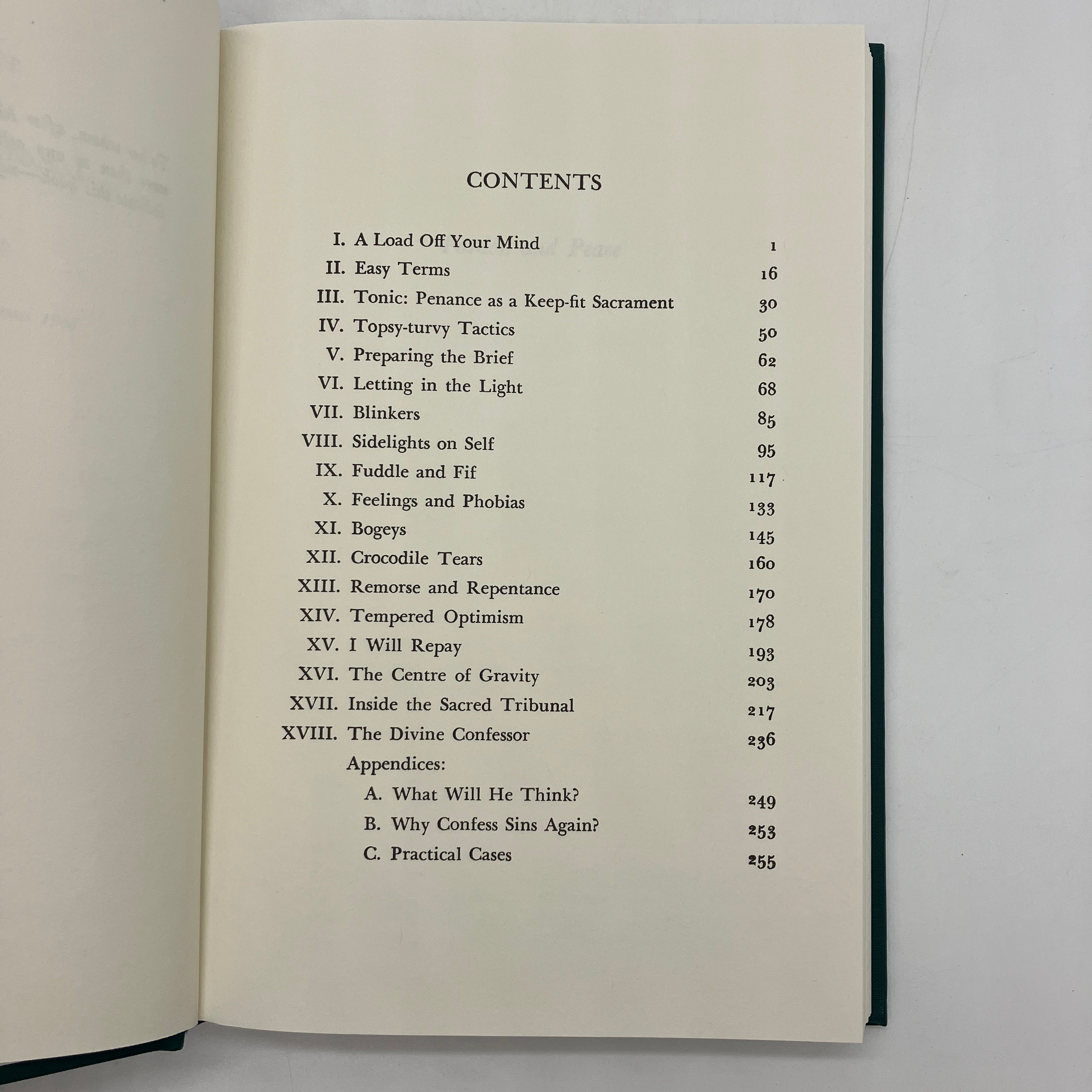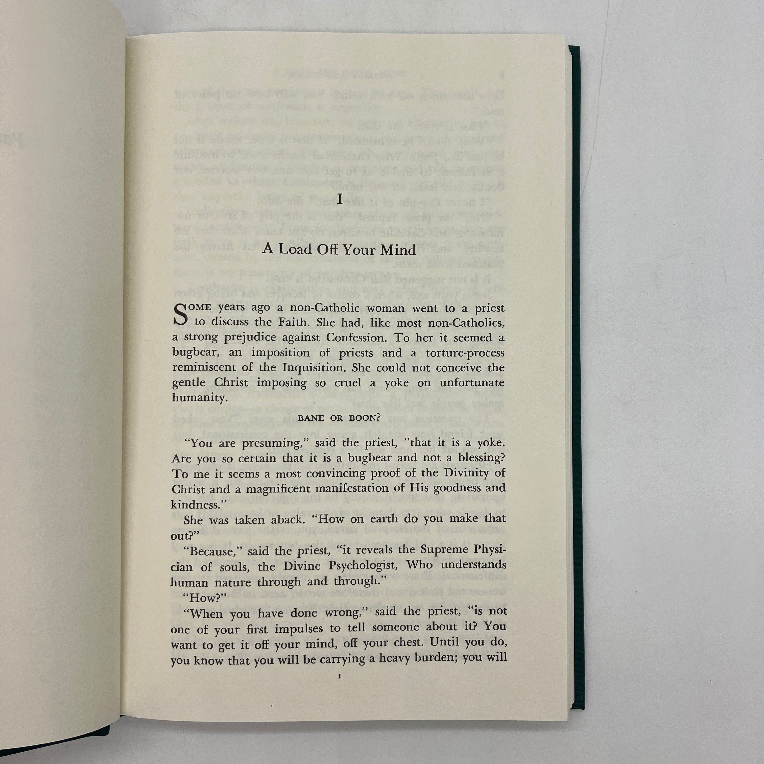 A theological exposition and defense of the Catholic Sacrament of Confession, featuring the official Imprimatur and Nihil Obstat from 1946. The book confronts the common objection, "Why confess to a man?" by arguing that Confession is not necessary to win God's pardon—which perfect contrition already achieves—but rather to satisfy a human need for definitive, external assurance.