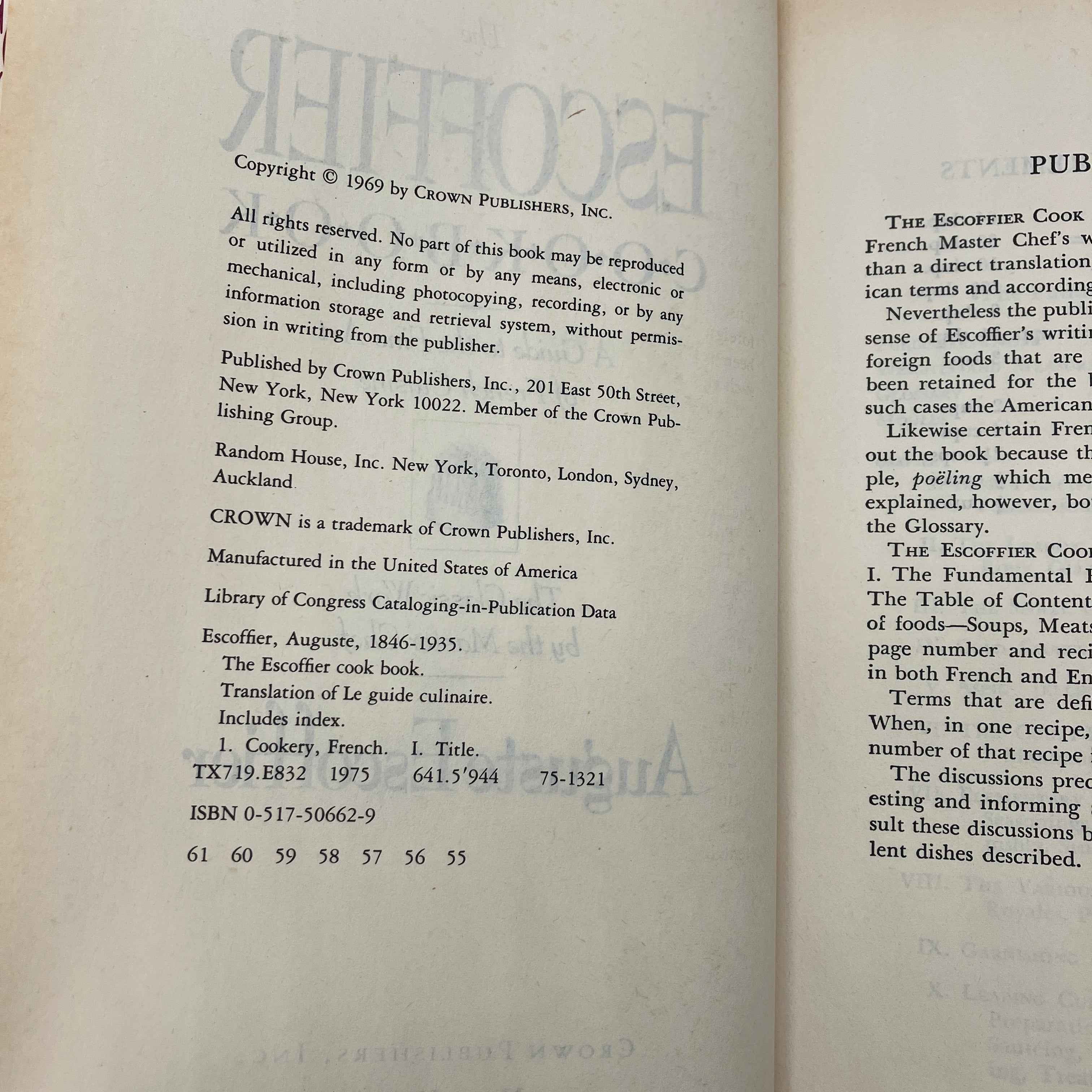 Crown Publishers, 1975. Hardcover with dust jacket of The Escoffier Cookbook: A Guide to the Fine Art of French Cuisine by Auguste Escoffier.