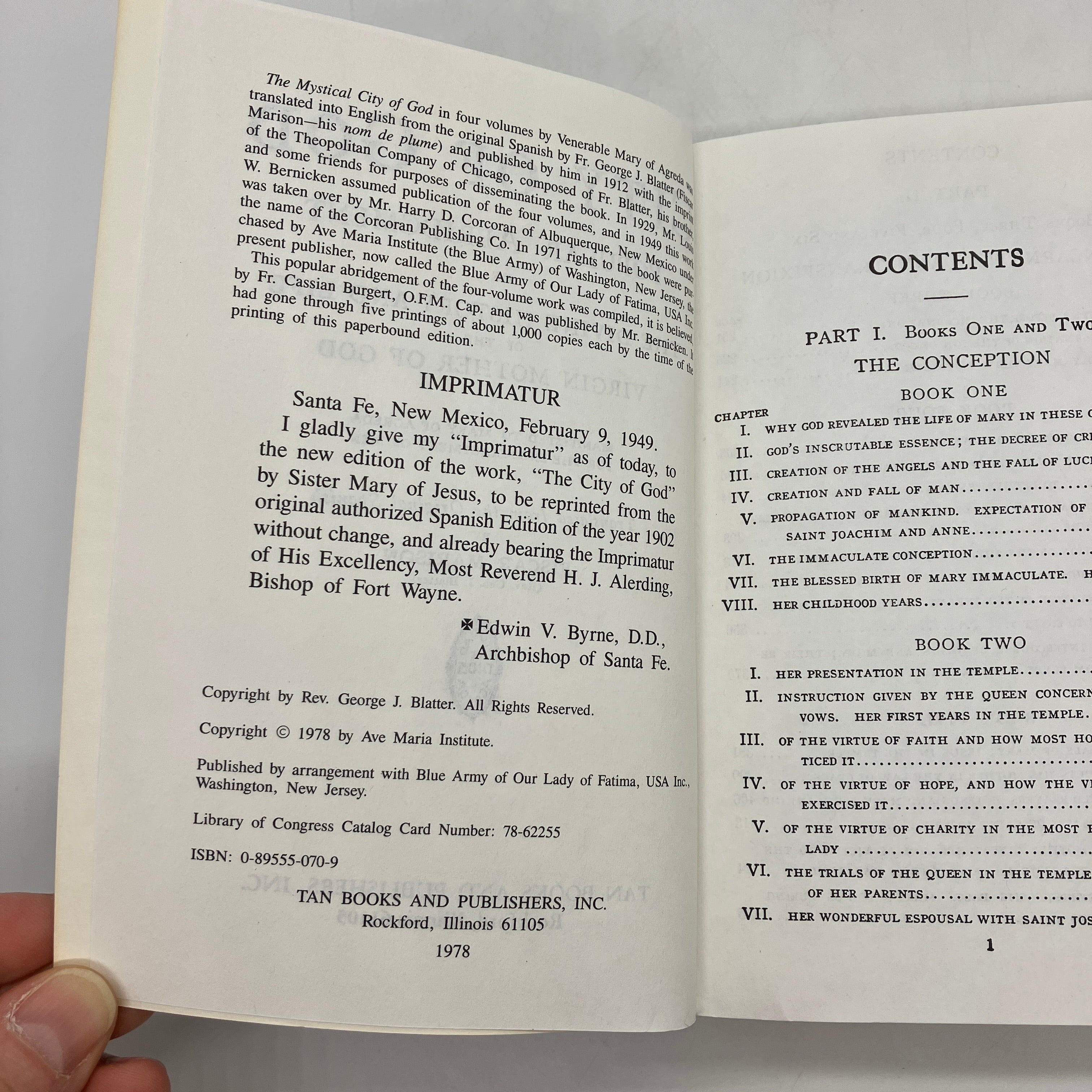 TAN Books, 1978. Trade paperback of The Mystical City of God: A Popular Abridgement of the Divine History and Life of the Virgin Mother of God by Mary of Agreda.