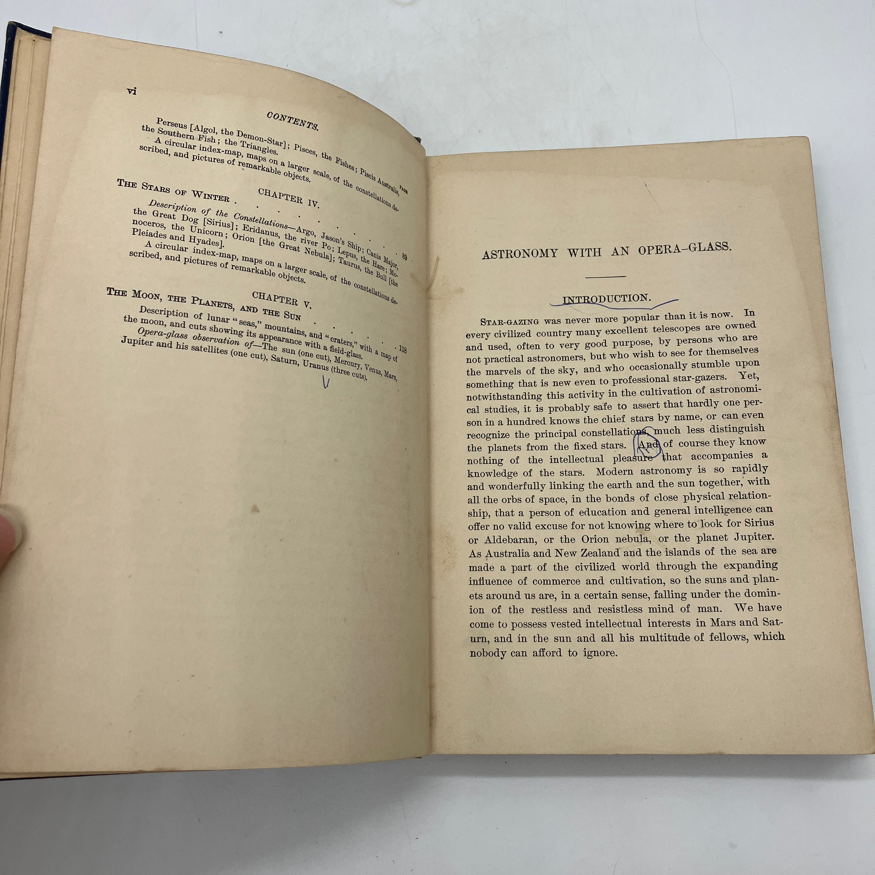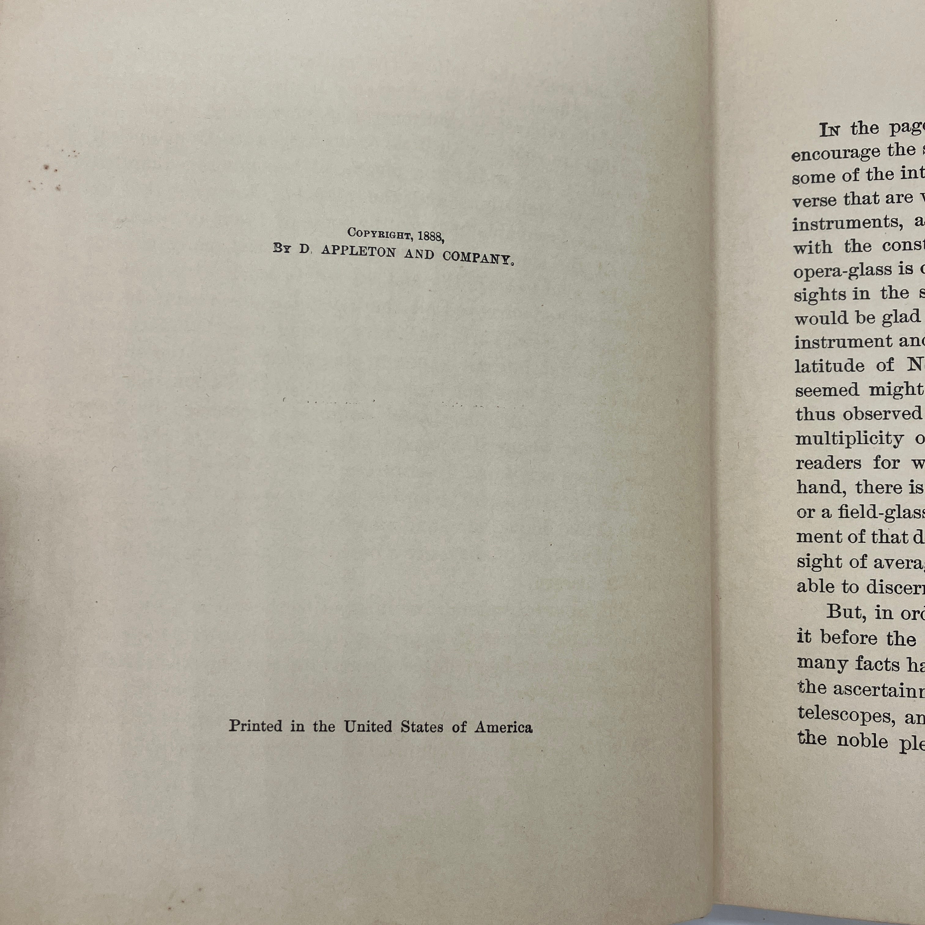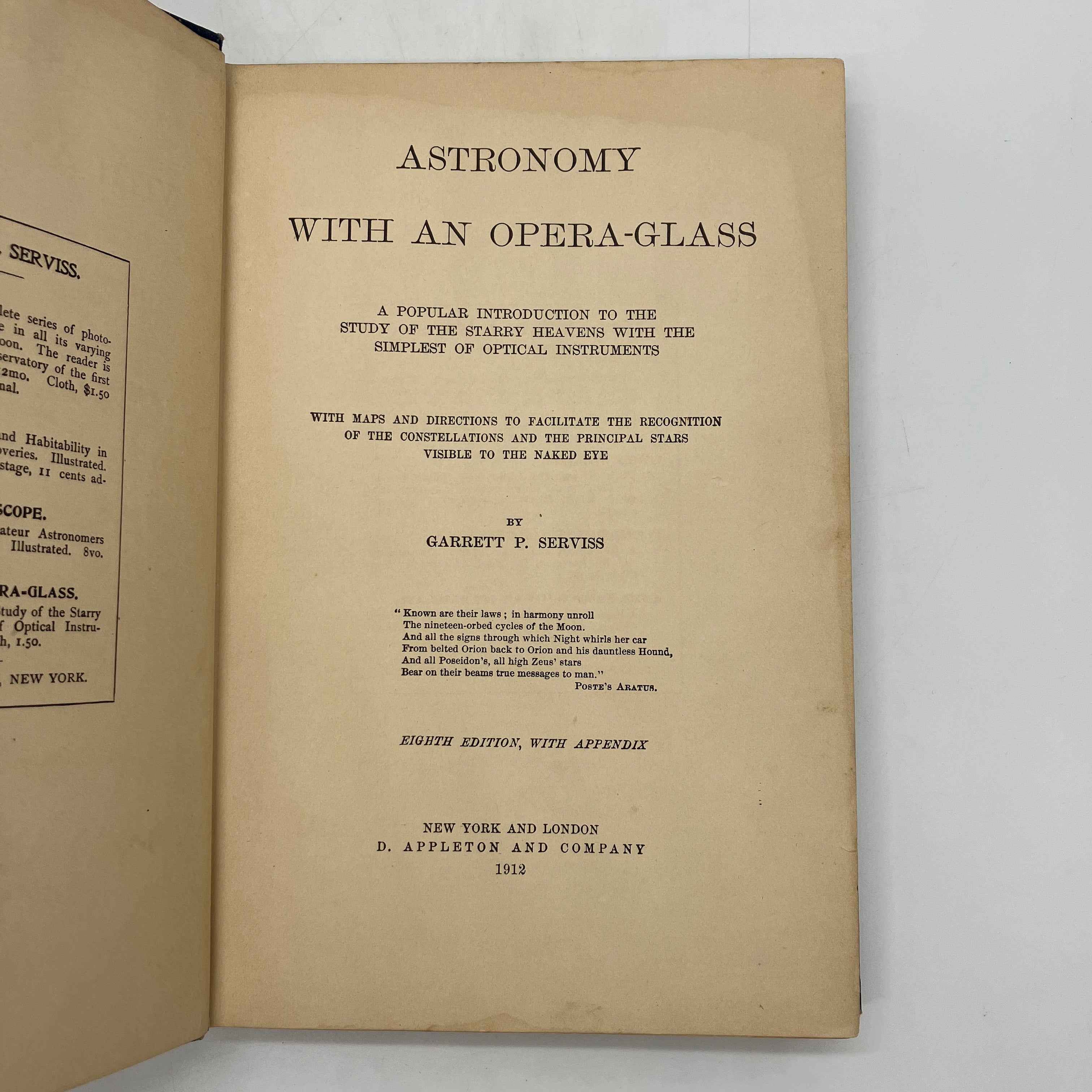 D. Appleton and Company, 1912. Cloth bound hardcover of Astronomy with an Opera-Glass: A Popular Introduction to the Study of the Starry Heavens with the Simplest of Optical Instruments by Garrett Serviss.