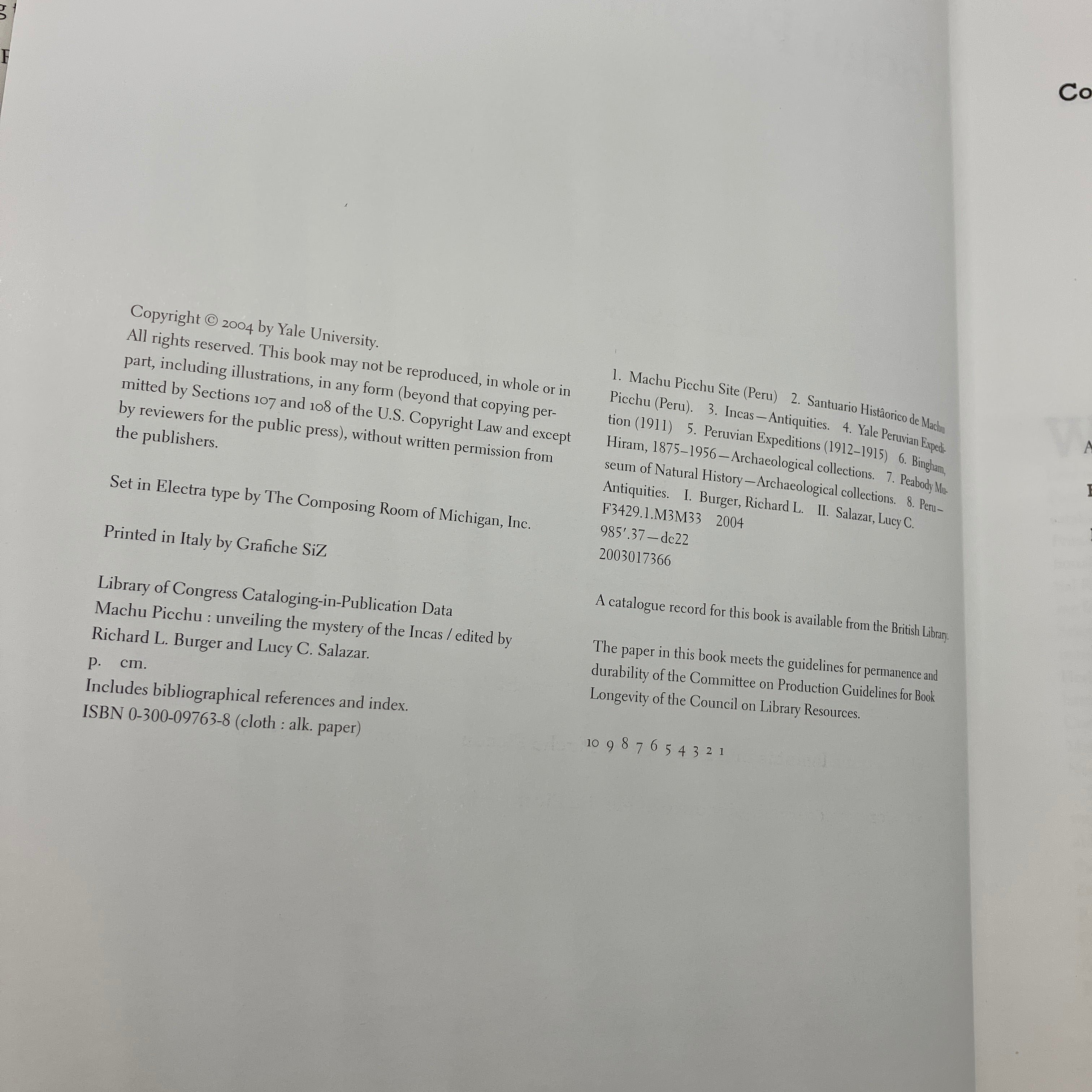Yale University Press, 2004. Large cloth bound hardcover with dust jacket of Machu Picchu: Unveiling the Mystery of the Incas by Richard Burger & Lucy Salazar.