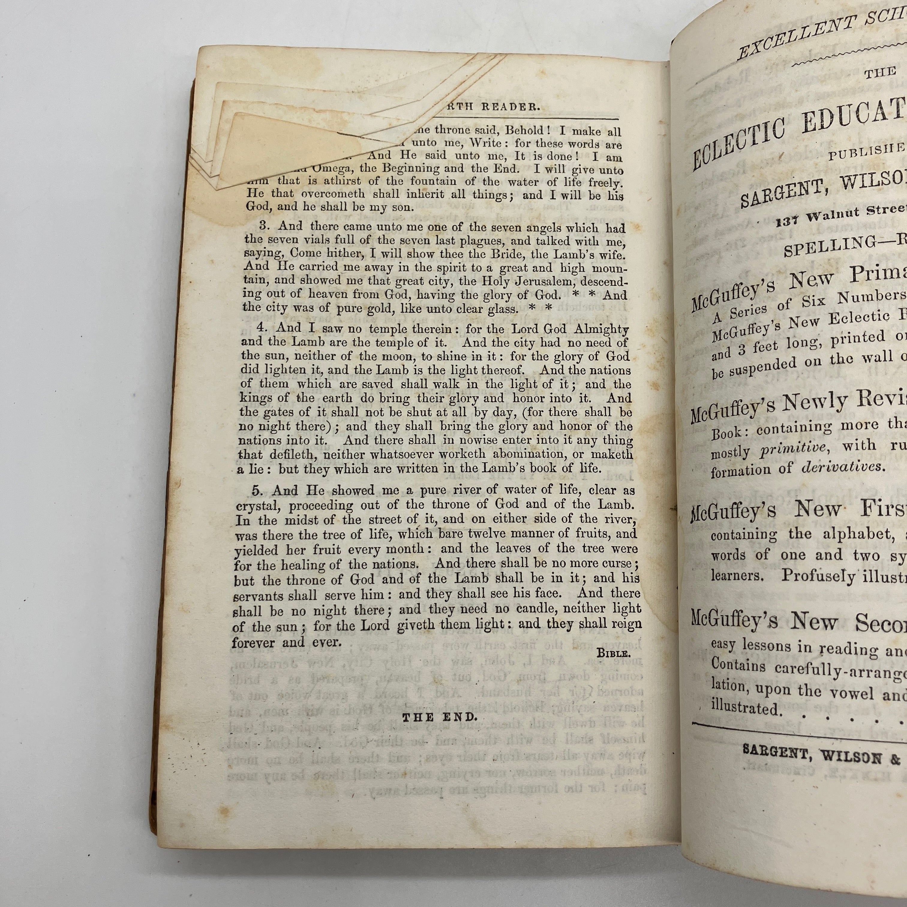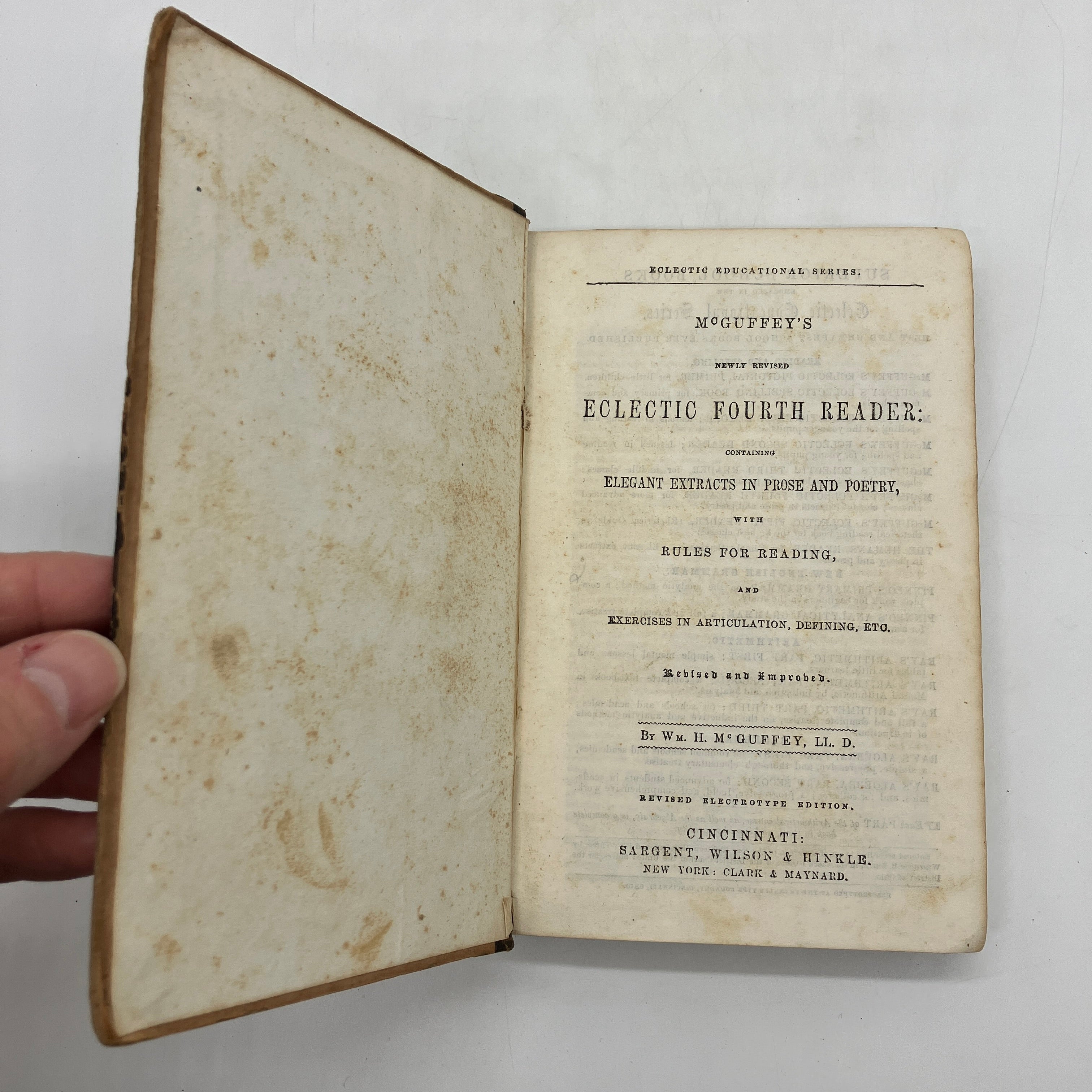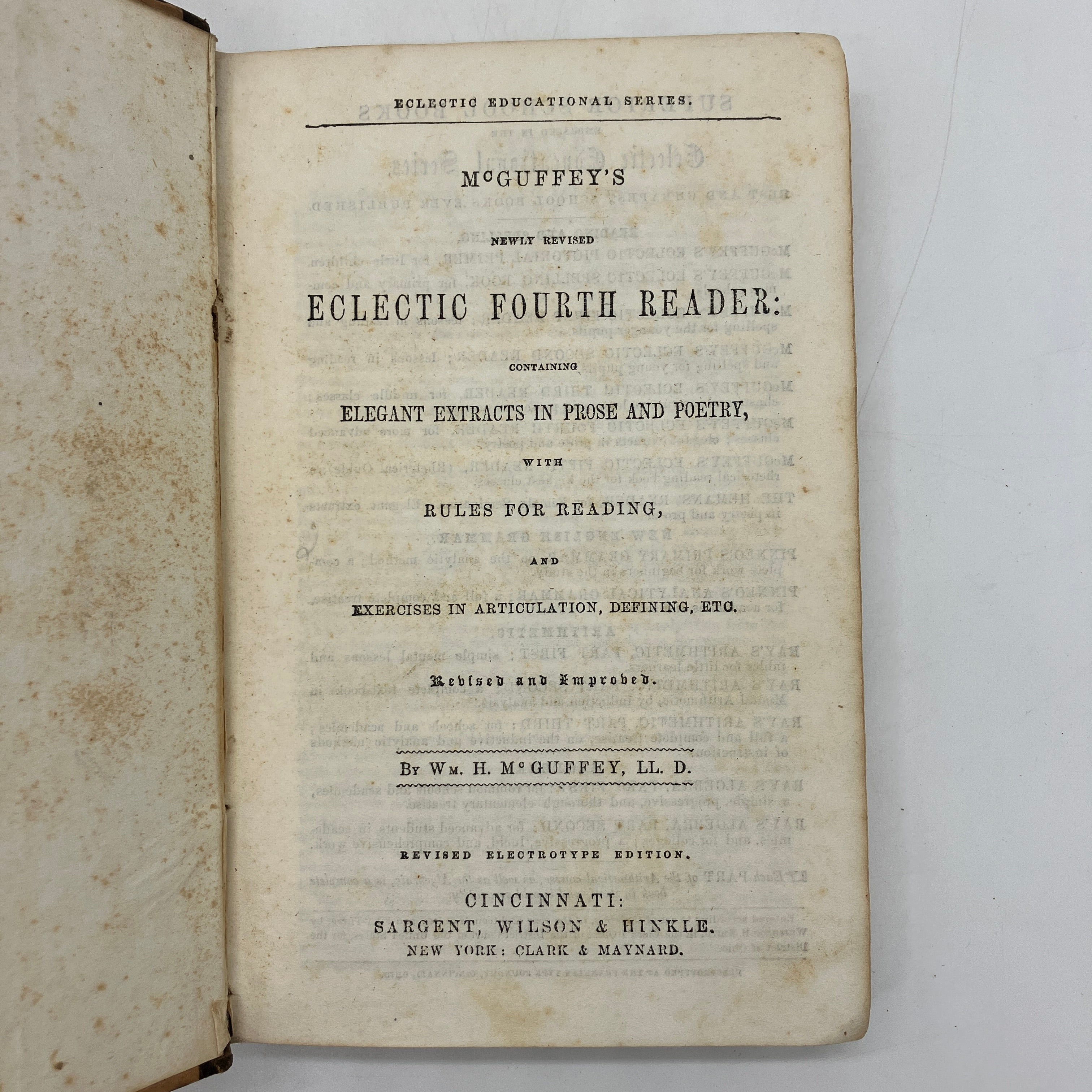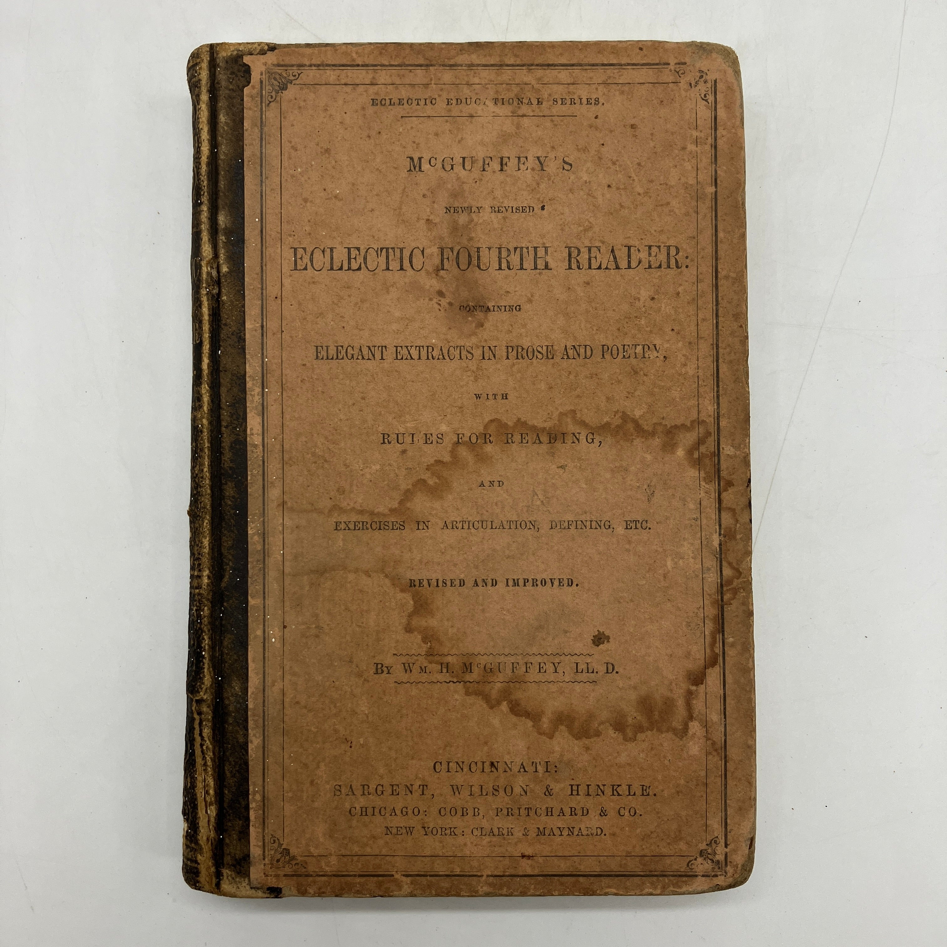 Sargent, Wilson & Hinkle, 1866. Antiquarian hardcover of McGuffey's Newly Revised Eclectic Fourth Reader: Containing Elegant Extracts in Prose and Poetry, with Rules for Reading, and Exercises in Articulation, Defining, Etc. Revised and Improved by Wm. H. McGuffey.