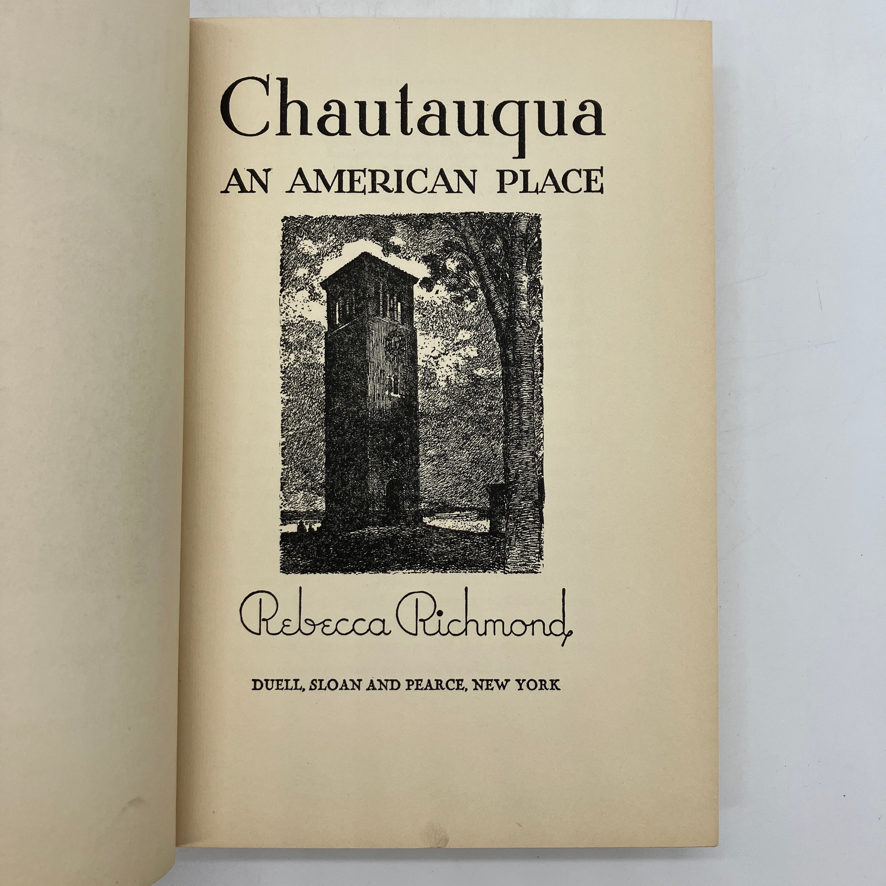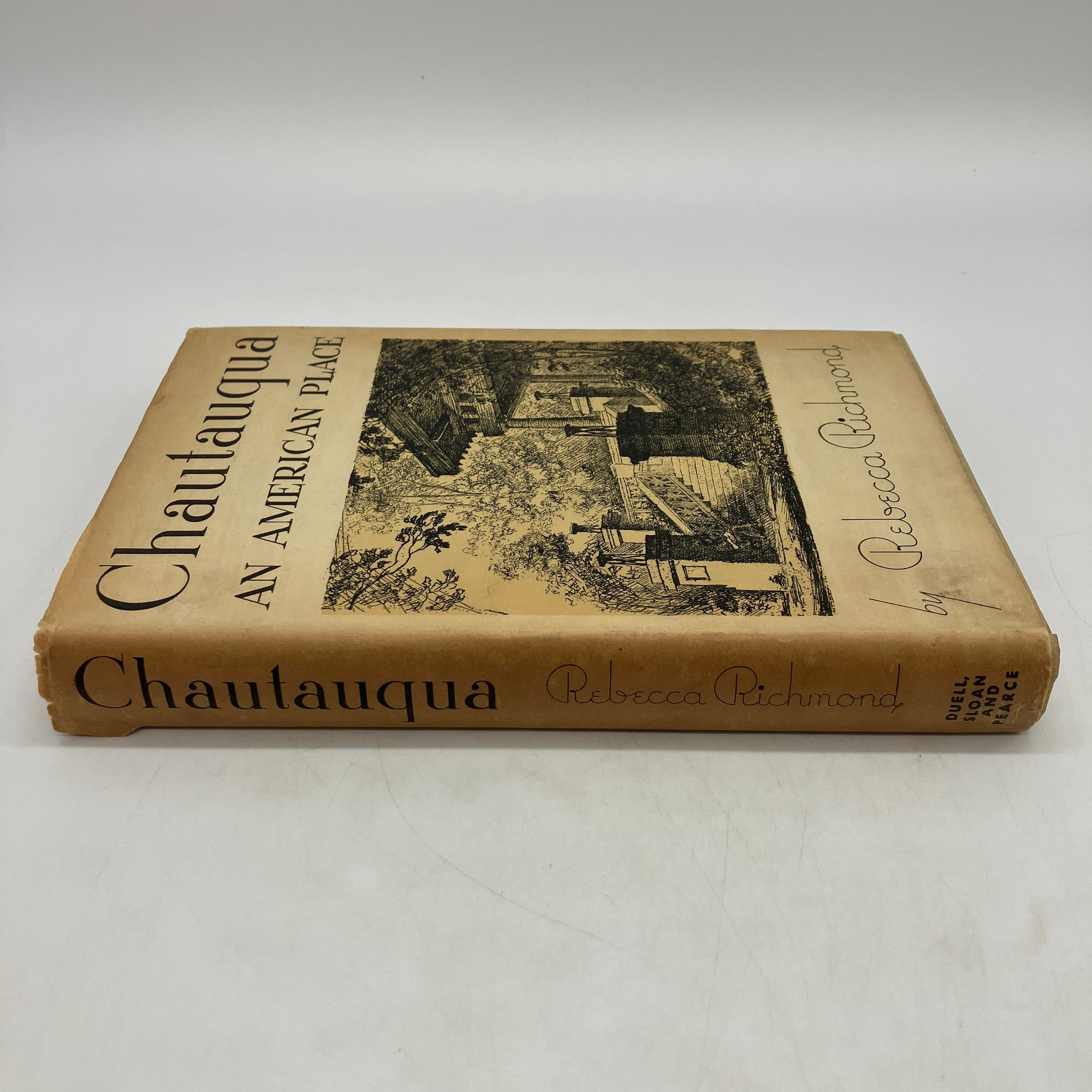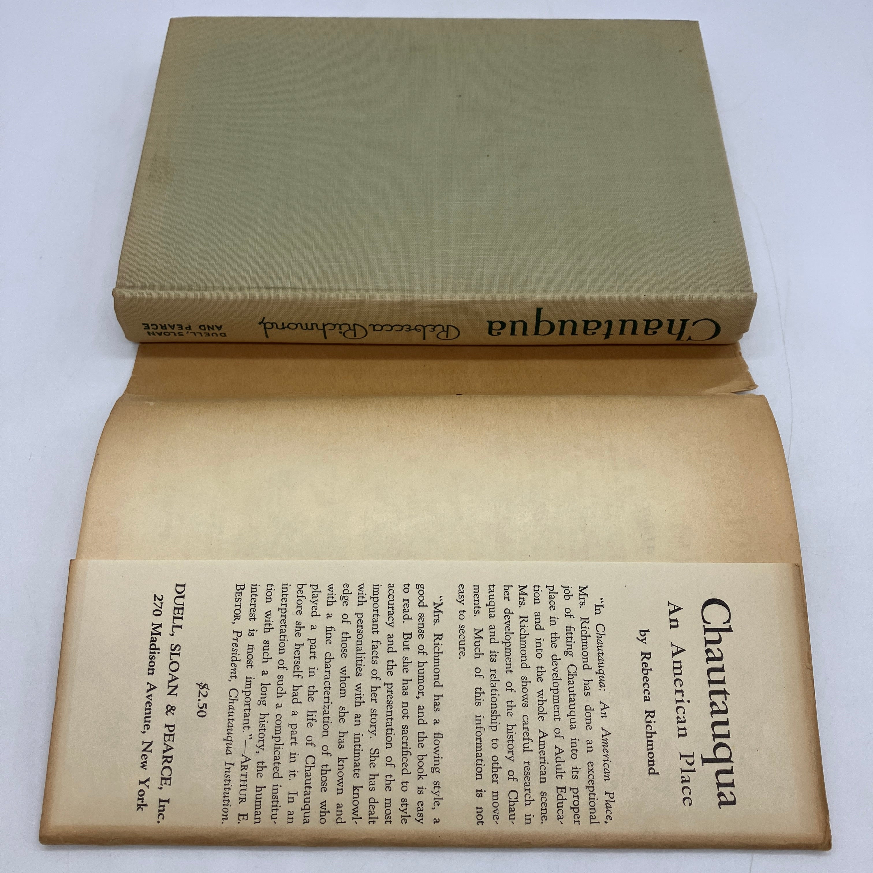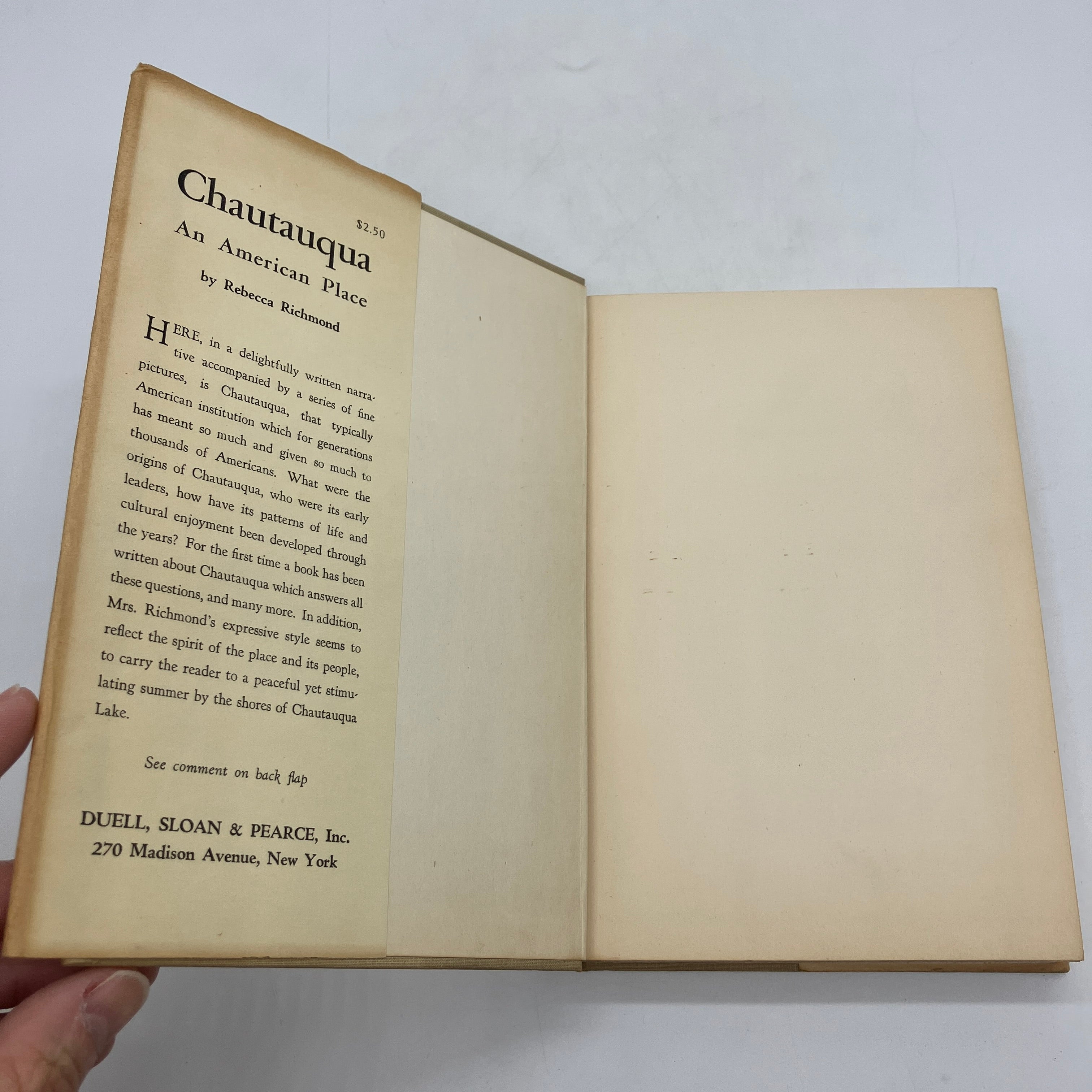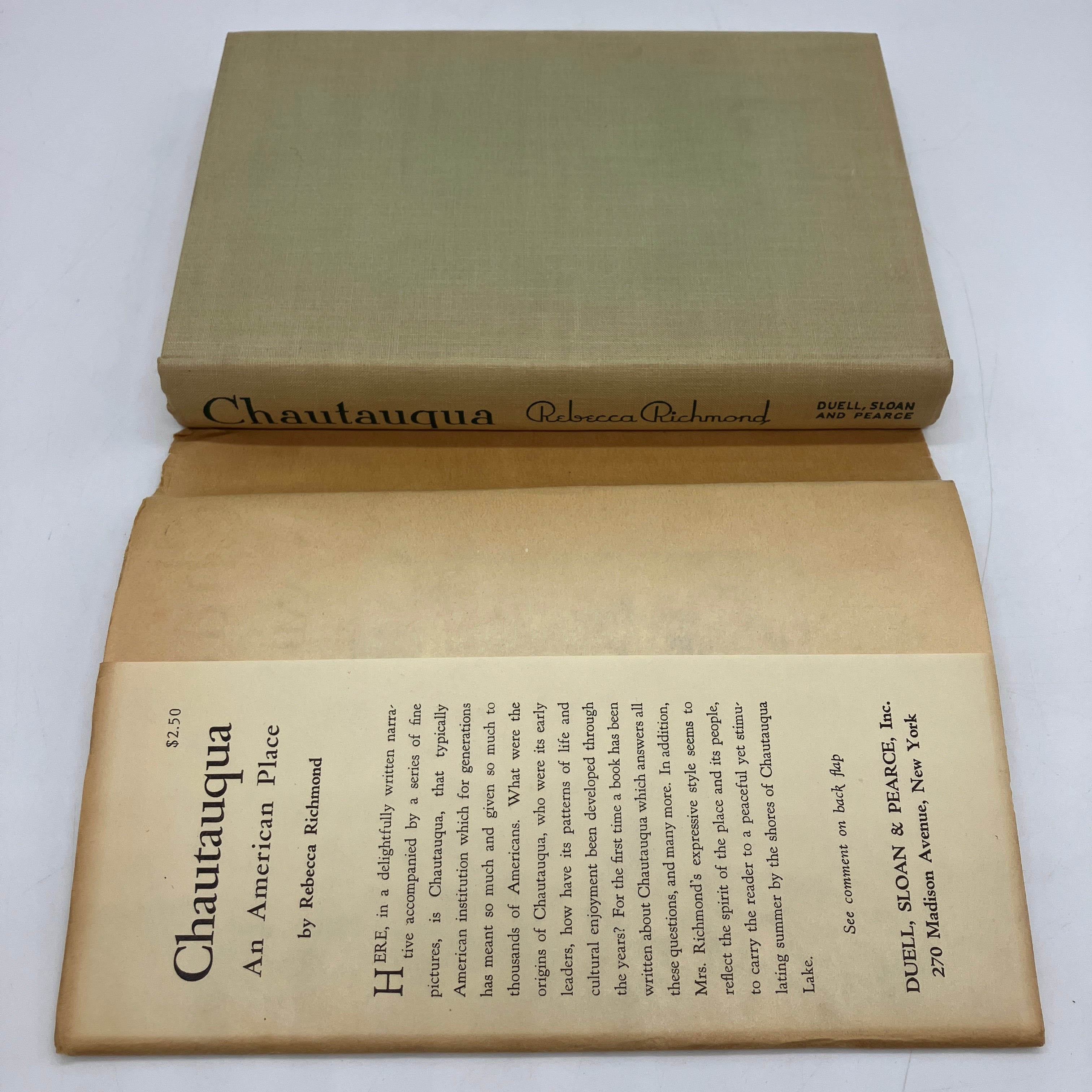 Duell, Sloan and Pearce, 1943. First edition cloth bound hardcover with dust jacket of Chautauqua: An American Place by Rebecca Richmond.