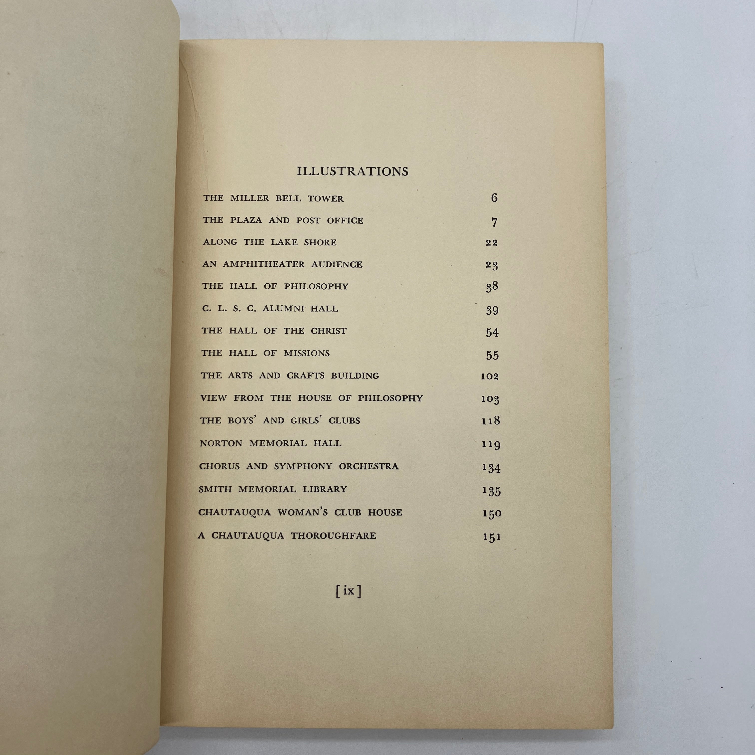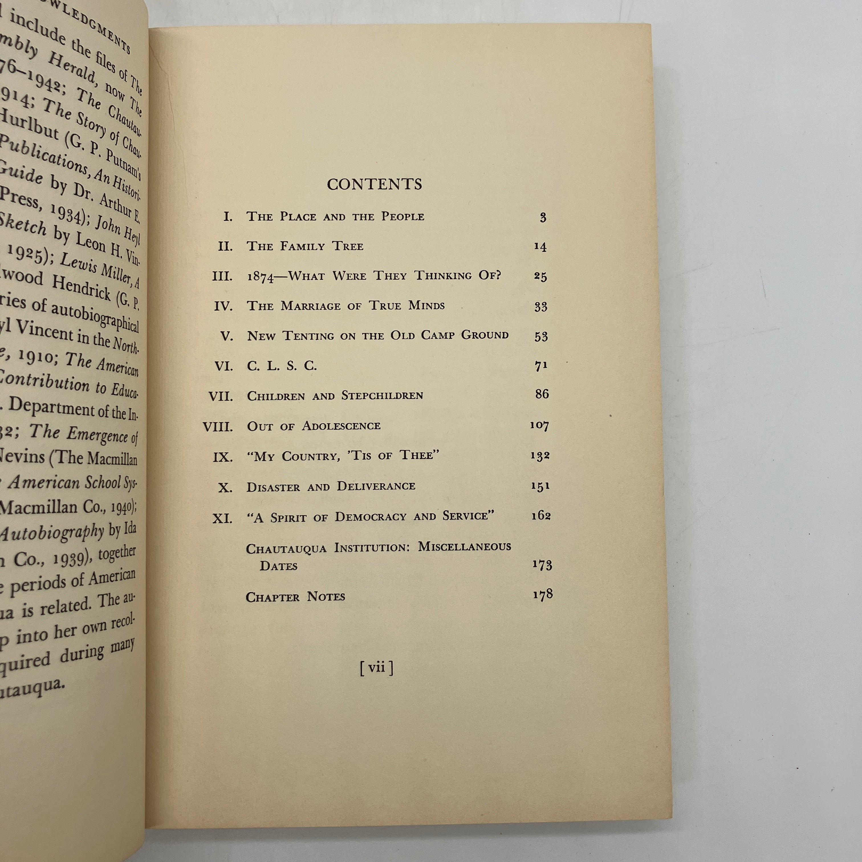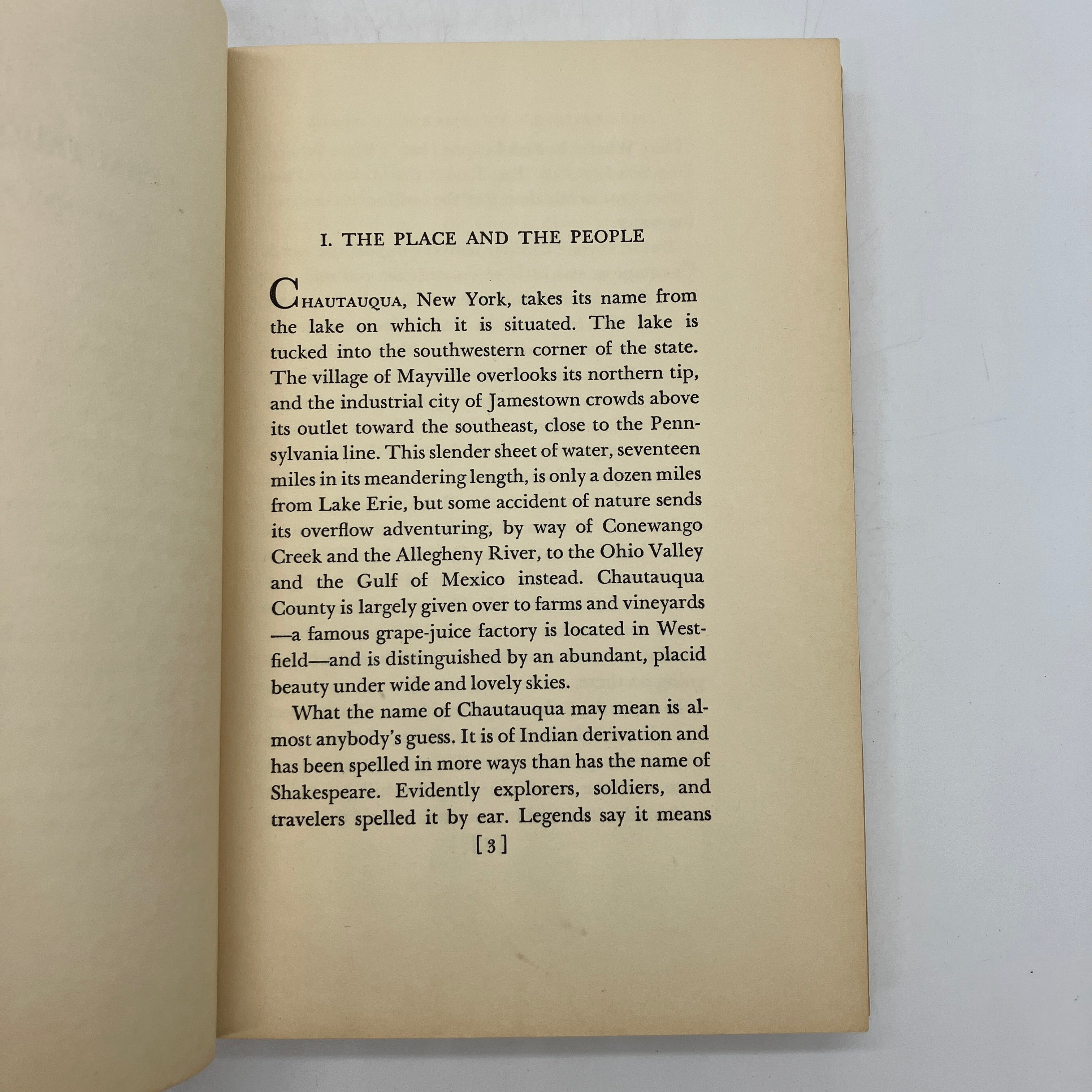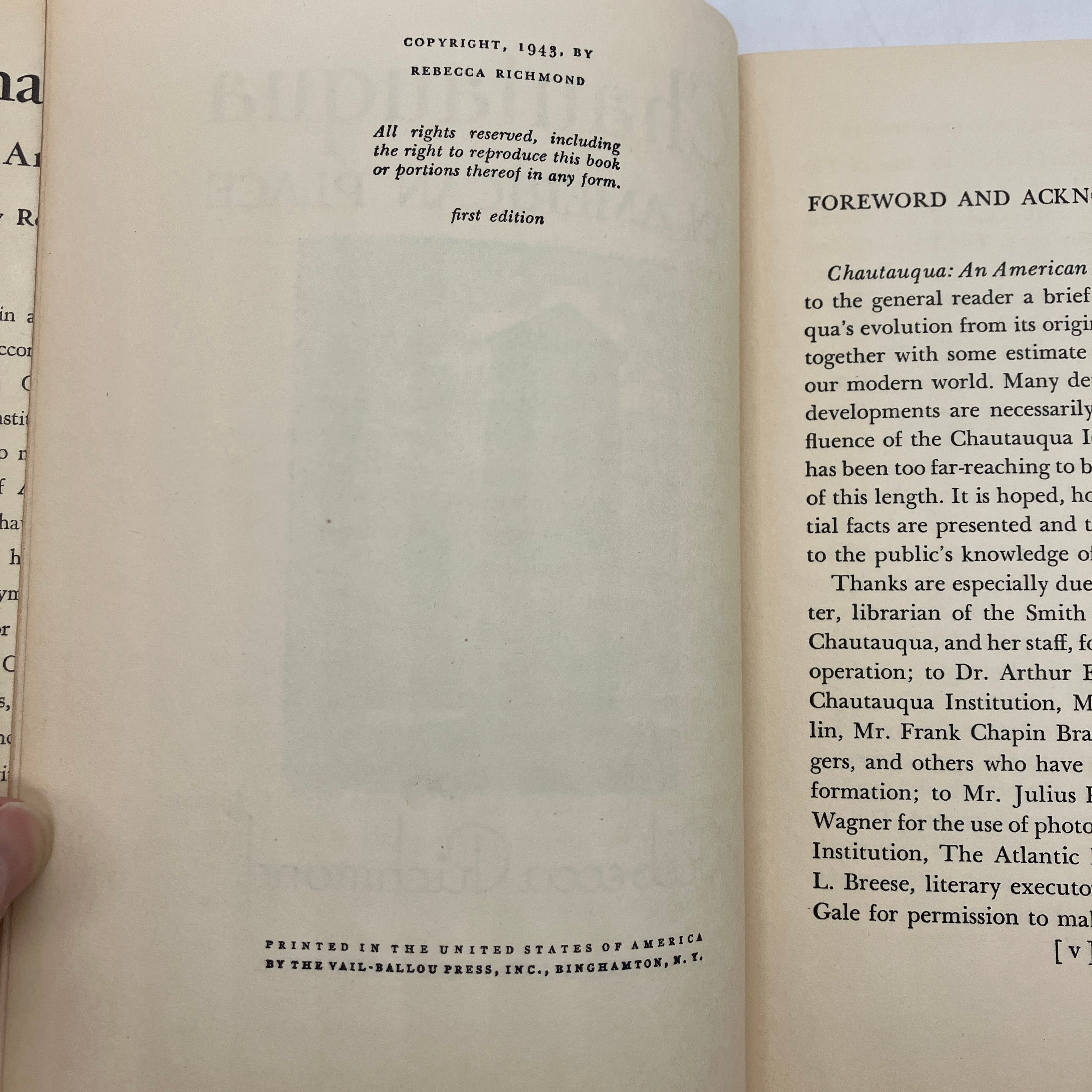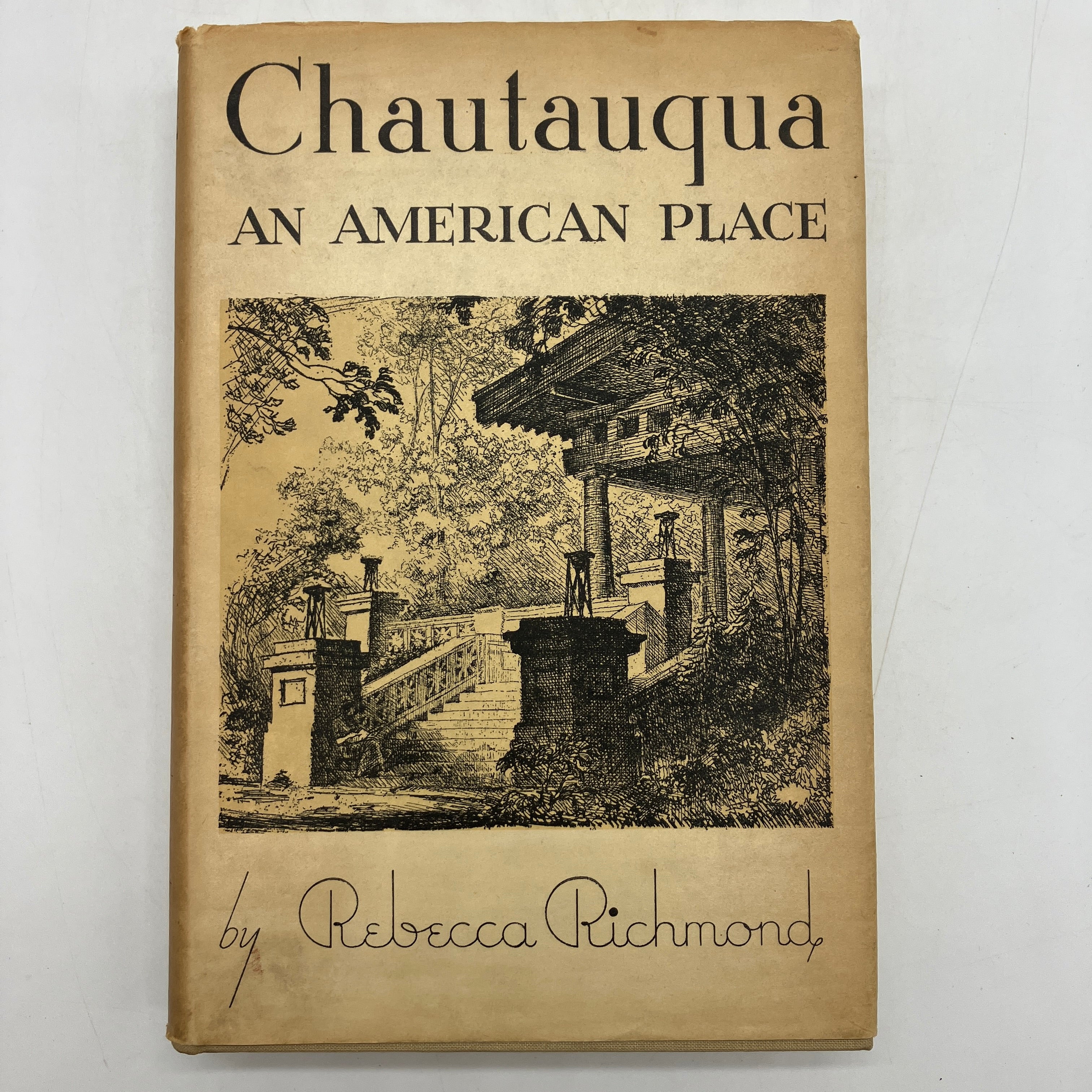 Duell, Sloan and Pearce, 1943. First edition cloth bound hardcover with dust jacket of Chautauqua: An American Place by Rebecca Richmond.
