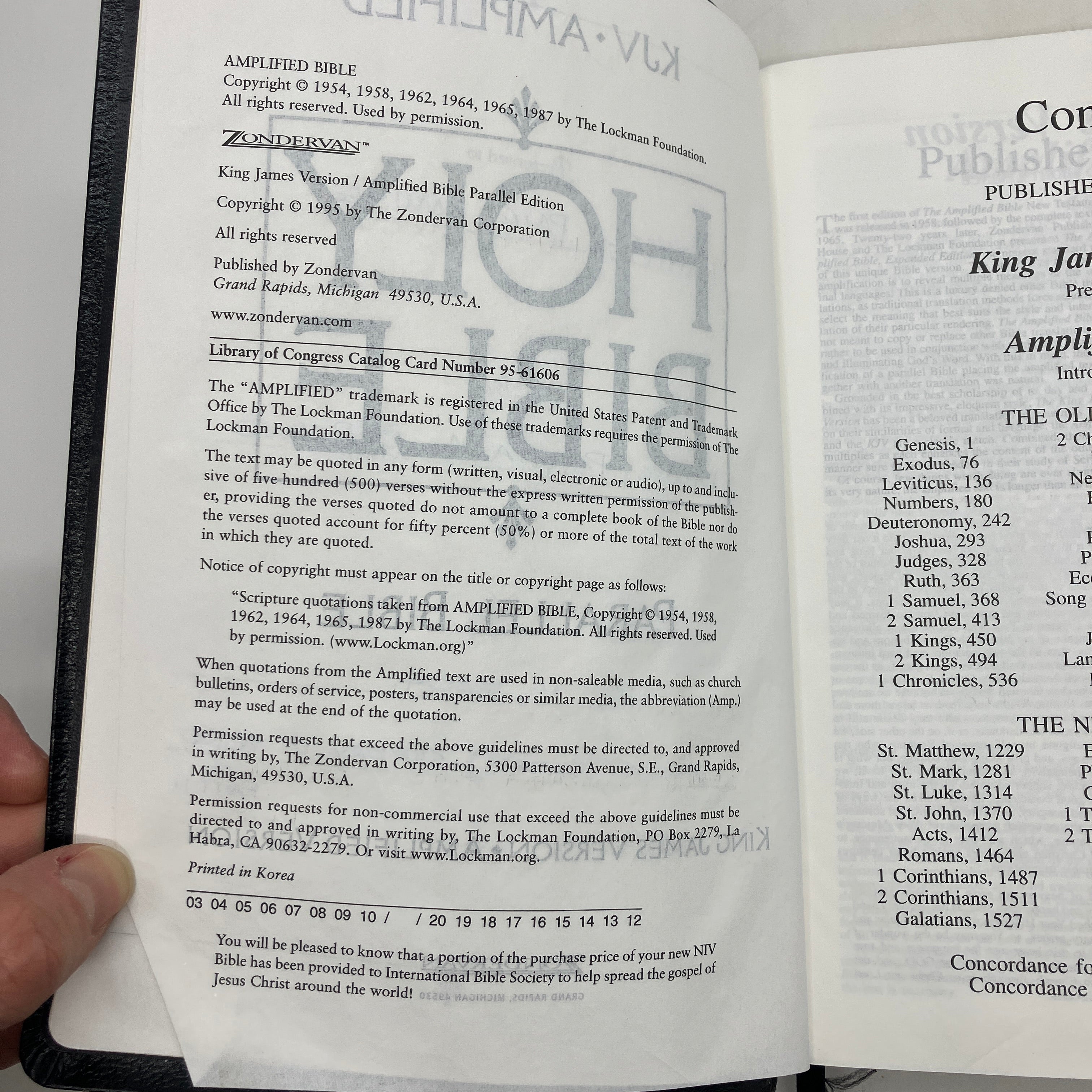 Zondervan, 1995. Flexibound leather hardcover of KJV Amplified Holy Bible Parallel Bible by Zondervan.