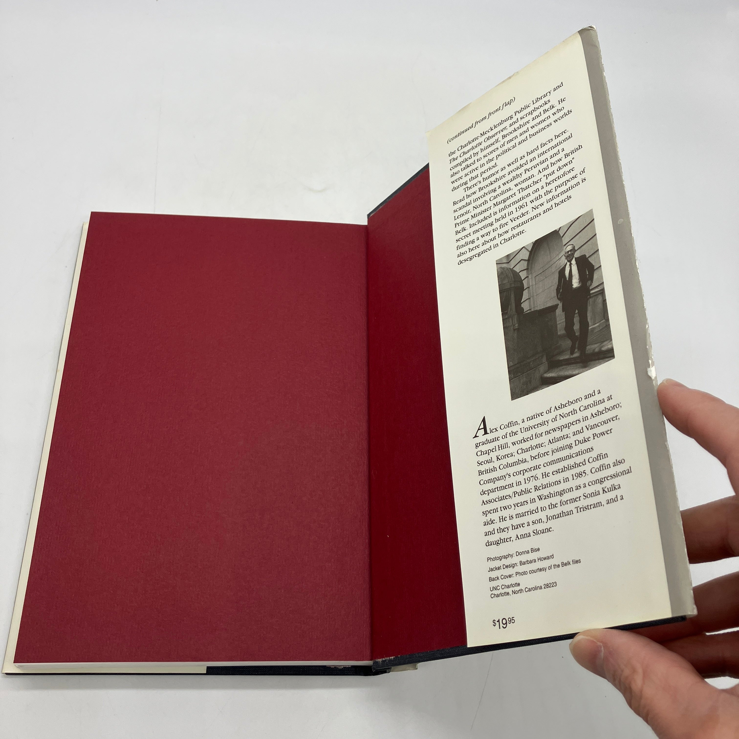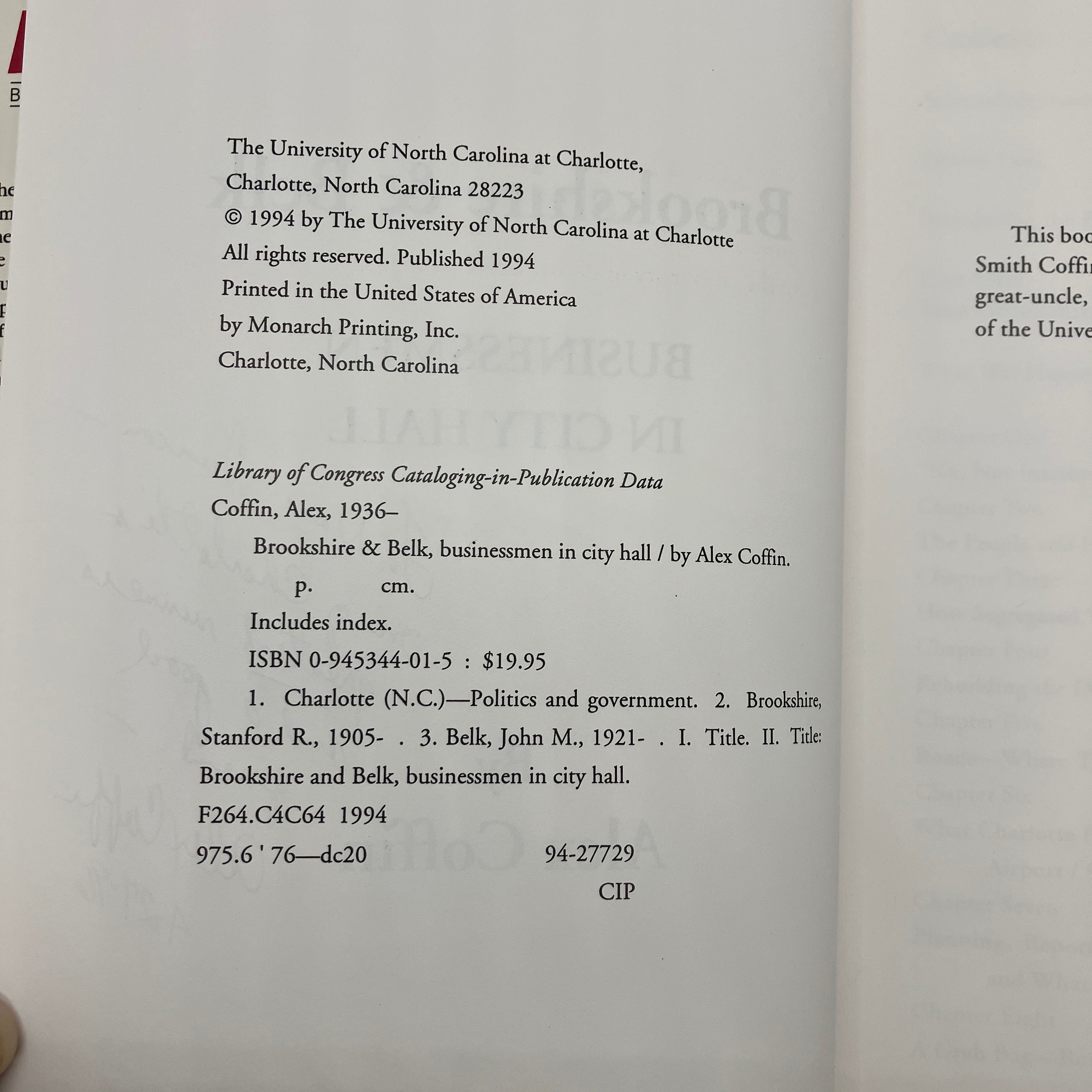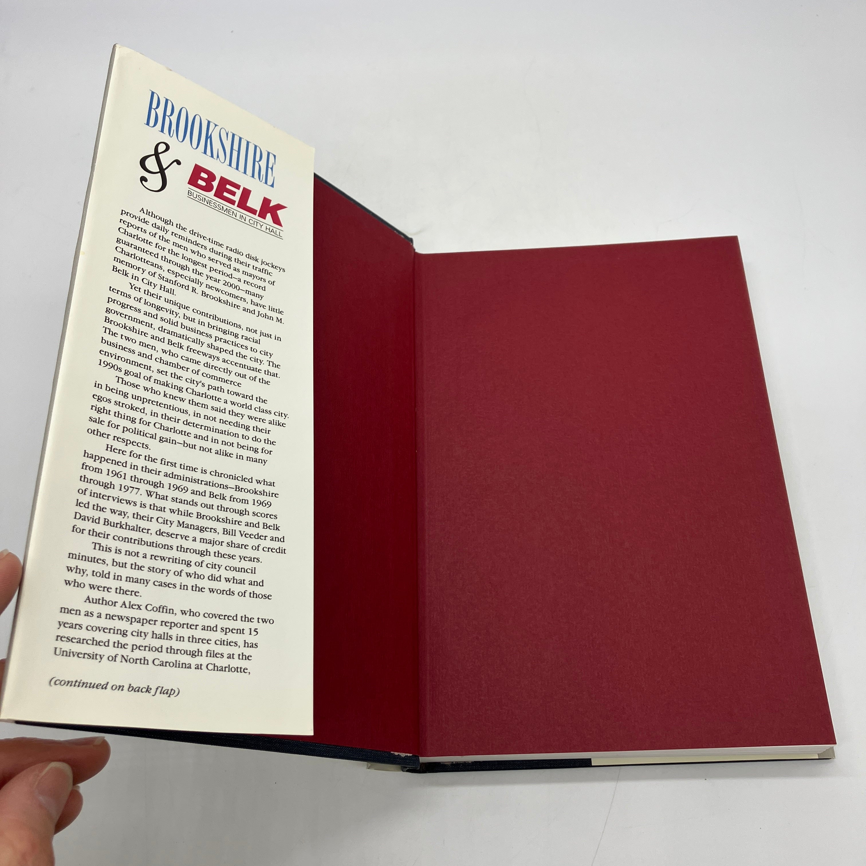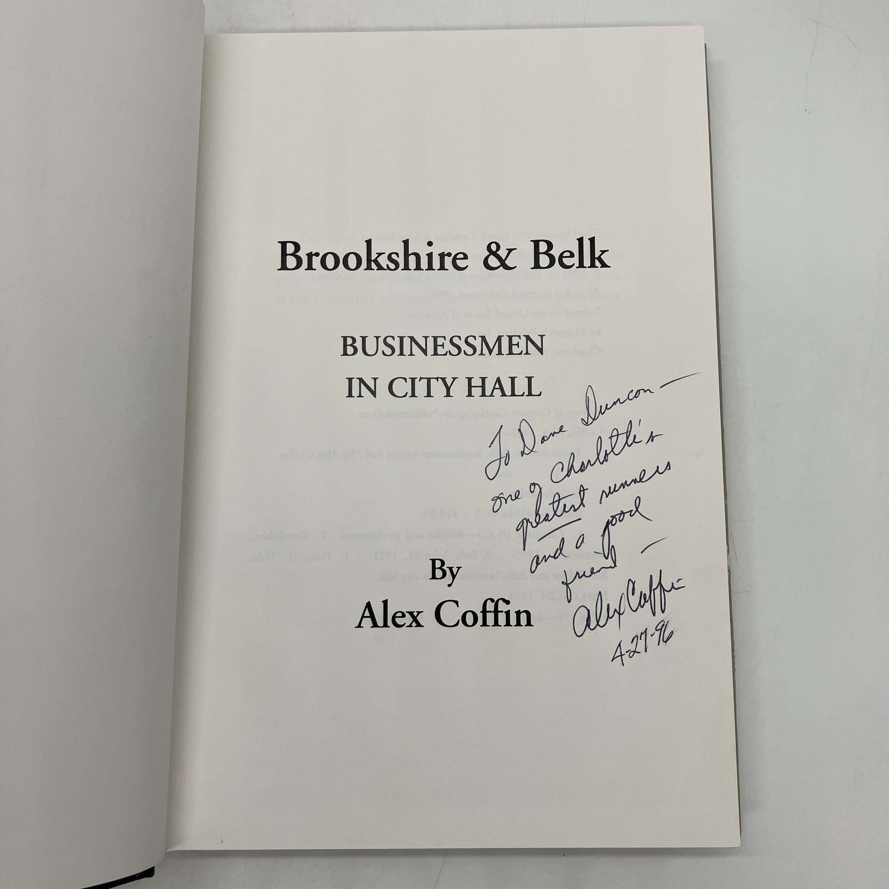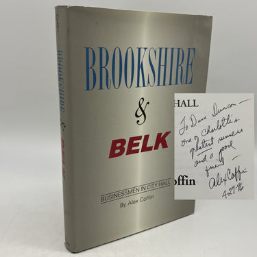 The University of North Carolina at Charlotte, 1994. Signed first edition cloth bound hardcover with dust jacket of Brookshire & Belk: Businessmen in City Hall by Alex Coffin.
